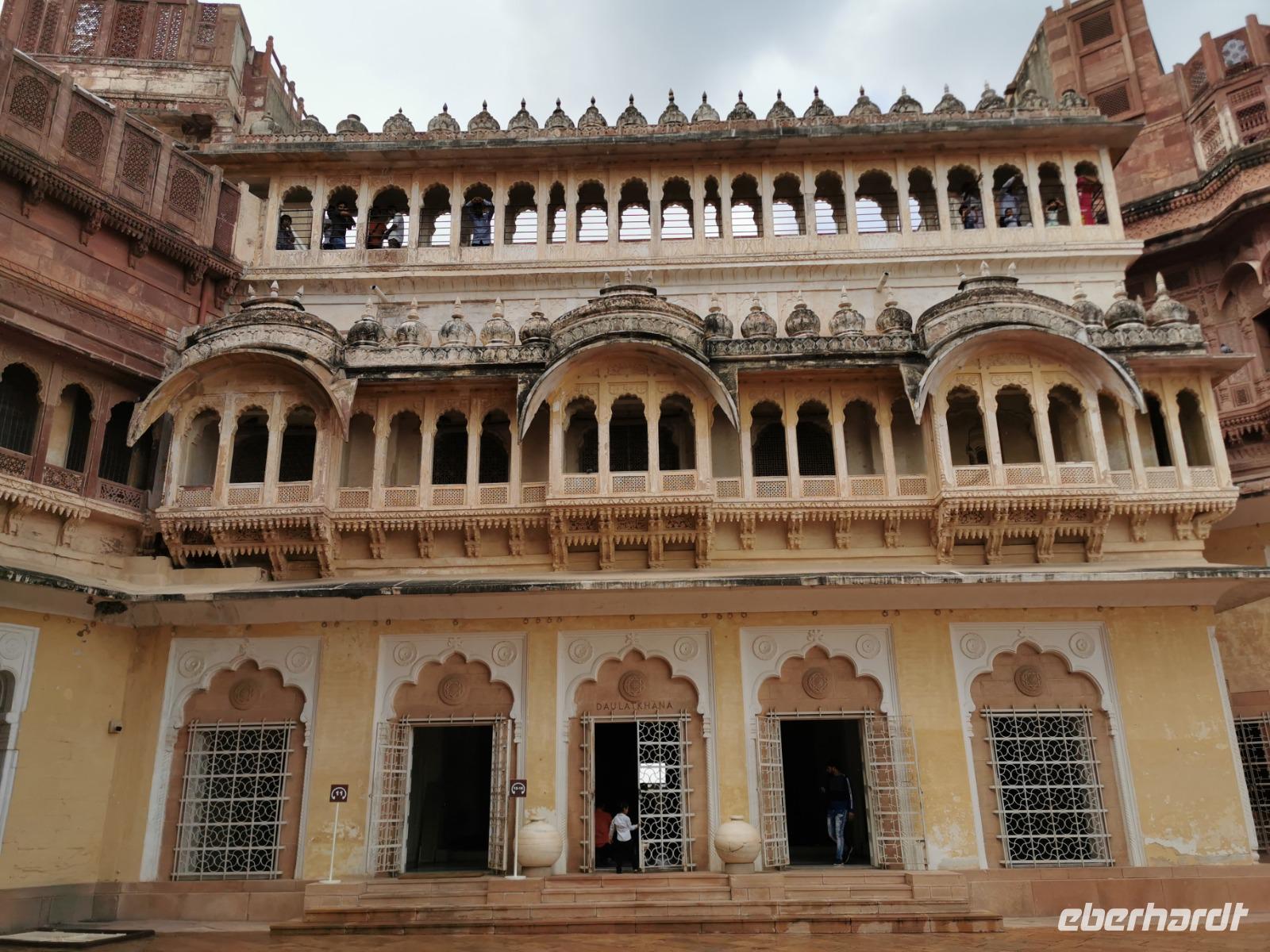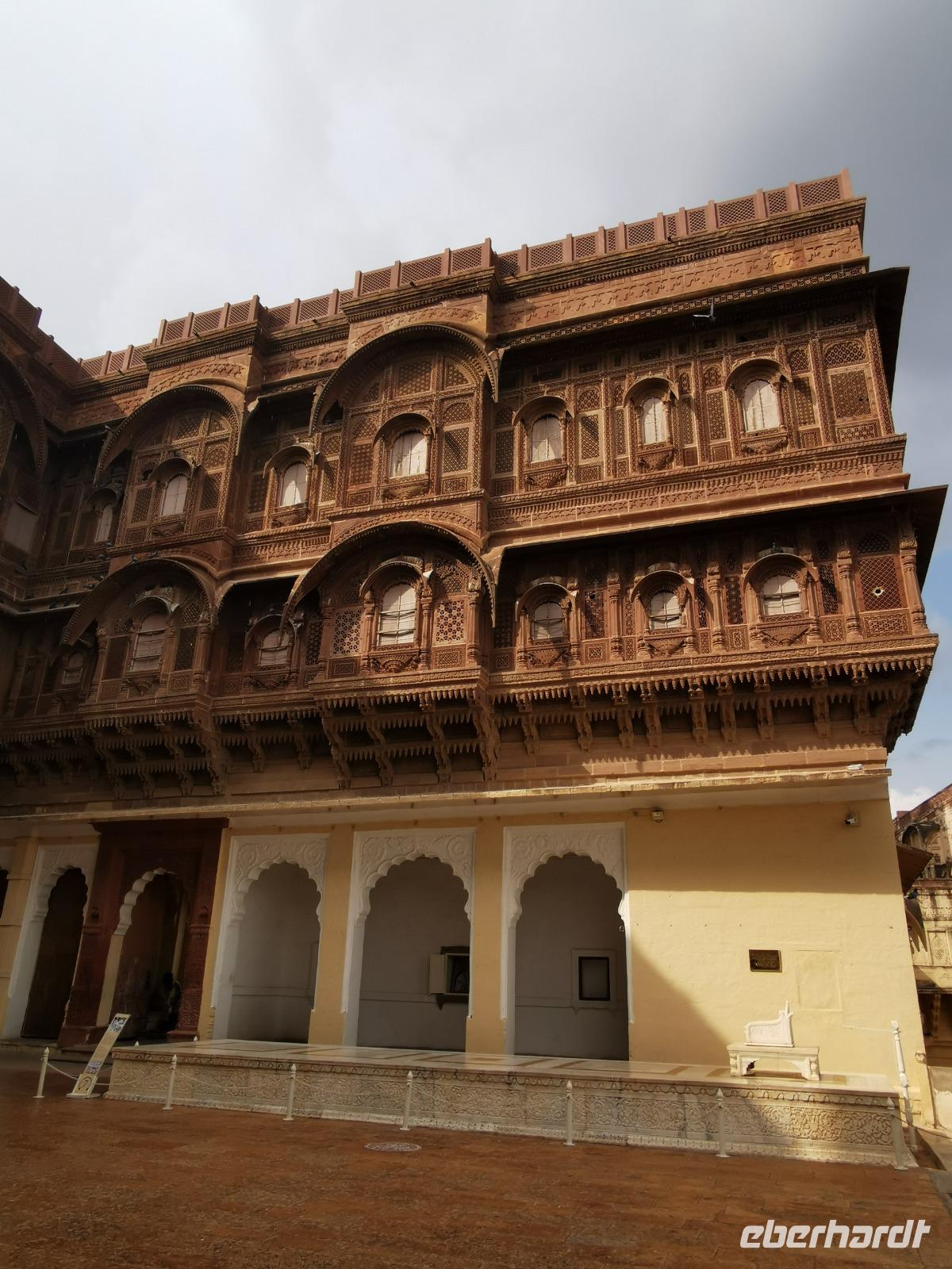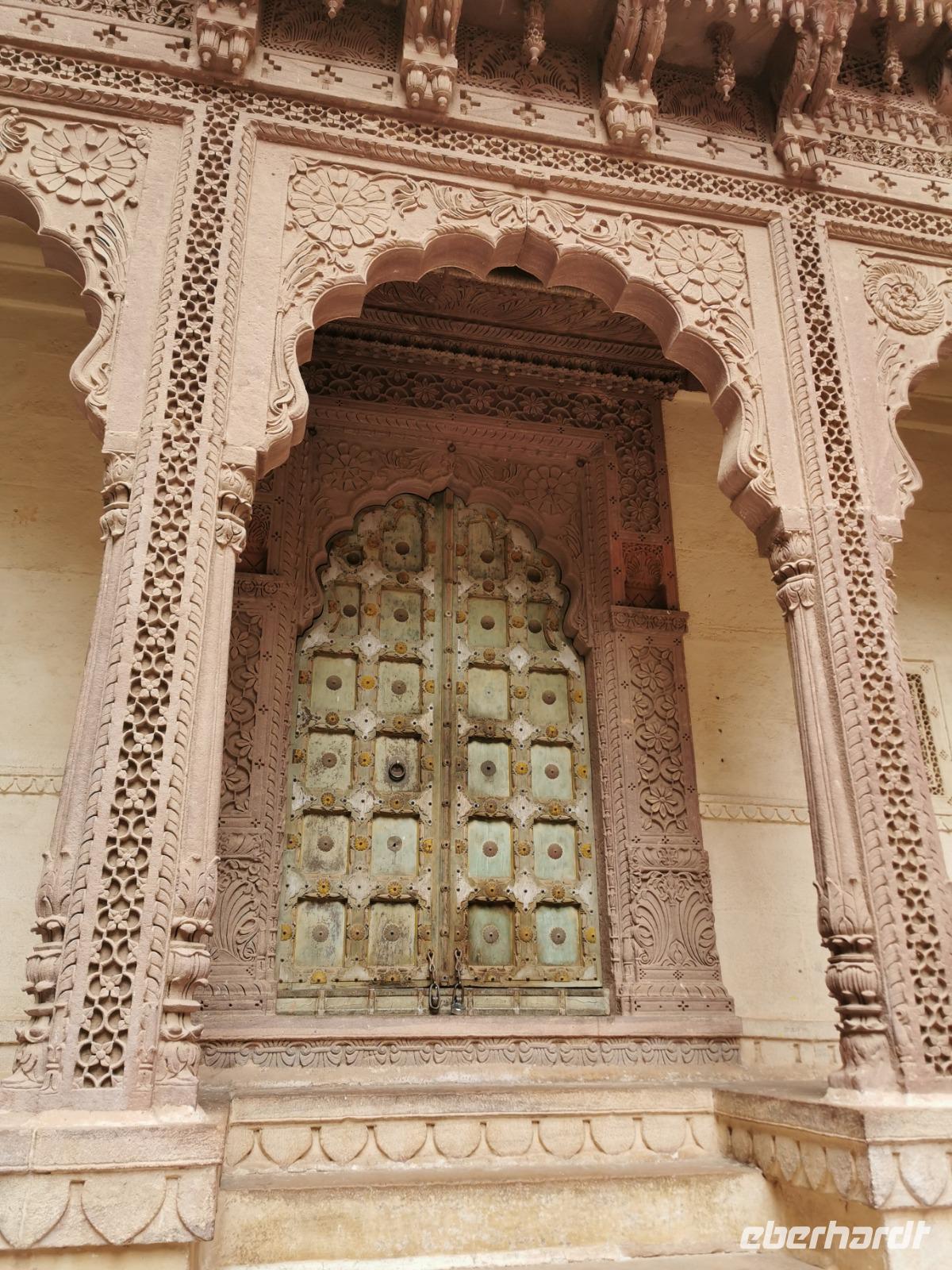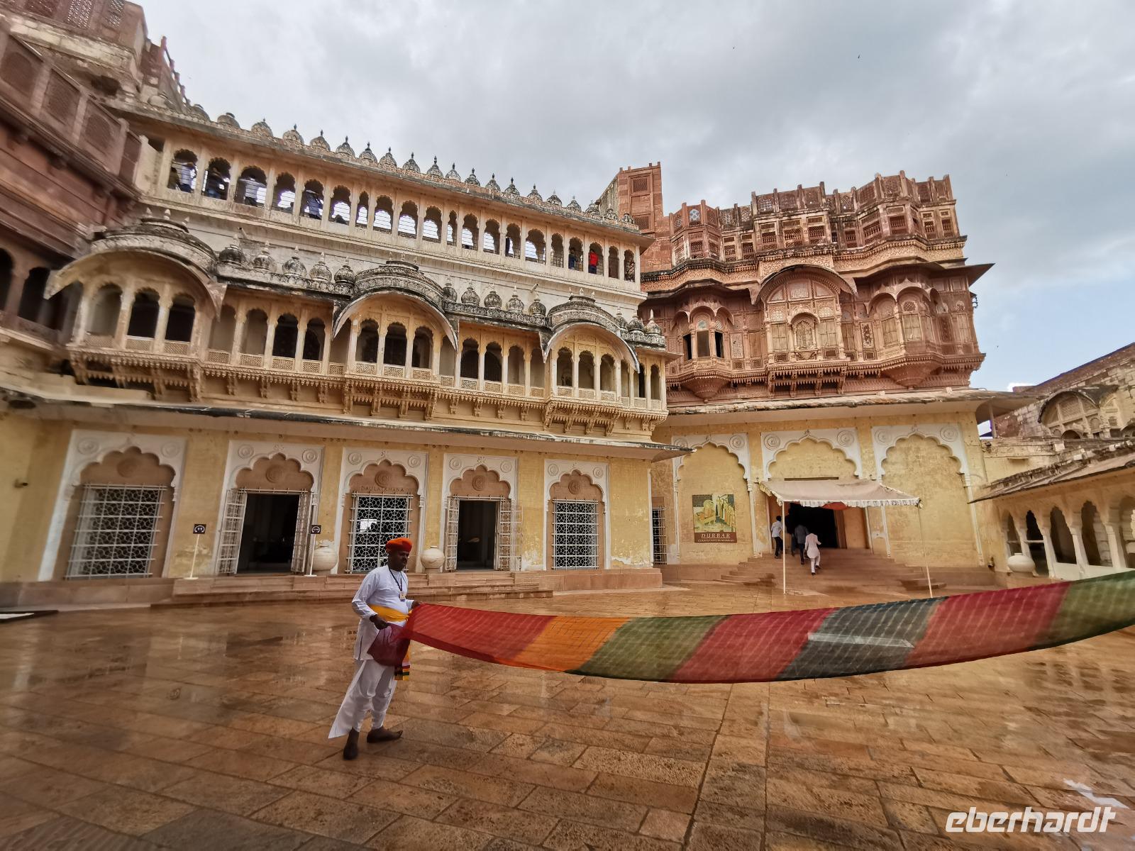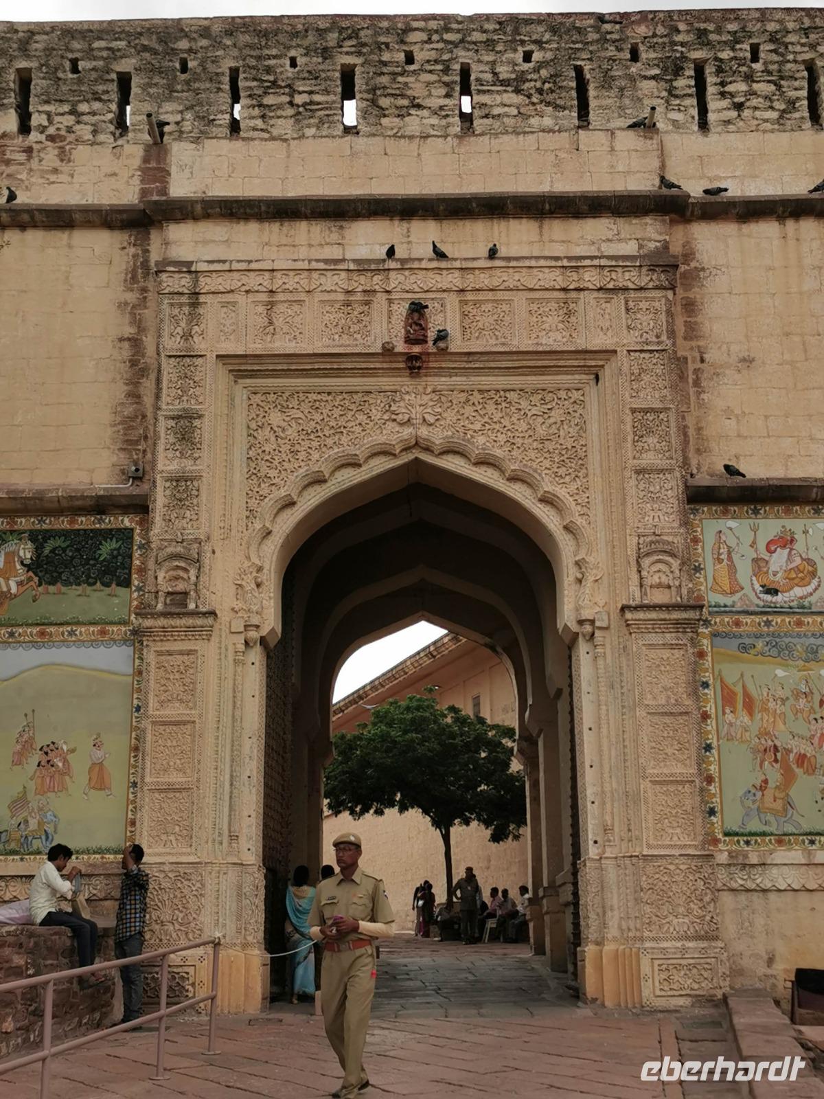 Die Festung Meherangarh thront 123 Meter über der Stadt auf einem Felsen und stammt aus dem Jahre 1459. Die heute zu besichtigenden Teile stammen aus der Periode des Maharaja Jaswant Singh, der von 1638 bis 1678 regierte.