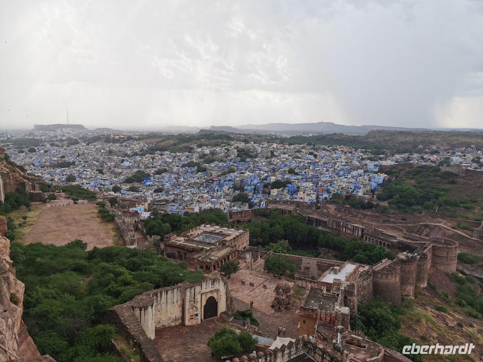 Da über 60 Prozent der Häuser außen blau angestrichen sind, nennt man Jodhpur auch die blaue Stadt und wenn man sie von der Festung Meherangarh aus betrachtet, blickt man auf ein Meer aus Blau. Die Einwohner sagen, diese Farbe wehre am besten die Mücken ab.