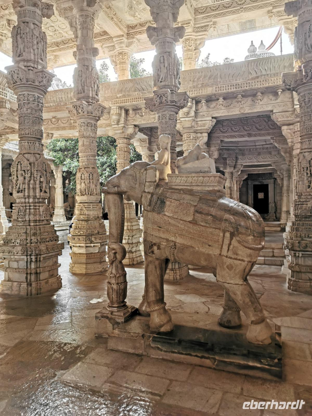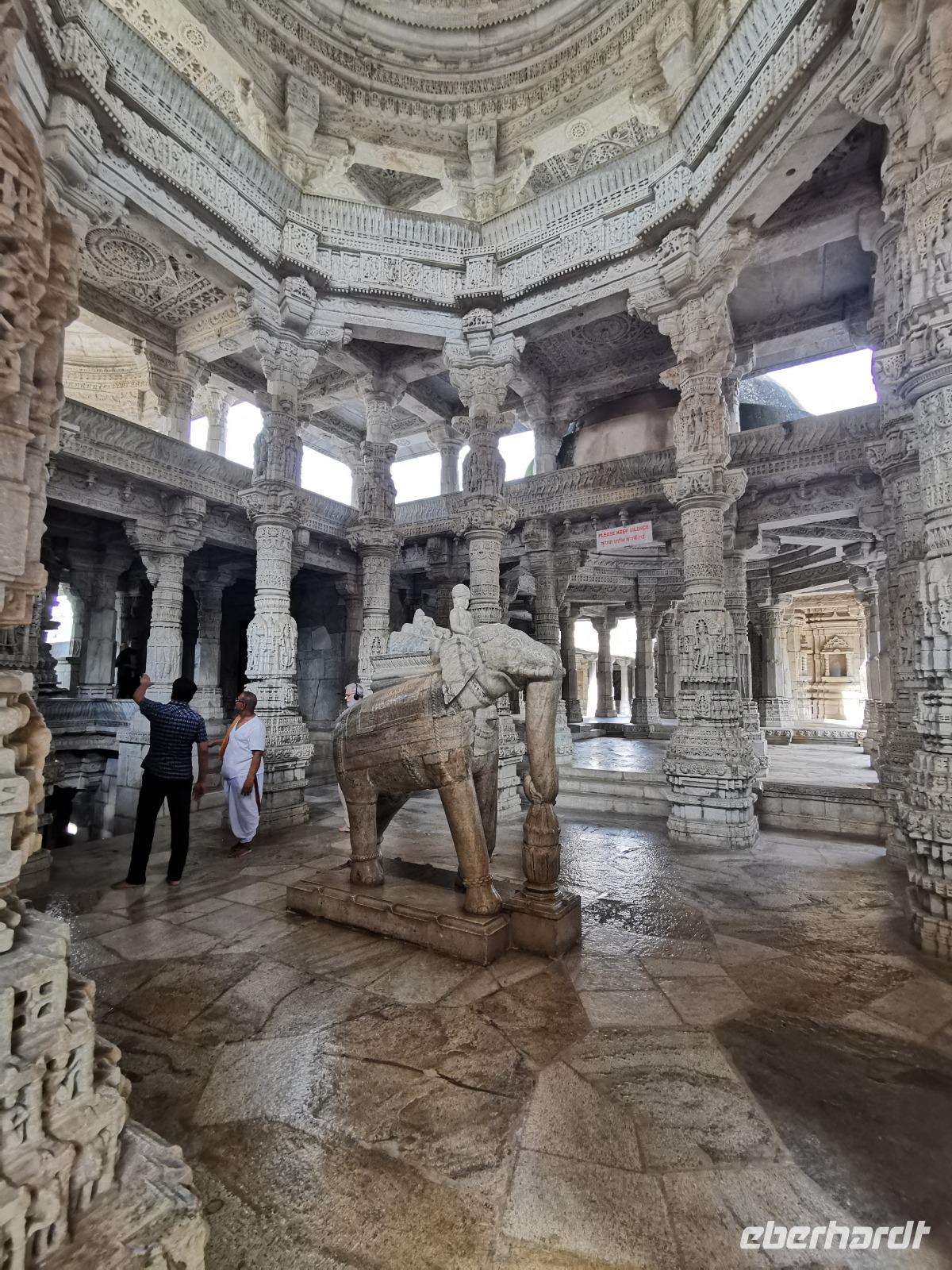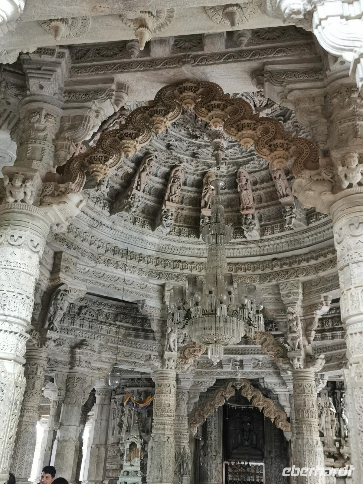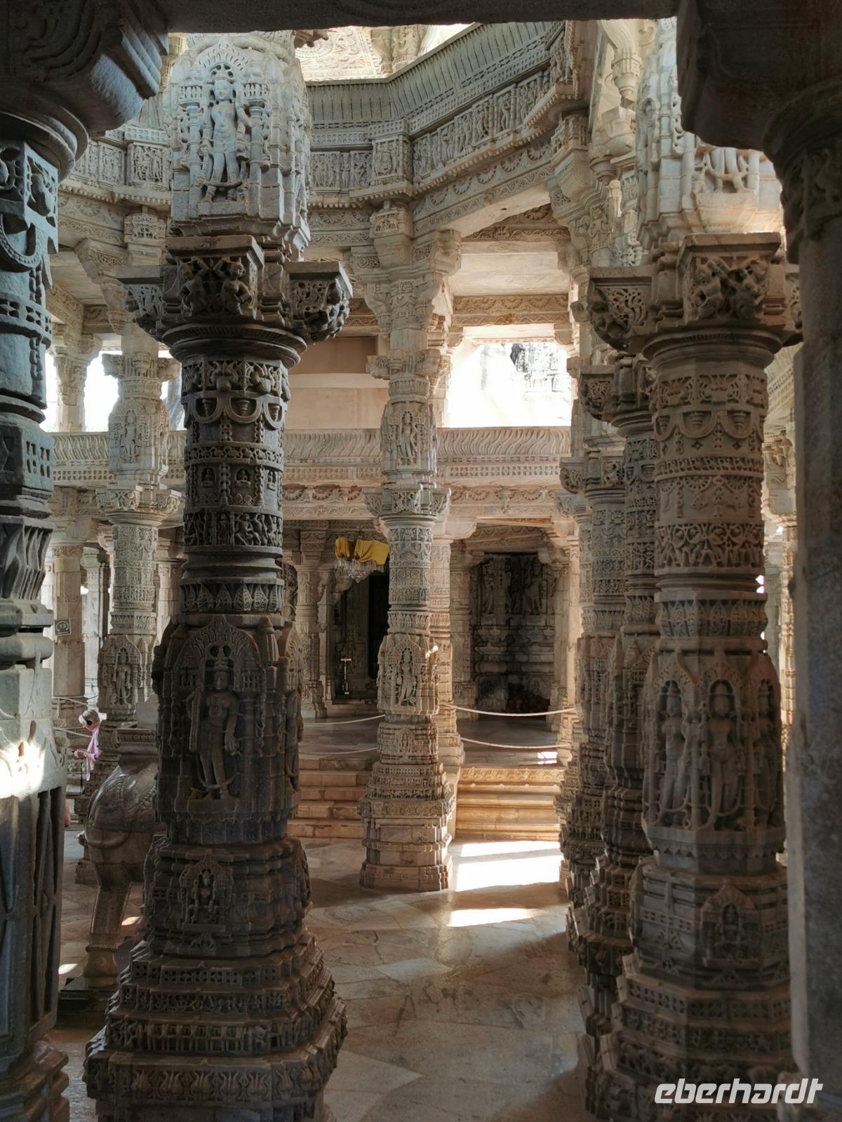 In diesem Tempel ist der zentrale Raum zu den Vorhallen nach allen Seiten offen und lichtdurchflutet. Die Jainas verehren keinen Gott, sie beten vor den sogenannten Tirthankaras. Dies sind figürliche Darstellungen, die für einen Jain Vorbildfunktion haben, da sie bereits die von allen Jainas angestrebte Vollkommenheit erreicht haben. Im Gegensatz zum hinduistischen Glauben braucht es für ein Ritual bei den Jainas keinen Brahmanen, der mit den Betenden die Rituale vollzieht. Die Gläubigen umschreiten den Kultraum mit dem Bildnis drei Mal. Diese drei Mal entsprechen den drei Juwelen, den drei Säulen also, auf denen der Jainismus fußt: die rechte Wahrnehmung, das rechte Wissen und die rechte Lebensweise.