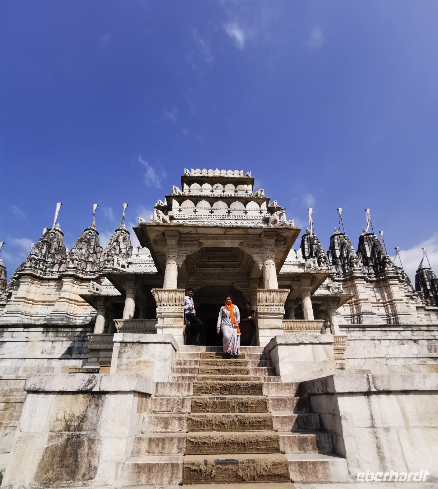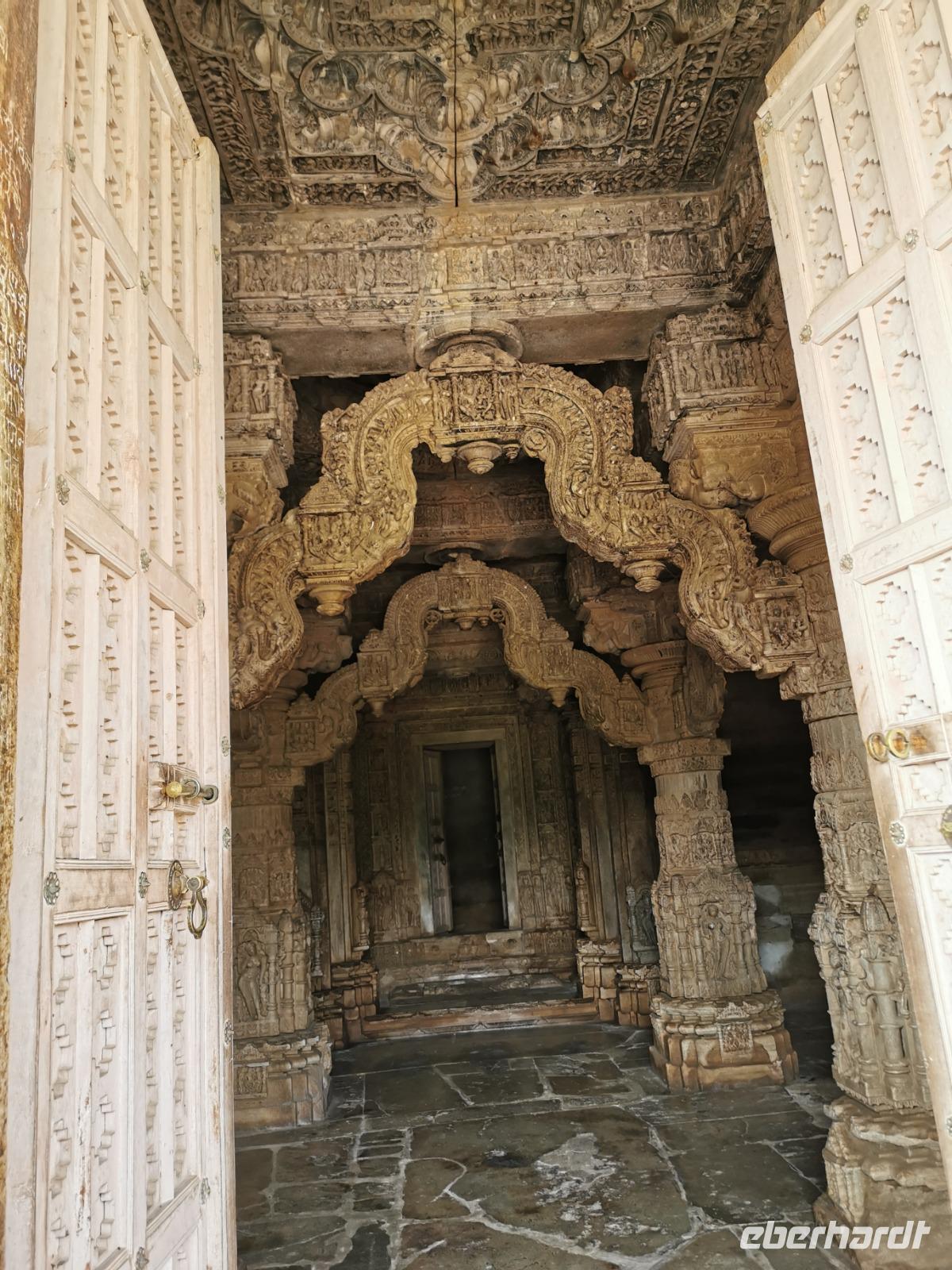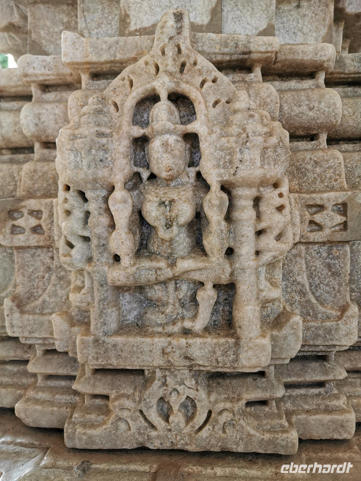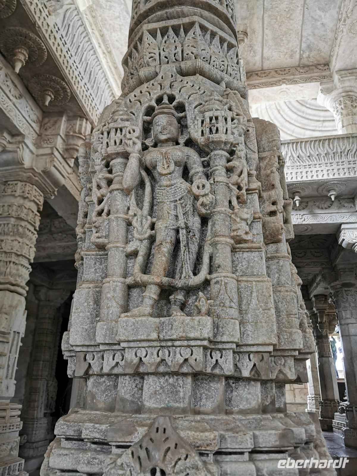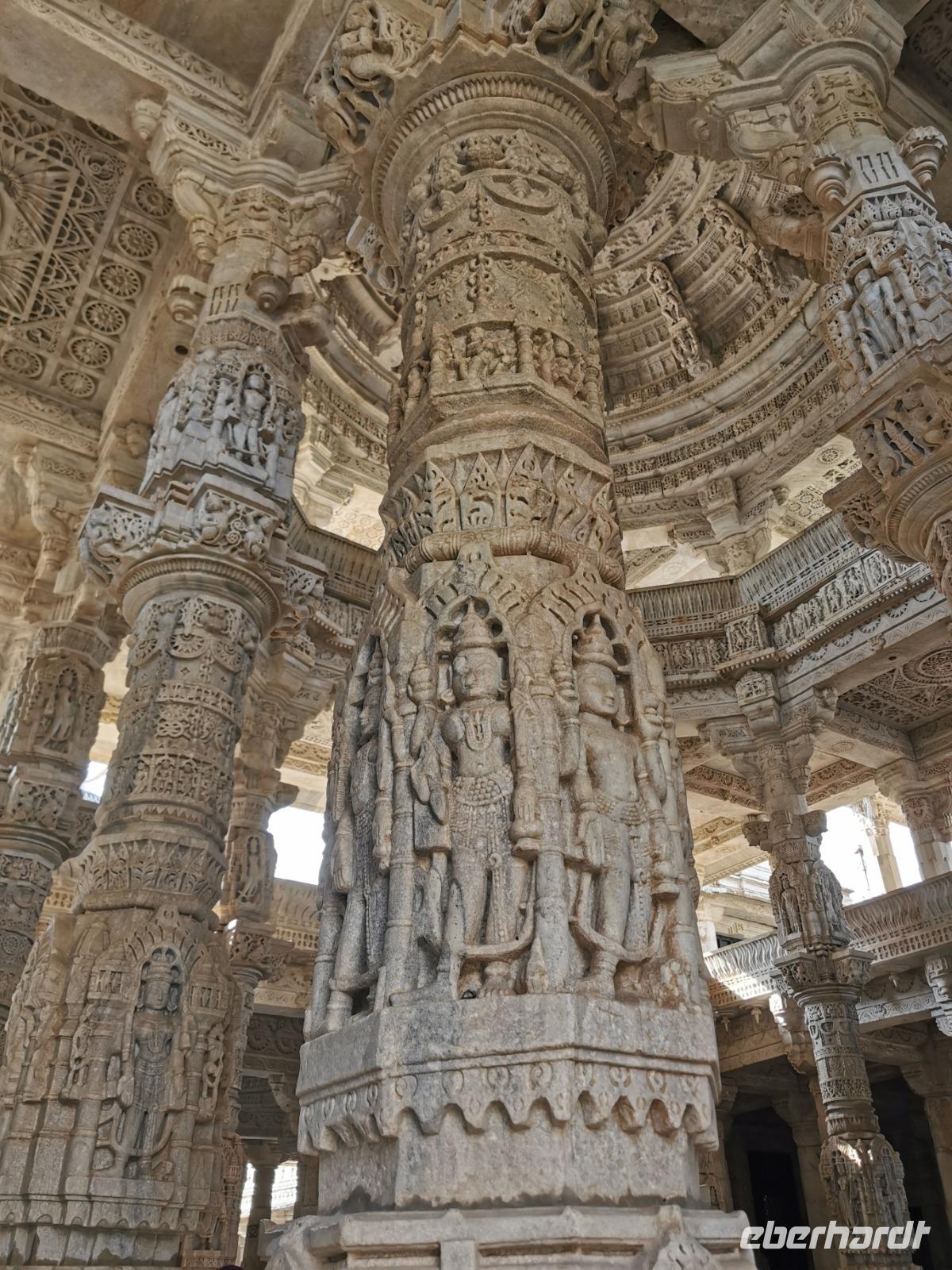 In diesem Tempel ist der zentrale Raum zu den Vorhallen nach allen Seiten offen und lichtdurchflutet. Die Jainas verehren keinen Gott, sie beten vor den sogenannten Tirthankaras. Dies sind figürliche Darstellungen, die für einen Jain Vorbildfunktion haben, da sie bereits die von allen Jainas angestrebte Vollkommenheit erreicht haben. Im Gegensatz zum hinduistischen Glauben braucht es für ein Ritual bei den Jainas keinen Brahmanen, der mit den Betenden die Rituale vollzieht. Die Gläubigen umschreiten den Kultraum mit dem Bildnis drei Mal. Diese drei Mal entsprechen den drei Juwelen, den drei Säulen also, auf denen der Jainismus fußt: die rechte Wahrnehmung, das rechte Wissen und die rechte Lebensweise.
