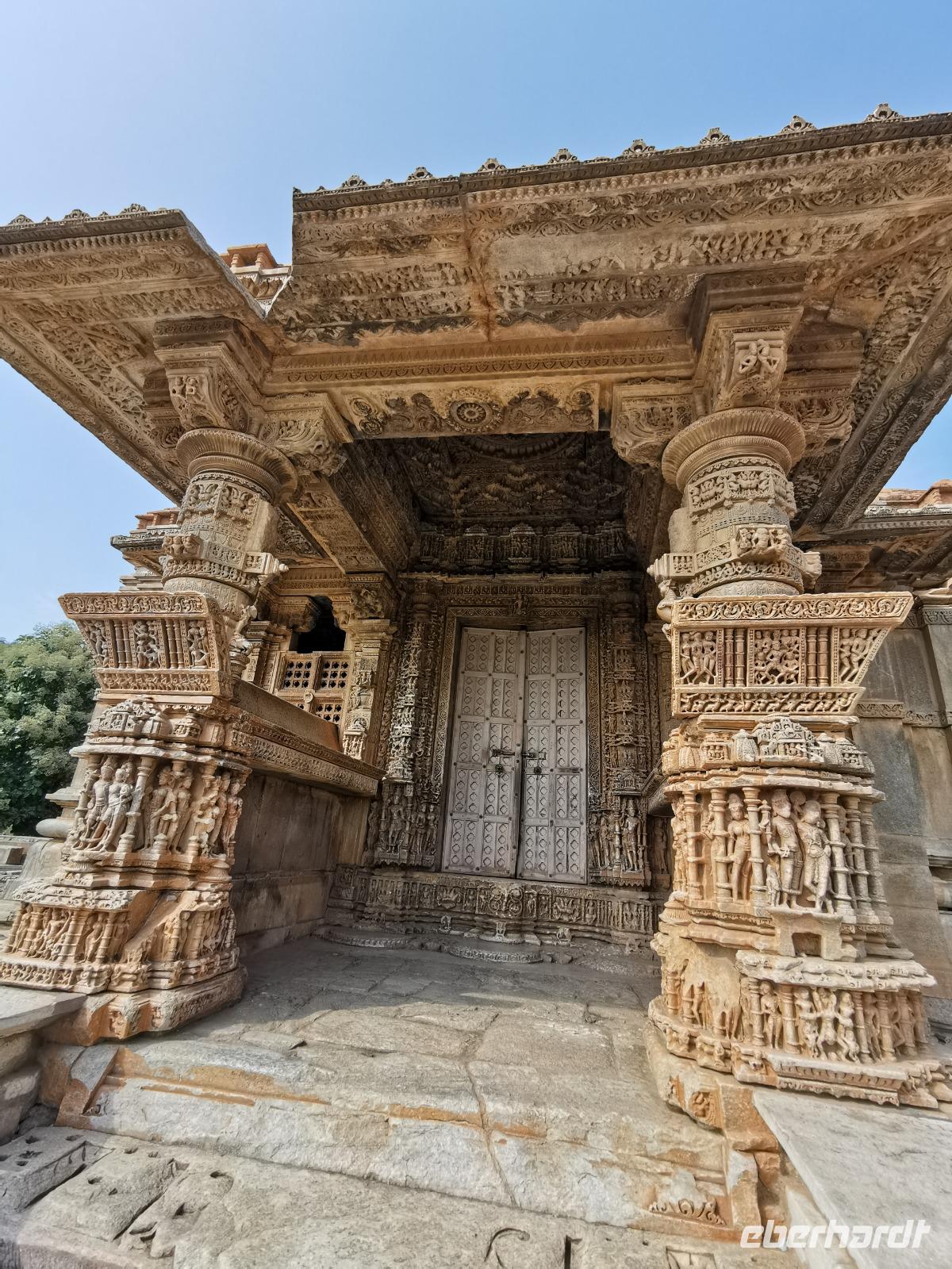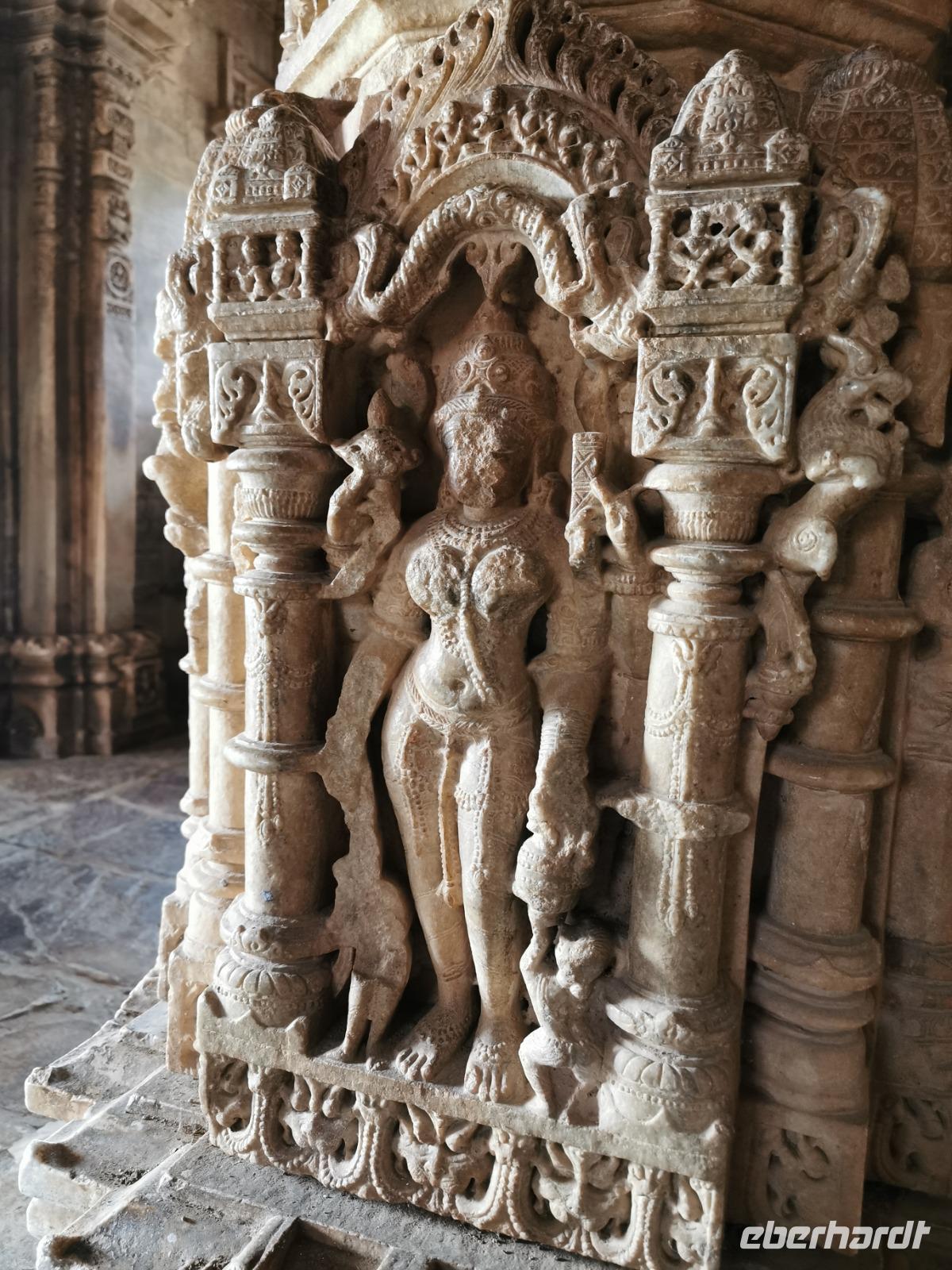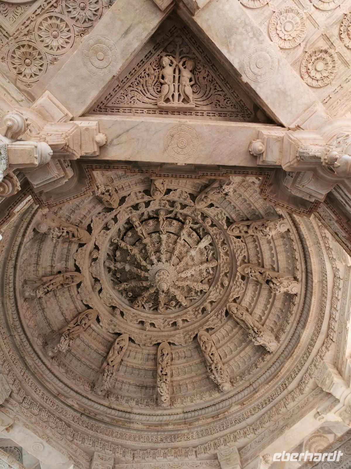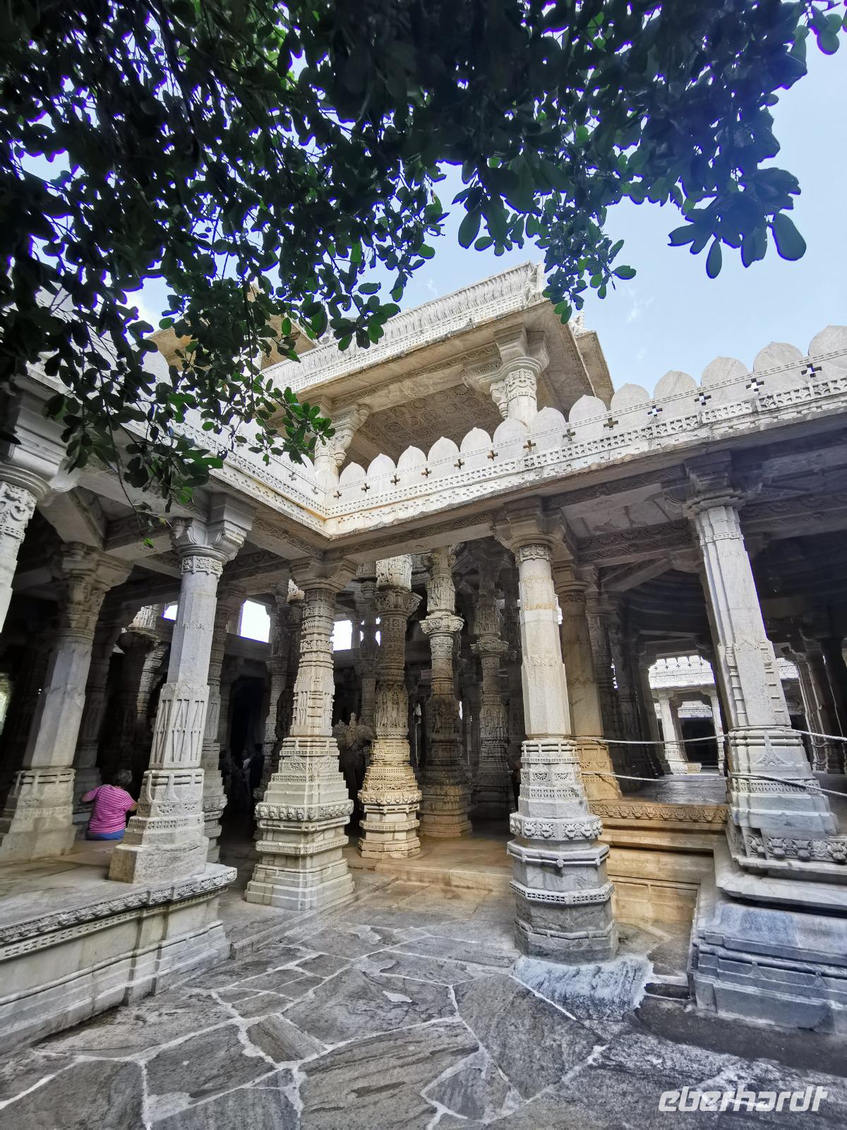 In diesem Tempel ist der zentrale Raum zu den Vorhallen nach allen Seiten offen und lichtdurchflutet. Die Jainas verehren keinen Gott, sie beten vor den sogenannten Tirthankaras. Dies sind figürliche Darstellungen, die für einen Jain Vorbildfunktion haben, da sie bereits die von allen Jainas angestrebte Vollkommenheit erreicht haben. Im Gegensatz zum hinduistischen Glauben braucht es für ein Ritual bei den Jainas keinen Brahmanen, der mit den Betenden die Rituale vollzieht. Die Gläubigen umschreiten den Kultraum mit dem Bildnis drei Mal. Diese drei Mal entsprechen den drei Juwelen, den drei Säulen also, auf denen der Jainismus fußt: die rechte Wahrnehmung, das rechte Wissen und die rechte Lebensweise.
