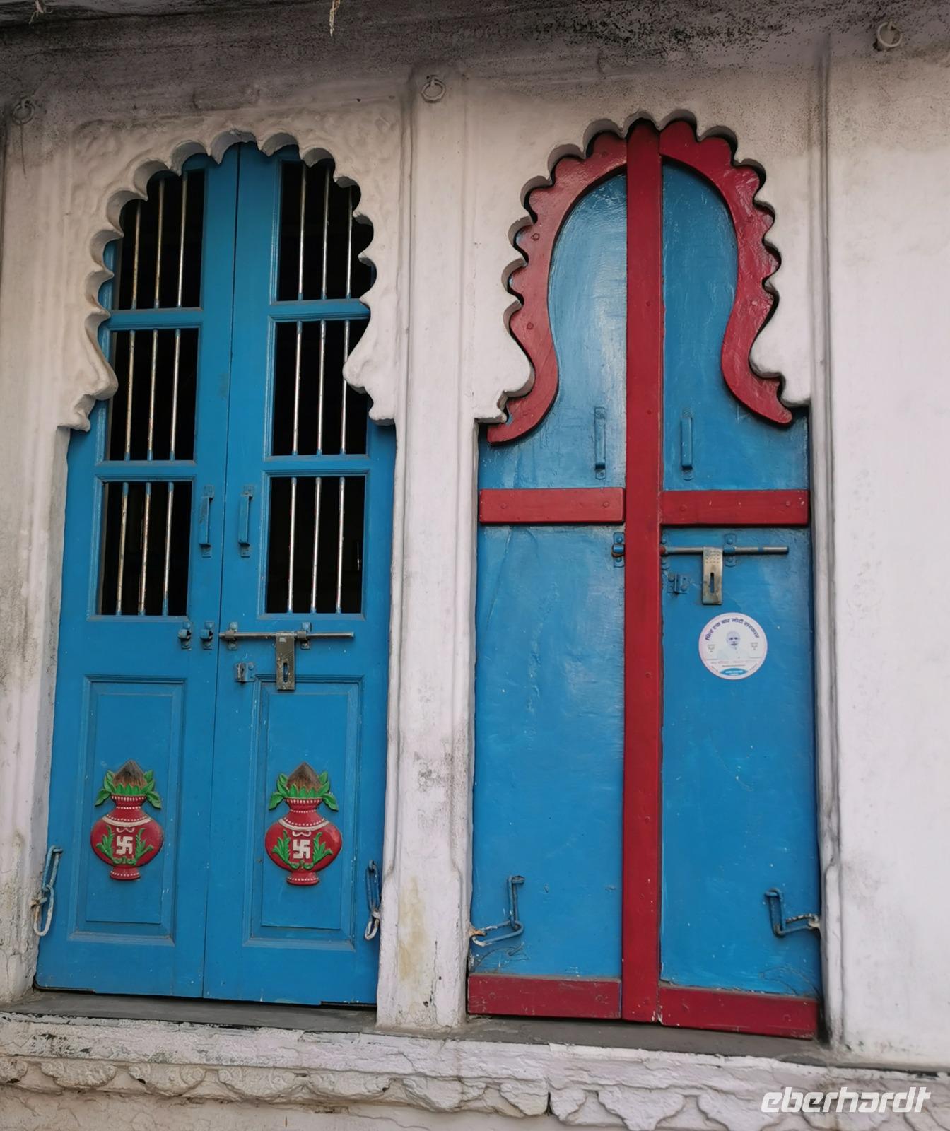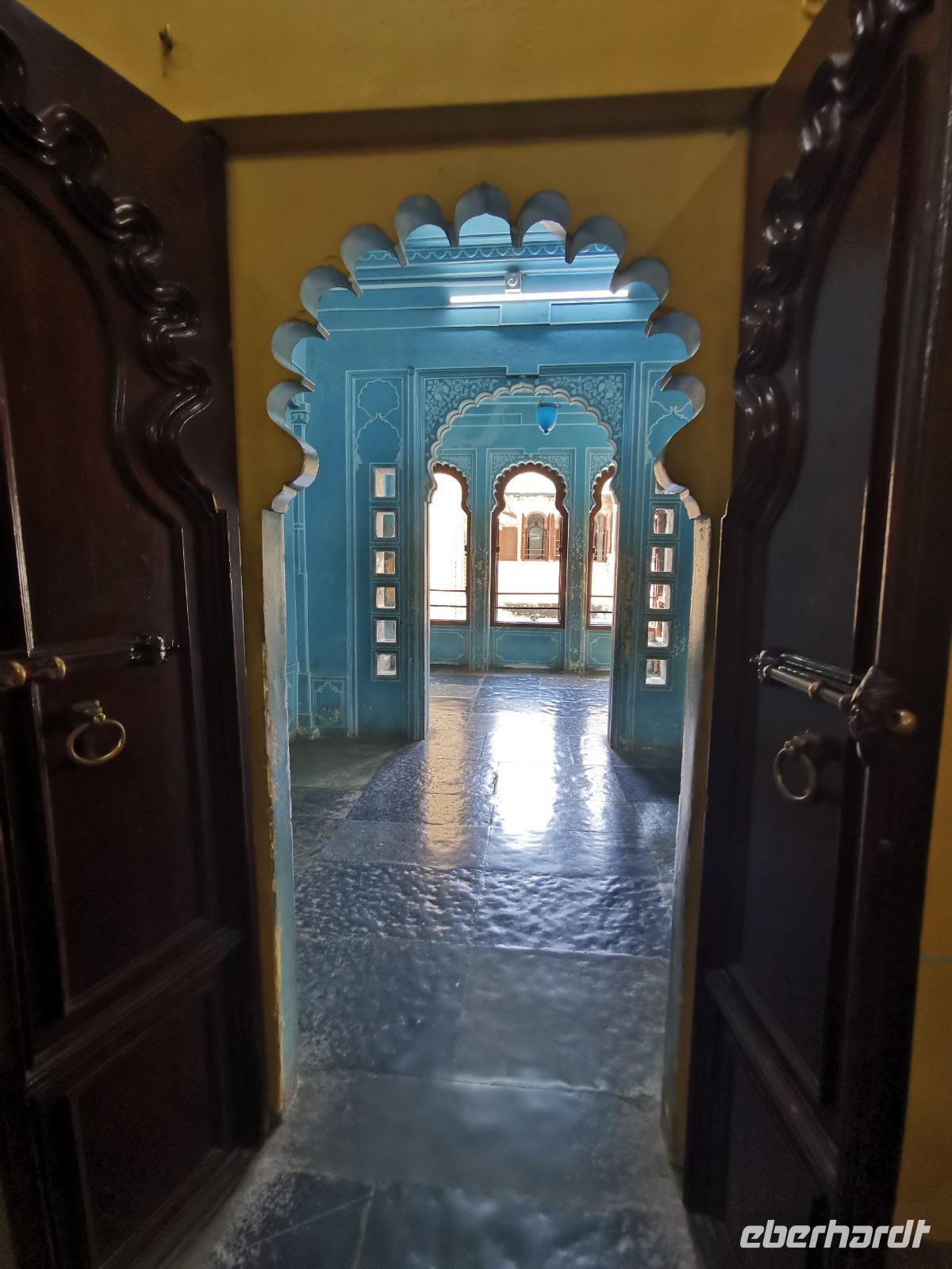 Im oberen Geschoß bewunderten wir allerlei antike Dinge, die einst in Havelis gestanden hatten, und die die Besitzer nun aus Geldmangel oder aufgrund von Modernisierungen verkauften. Besonders schöne Arbeiten waren die holzgeschnitzten Türen, die einstmals die Eingänge solcher Häuser verziert hatten.