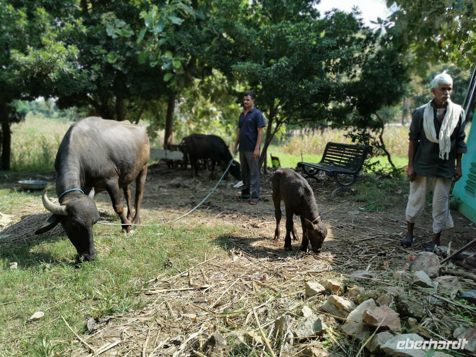 Auf dem Rückweg vom Tempel trafen wir einen Bauern, der uns stolz seine Kuh und das einmonatige Kälbchen präsentierte, und die Kinder auf der Straße kamen neugierig angelaufen und bestaunten uns exotisch aussehende Europäer.