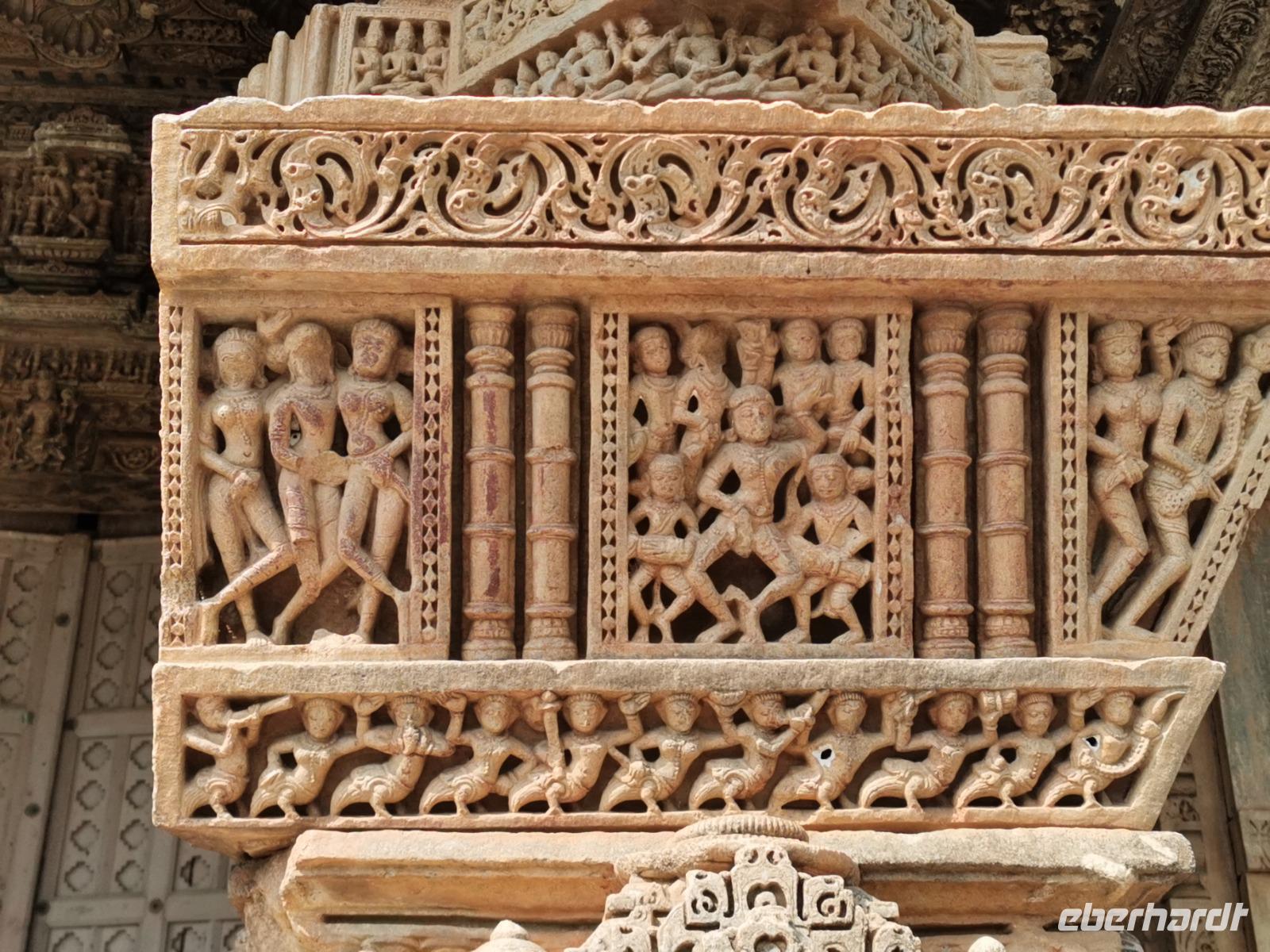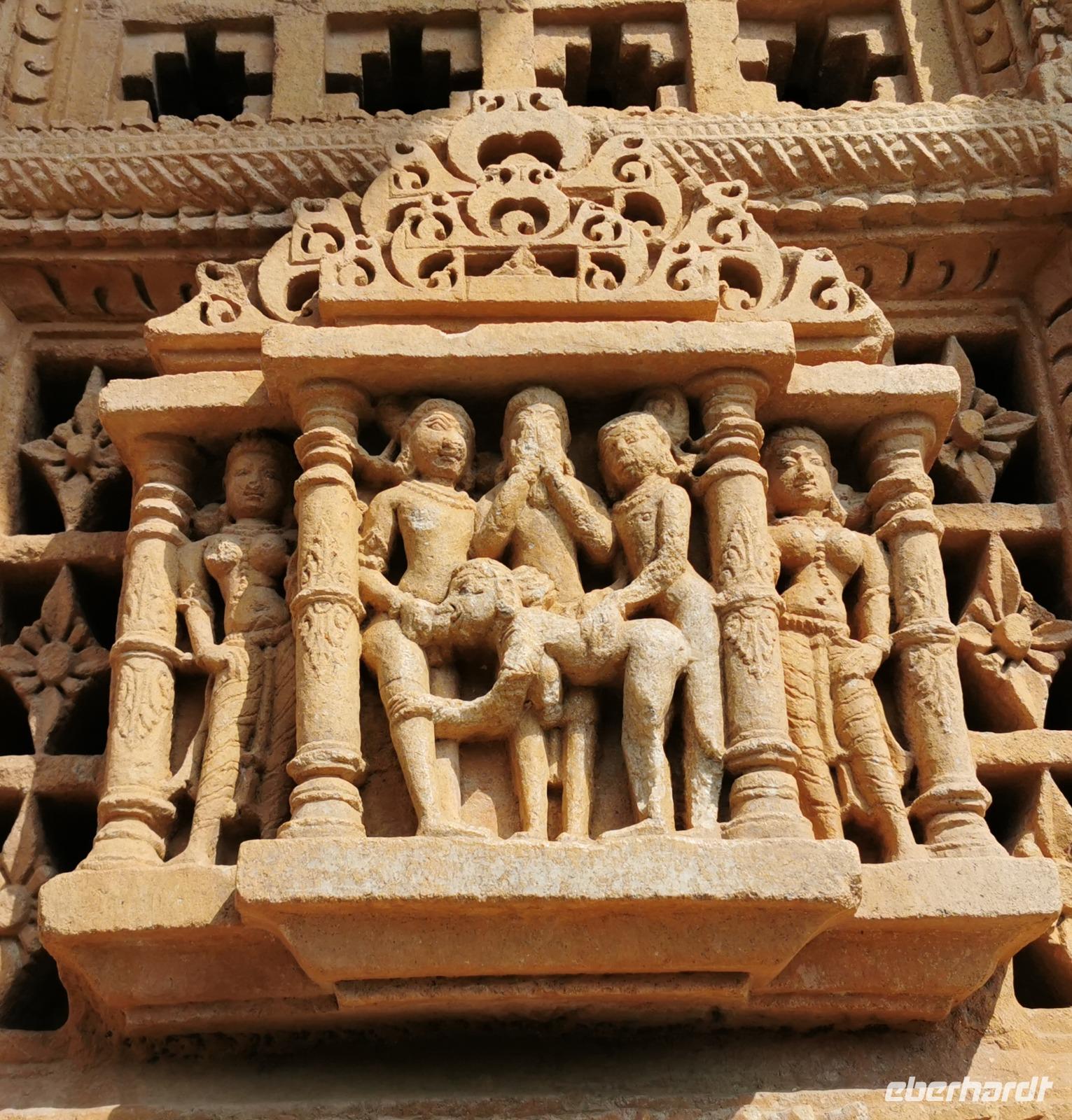 Ravinder erklärte uns die Geschichte des Tempels und zeigte uns die für unsere Augen ungewöhnlich erotischen Darstellungen, die außen am Tempel überall zu finden sind. Während der Kolonialzeit müssen die viktorianisch prüden Engländer hier einen Schock bekommen haben.