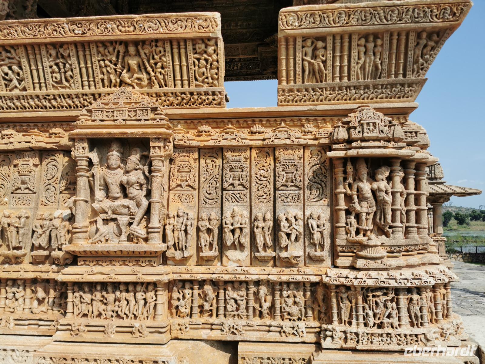 Alle dieser Tempel waren den Sinnenfreuden des Hindugottes Shiva gewidmet und dementsprechend findet man an ihren Außenmauern unzählige erotische Darstellungen.