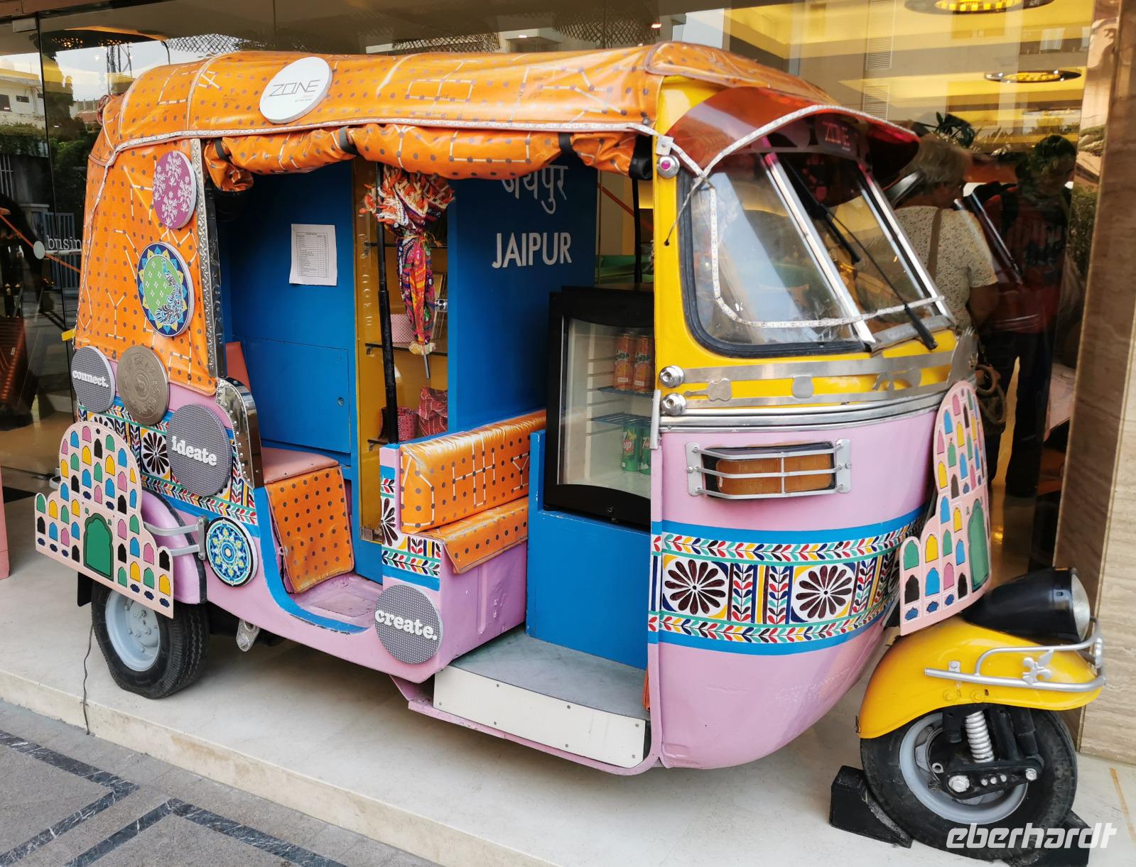 Nach dieser willkommenen Abwechslung unternahmen wir eine Fahrt mit einer Motorradrikscha, tauchten ein in die Pink City, die ihren Namen der Farbe der Wände aller Gebäude in der Altstadt verdankt. Ganz benommen waren wir von den eher erdroten Farben, dem ohrenbetäubenden Gehupe, den vielen Läden mit bunten Stoffen um uns herum und wunderten uns einmal mehr, mit wieviel Gelassenheit und stoischer Ruhe sich die Inder durch diesen Strom bewegten. Wir waren froh, in ein ruhig gelegenes Haveli zum Mittagessen fliehen zu können.