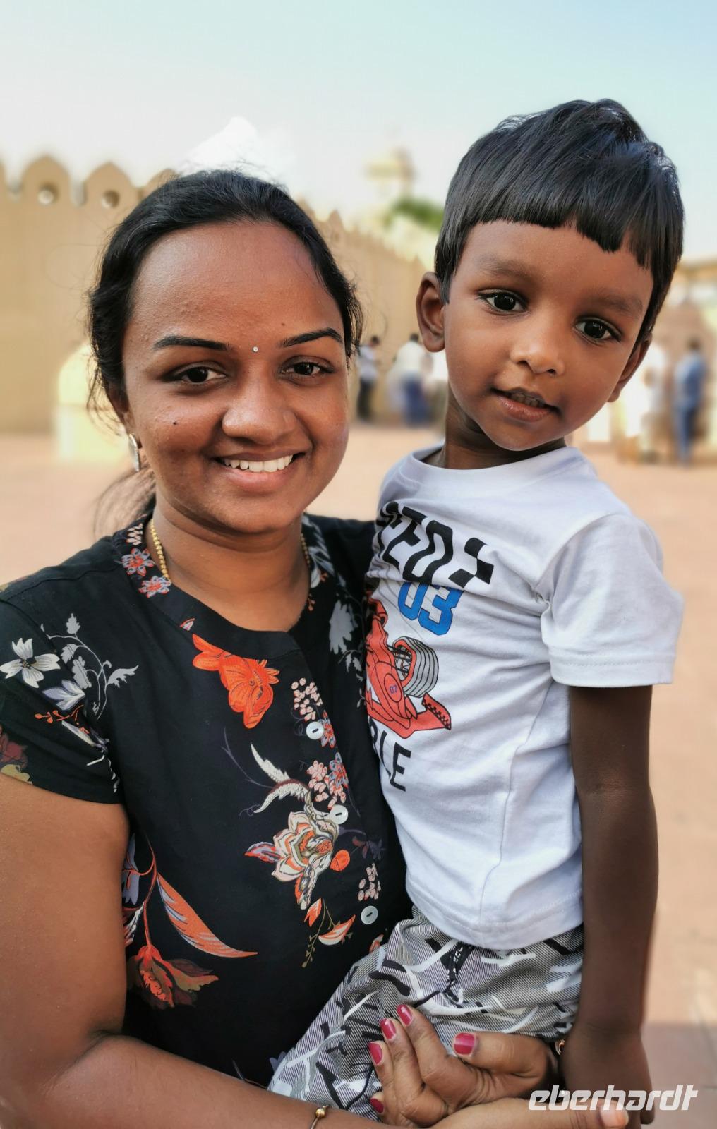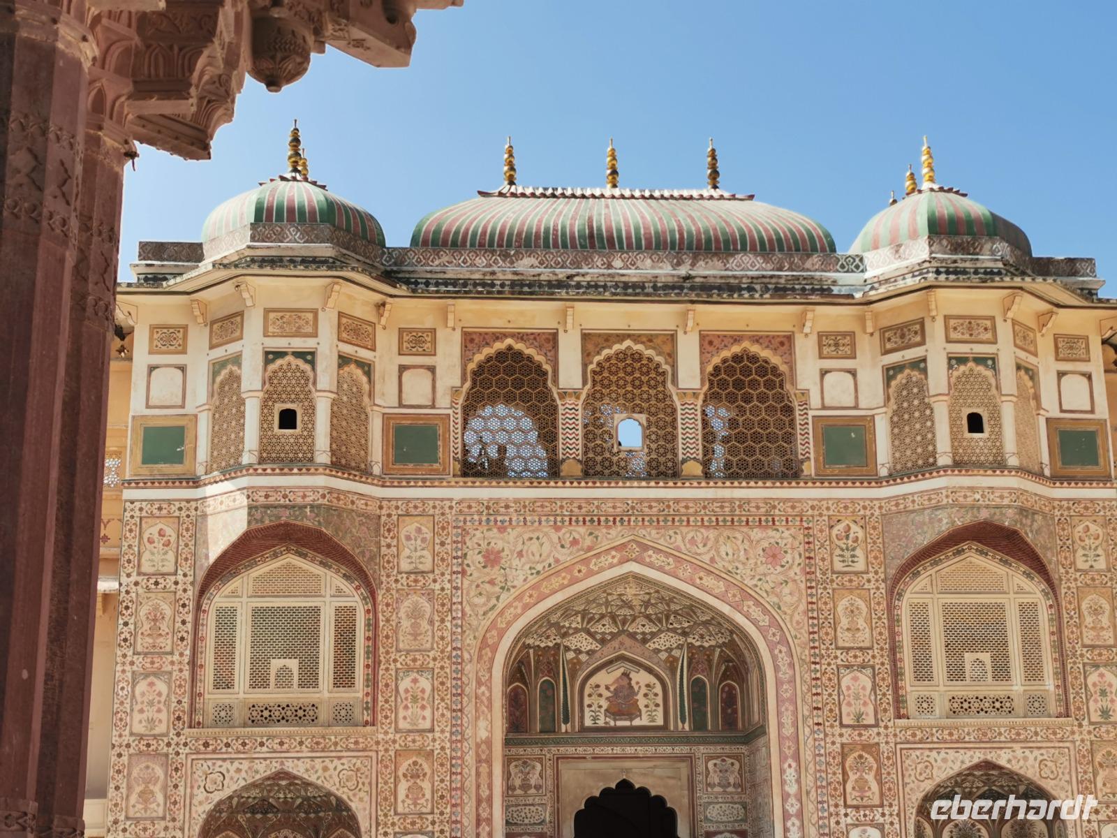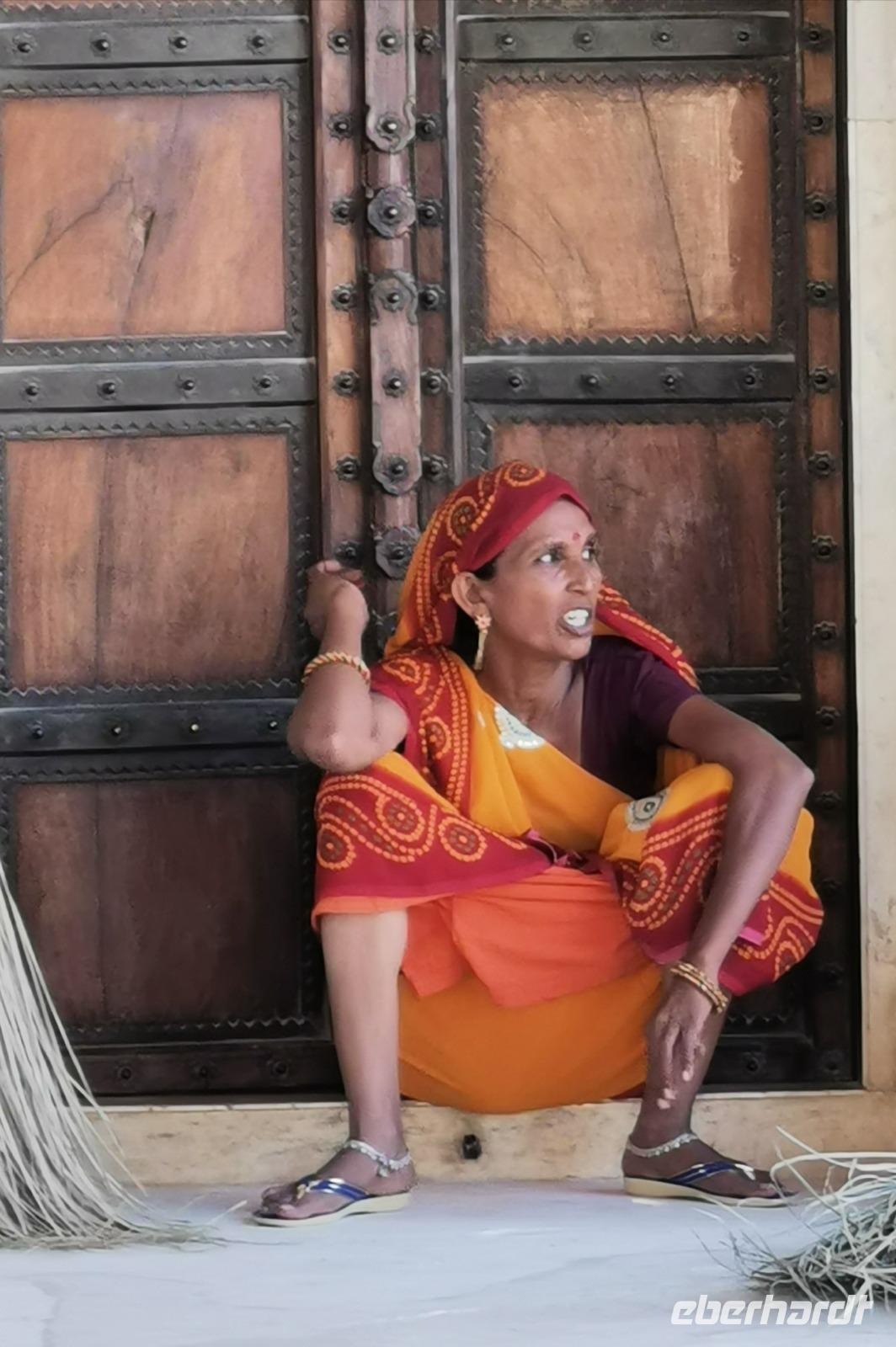 Wir begaben uns durch das imposante Eingangstor und tauchten ein in eine ganz andere Welt. Dadurch, daß gerade das Fest für die Göttin Durga gefeiert wurde, waren viele hinduistische Besucher im Palast und ein buntes Treiben aus farbenfrohen Saris, kleinen Kindern, Streifenhörnchen und Musikern umgab uns.
