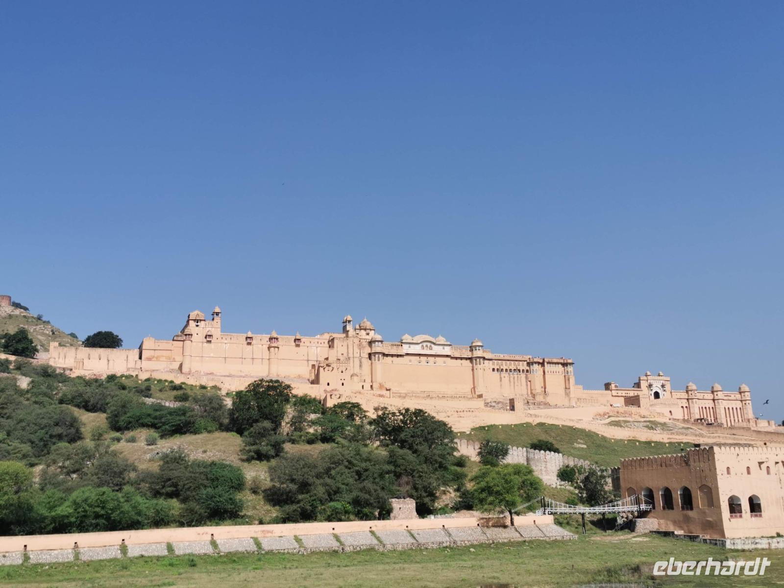 Heute konnten wir uns den ganzen Tag der Hauptstadt Rajastans widmen und starteten mit einer Jeepfahrt zum Amber Fort. Schon beim Fotostop unterhalb dieser riesigen Anlage sahen wir Affen, buntes Treiben auf den Straßen, Schlangenbeschwörer, fliegende Händler und alles wurde vom laut hupenden vorbeirauschenden Verkehrsstrom begleitet. Ein erneuter Angriff auf all unsere Sinne :-)