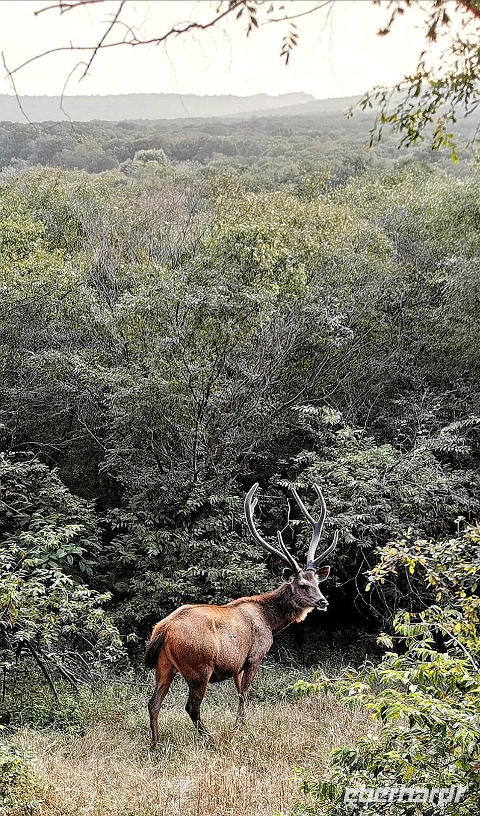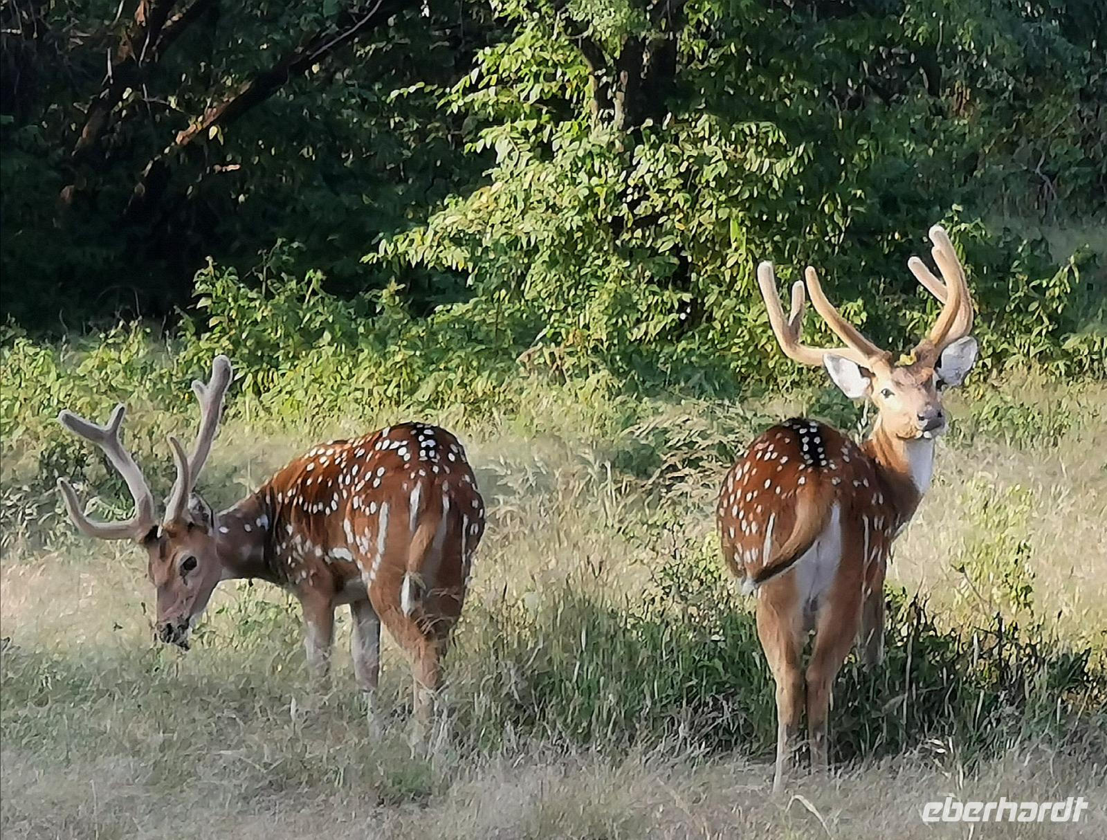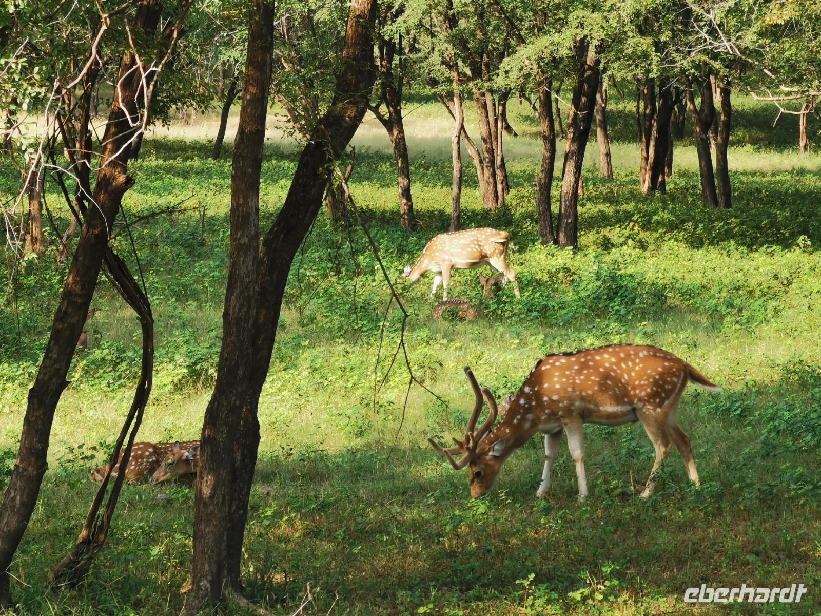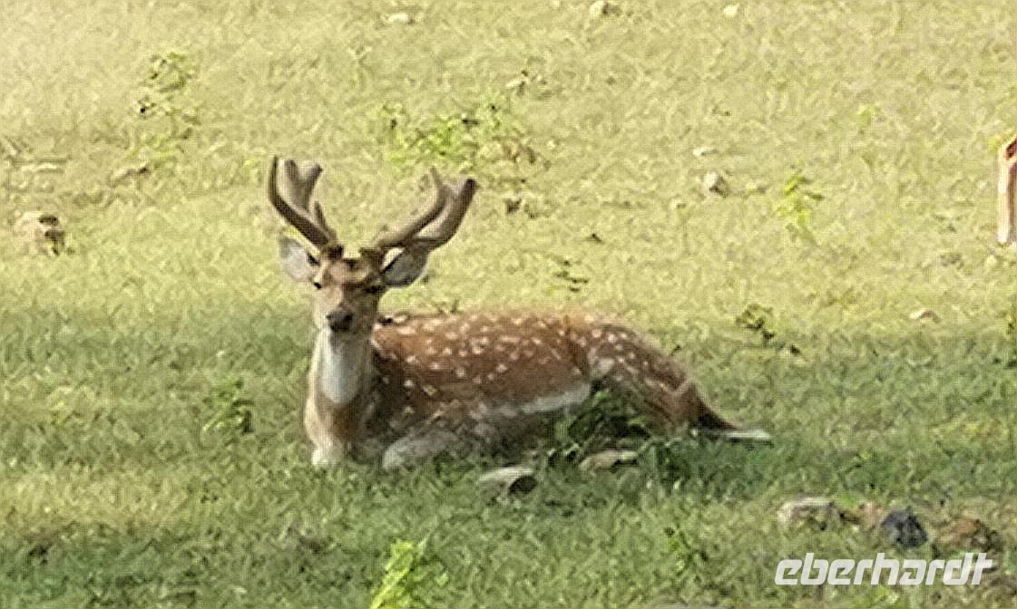 Gleich hinter dem Eingang stand einer der riesigen dunkelbraunen Sambarhirsche mit einem mächtigen Geweih und wenig später sahen wir auch die kleineren weiß gepunkteten Axishirsche. Rechts und links war immer wieder das Wappentier der Inder zu sehen: der Pfau. In einem Flußlauf schlängelte ein Waran entlang, gut getarnt von den braunen Steinen des Flußbettes.