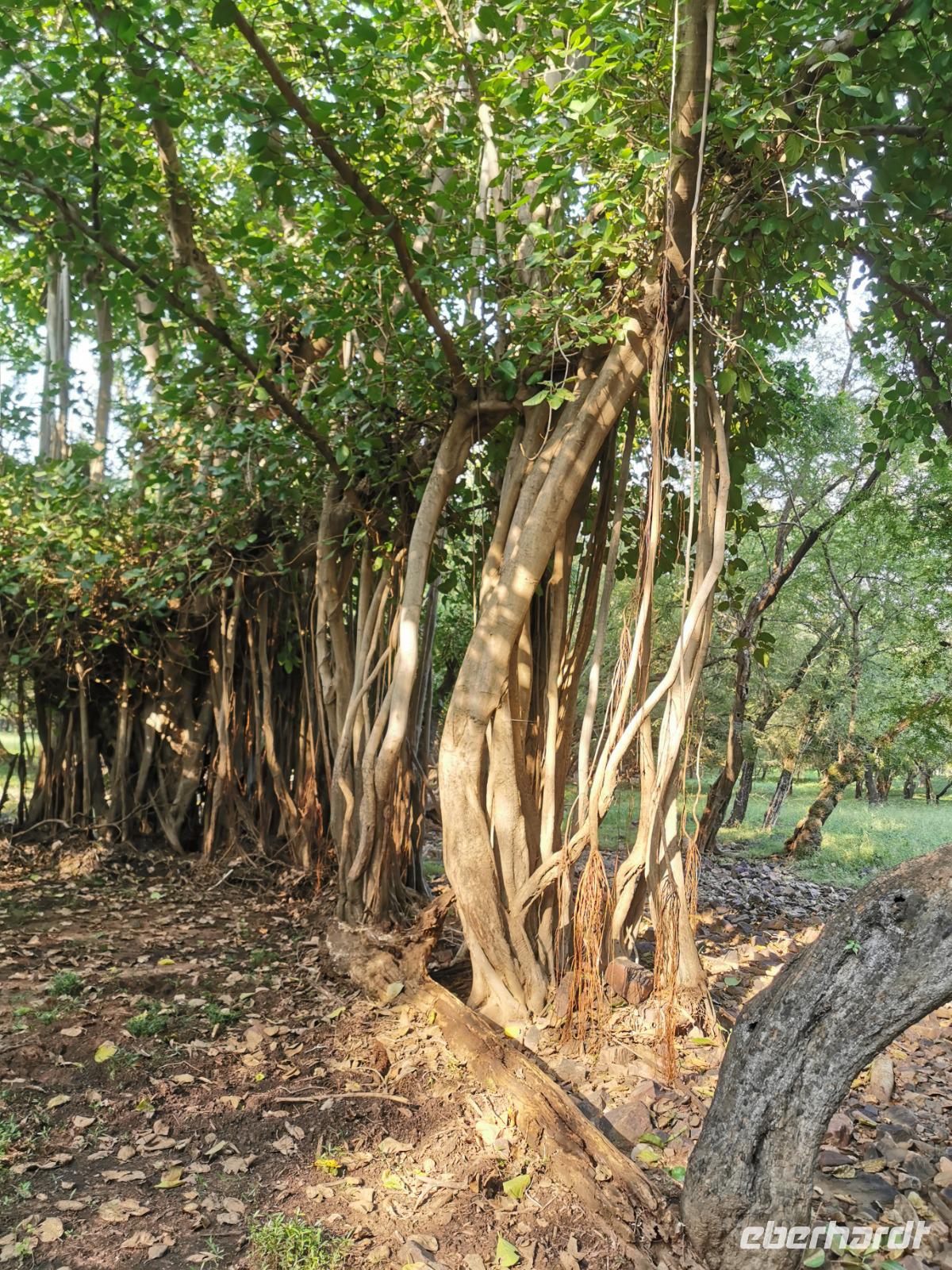 Die Berge der Aravallikette erhoben sich rötlich vor dem Horizont. Wir erblickten trockene Felsengebiete, einige Seen und kleine Wasserläufe, die von Wäldern gesäumt werden. Exotisch gewundene Bäume zogen immer wieder unsere Blicke auf sich. Mitten im Park trohnt auf einem Felsen hoch oben die Festung Ranthambore.