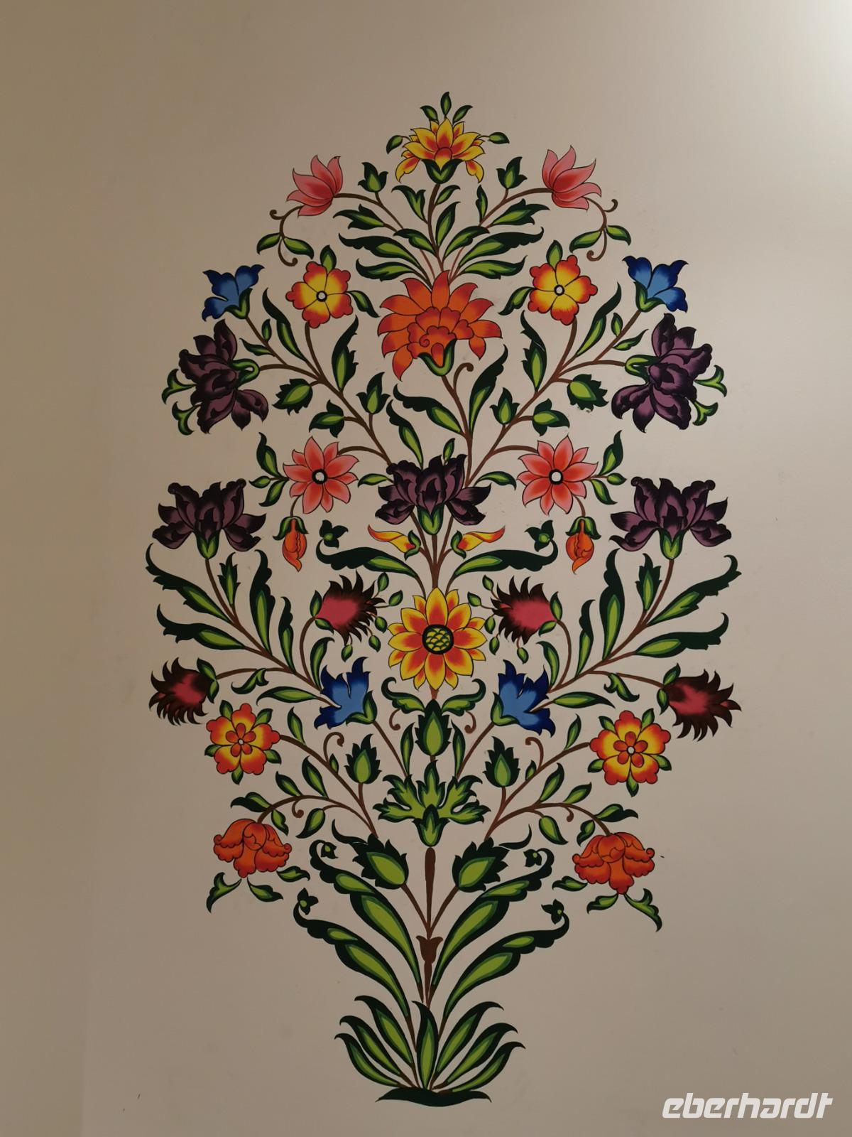 In den Innenräumen konnte man sich wieder direkt ins Märchenbuch versetzt fühlen: Decken mit unzähligen bunten Glasmosaiken und Spiegeln, pompöse Leuchter und reich verzierte Säulen lassen die Besucher glauben, sie spazierten durch eine Traumwelt. Wir hatten Glück, ein Herr vom Personal hatte etwas Zeit für uns und vollführte vor uns, wie man eine fünf Meter lange Stoffbahn kunstvoll zu einem Turban auf dem Kopf windet. Überhaupt sah das Sicherheitspersonal ganz bezaubernd in den weißen Gewändern und bunten Turbanen aus, und besonders unsere weiblichen Gäste ließen sich zu dem ein oder anderen Foto mit solch einem "Prinzen" hinreißen.