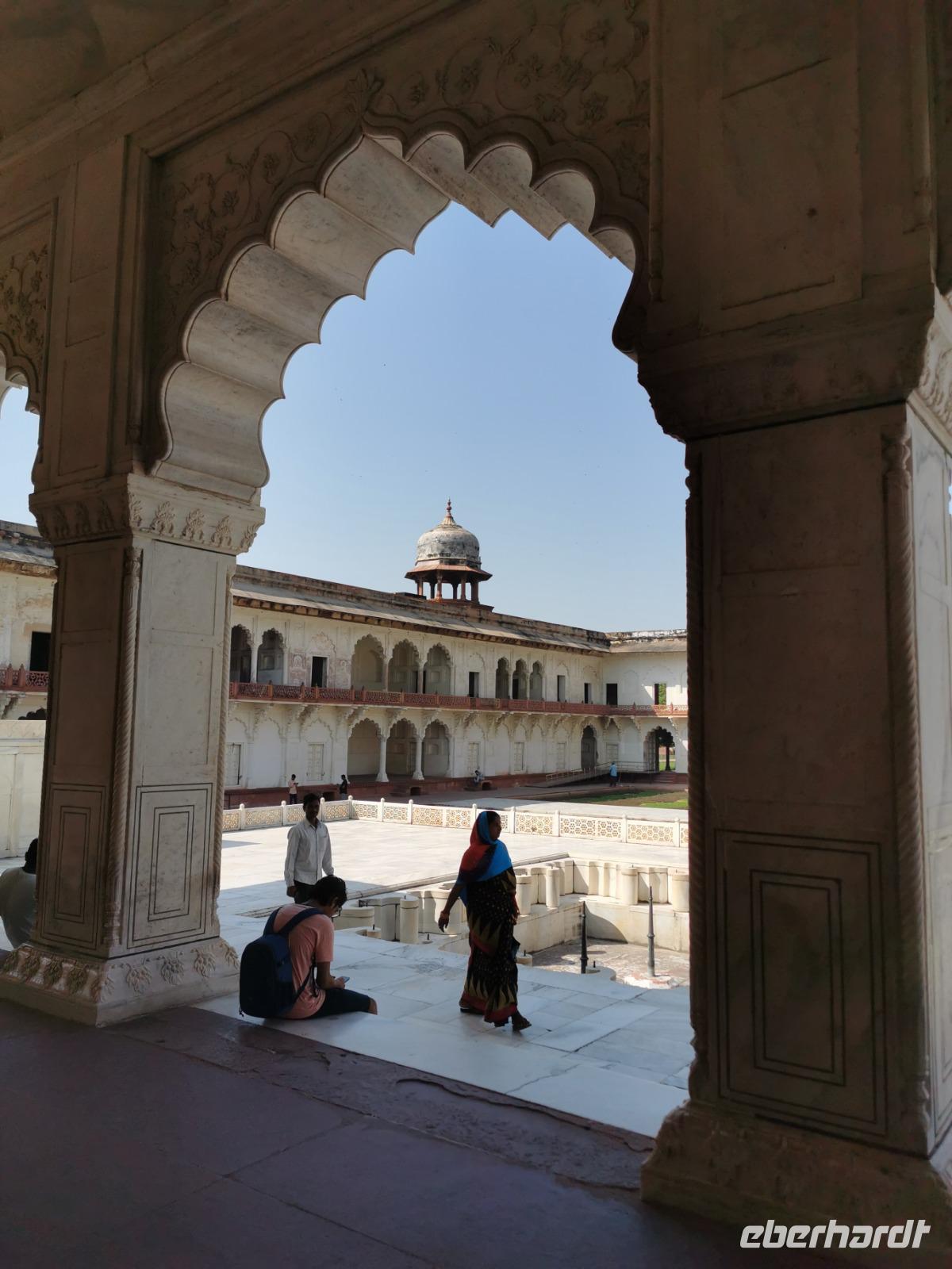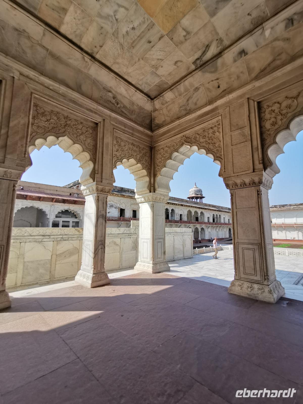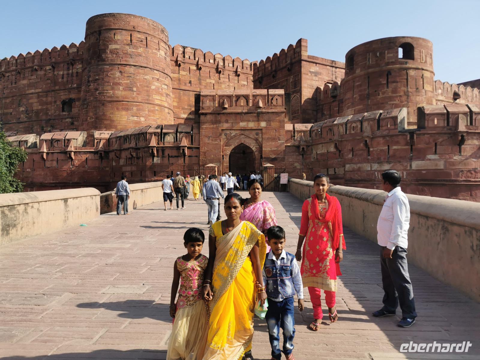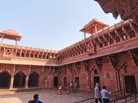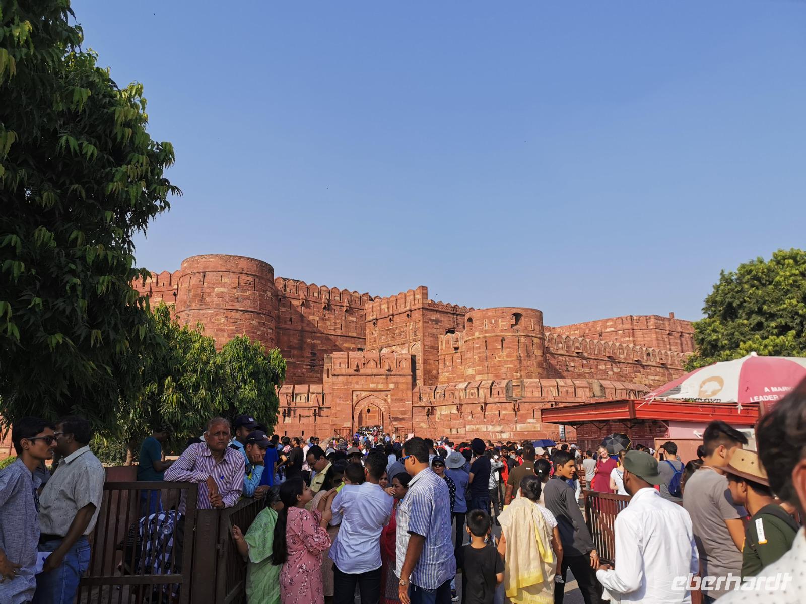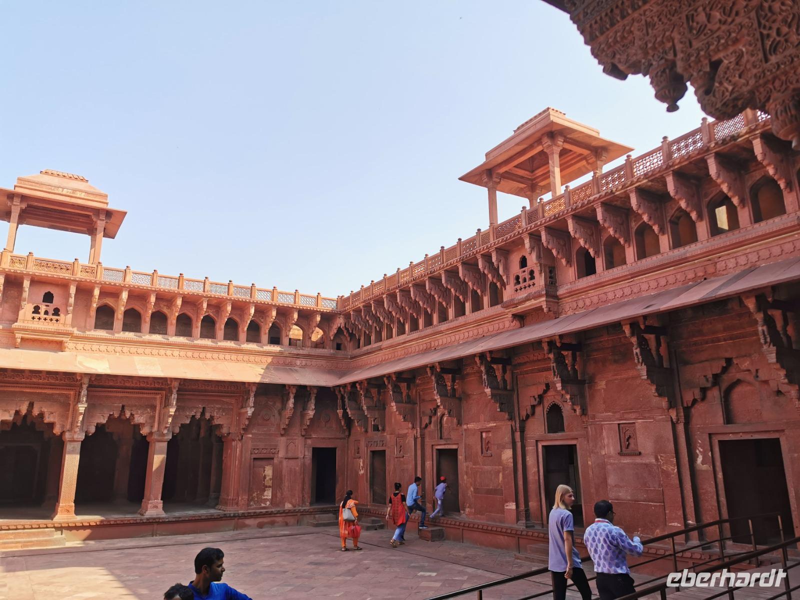 Dieser gigantische Bau wurde 1565 unter Mogul Akbar dem Großen begonnen, der die damalige Hauptstadt aus Delhi hierher nach Agra verlegen ließ. Shah Jahan, der Erbauer des Taj Mahal, ließ Innenbauten aus weißem Marmor mit Verzierungen aus Glas und Halbedelsteinen einbauen. Leider wurden alle Intarsien von den englischen Kolonialherren entfernt und geraubt und nur an wenigen Stellen, die langsam liebevoll saniert werden, kann man die einstige Pracht dieser Anlage erahnen.