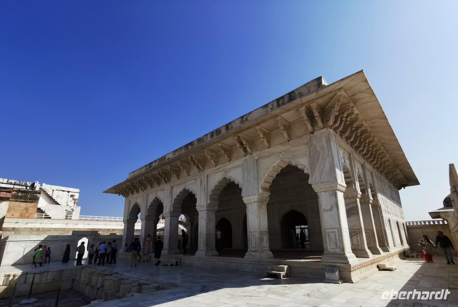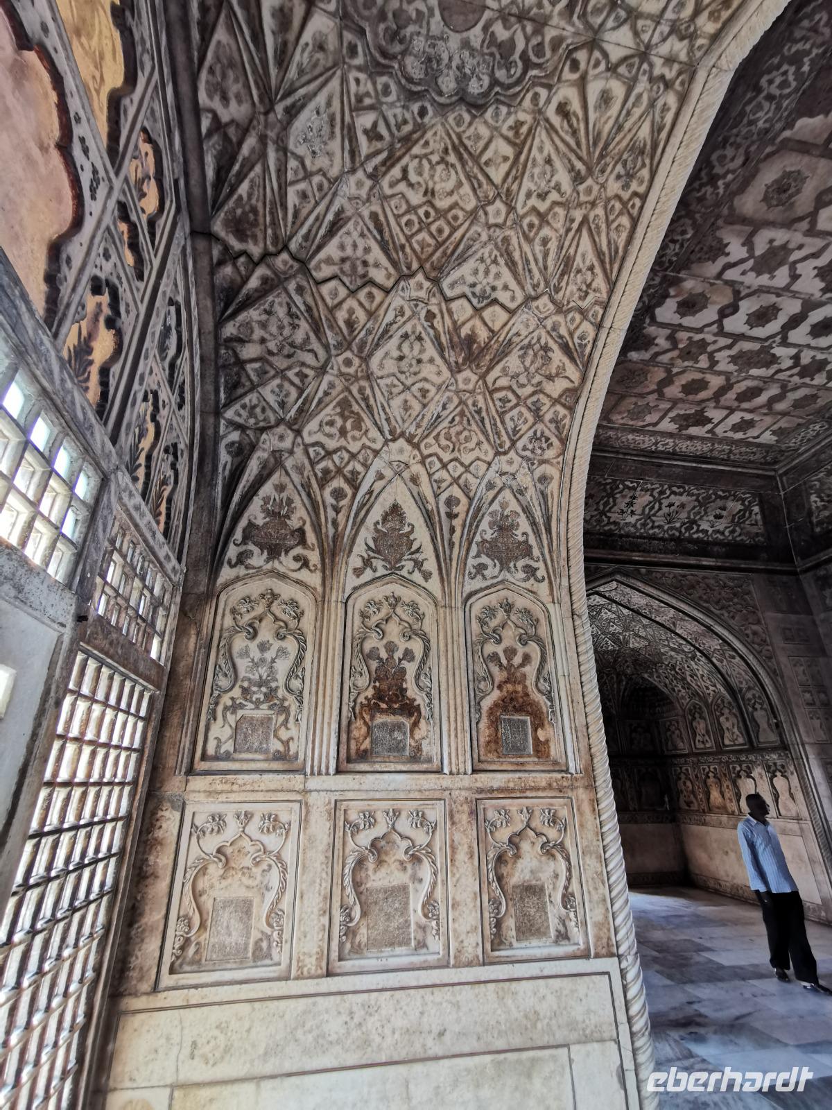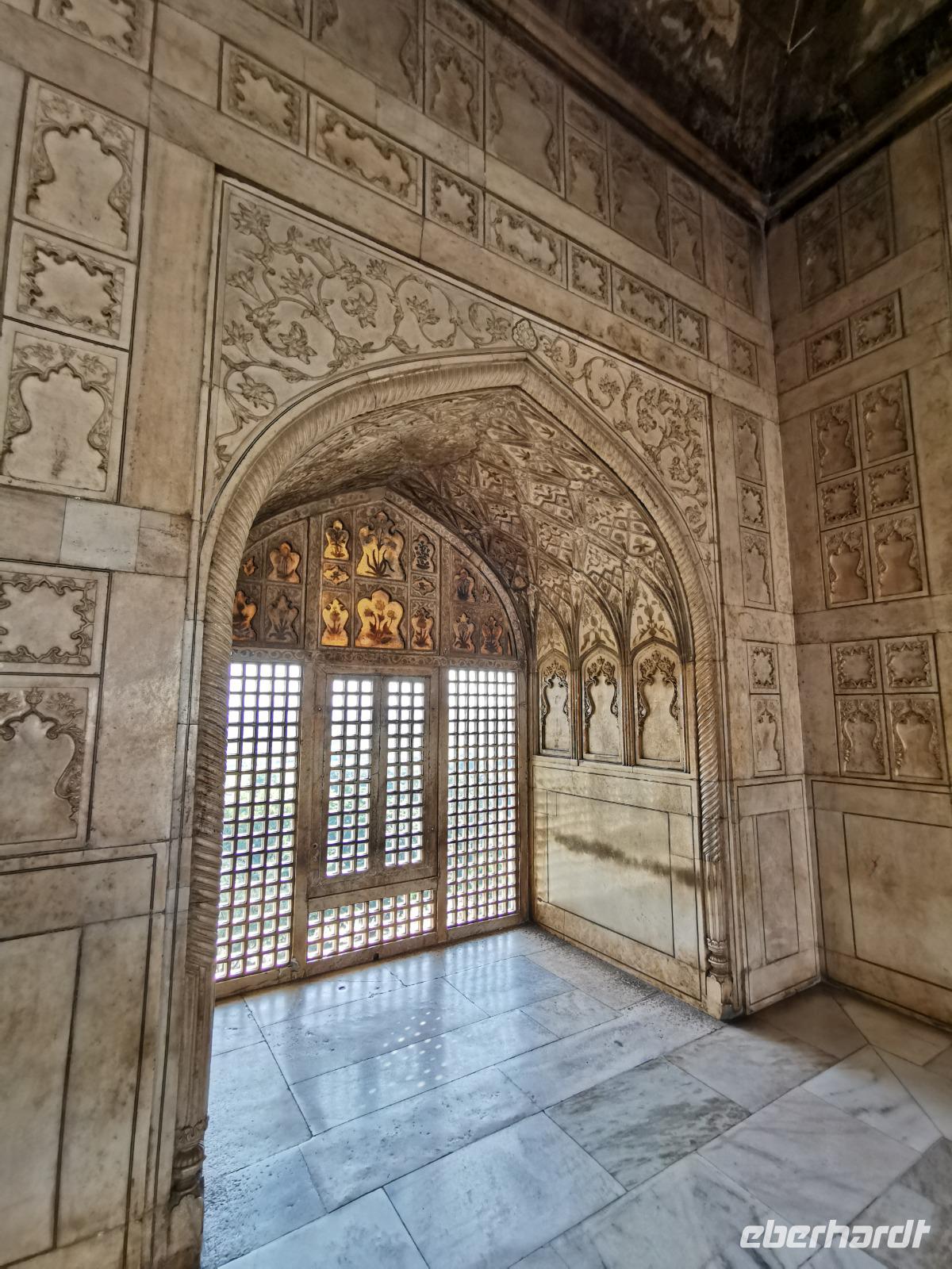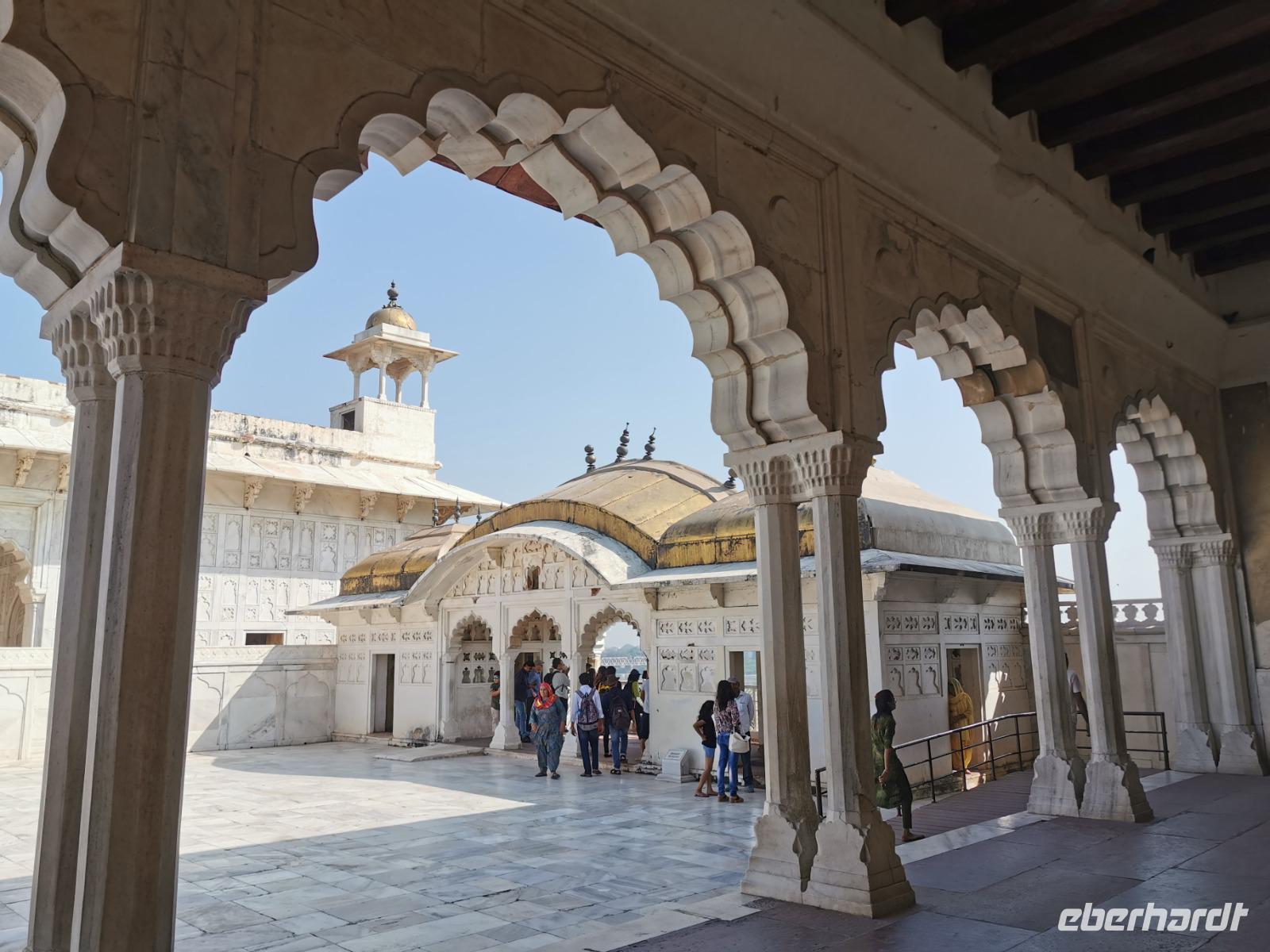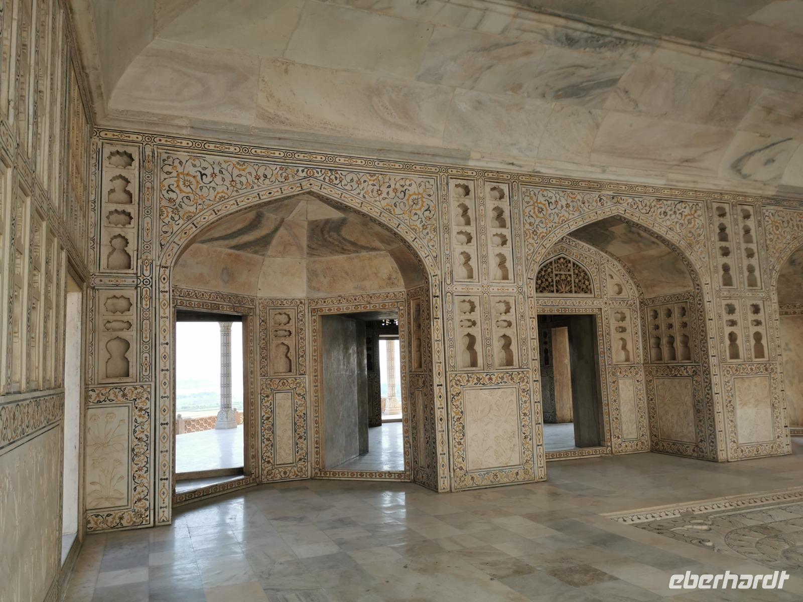 Dieser gigantische Bau wurde 1565 unter Mogul Akbar dem Großen begonnen, der die damalige Hauptstadt aus Delhi hierher nach Agra verlegen ließ. Shah Jahan, der Erbauer des Taj Mahal, ließ Innenbauten aus weißem Marmor mit Verzierungen aus Glas und Halbedelsteinen einbauen. Leider wurden alle Intarsien von den englischen Kolonialherren entfernt und geraubt und nur an wenigen Stellen, die langsam liebevoll saniert werden, kann man die einstige Pracht dieser Anlage erahnen.