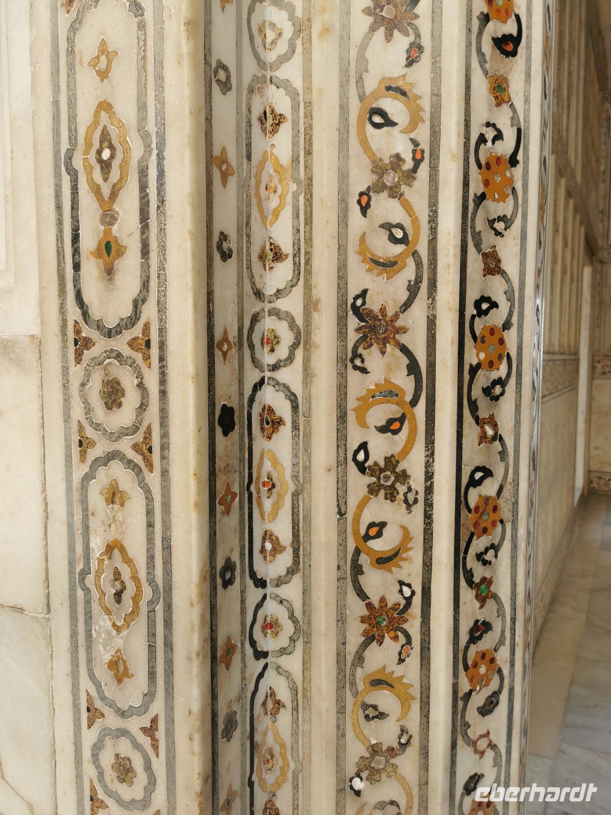 Verwendet wurden Ziegelsteine, die innen und außen mit Marmor überzogen wurden. Vor allem im Innenraum des Grabmals kann der Besucher bis heute die hervorragende Handwerkskunst der damaligen Intarsienkünstler bewundern: Jaspis aus dem Punjab, Achat aus dem Jeman, Kristall aus China, Lapislazuli und Saphire aus Ceylon und Korallen aus Arabien überziehen die Wände mit floralen Ornamenten.
