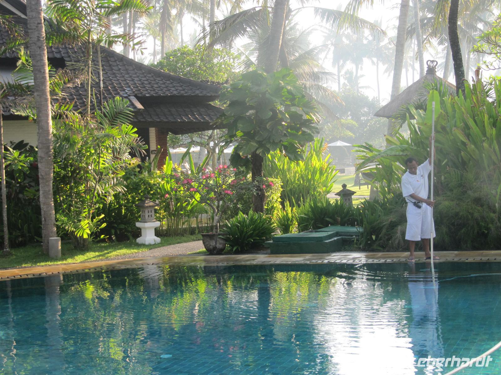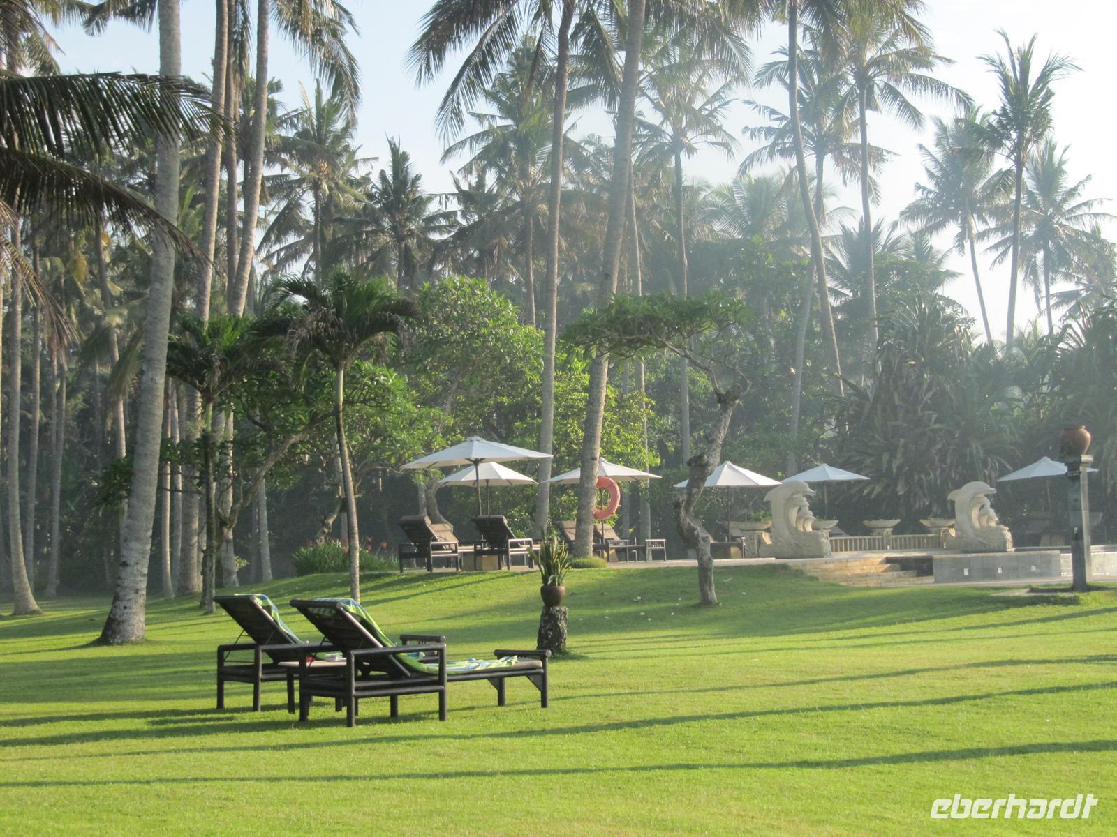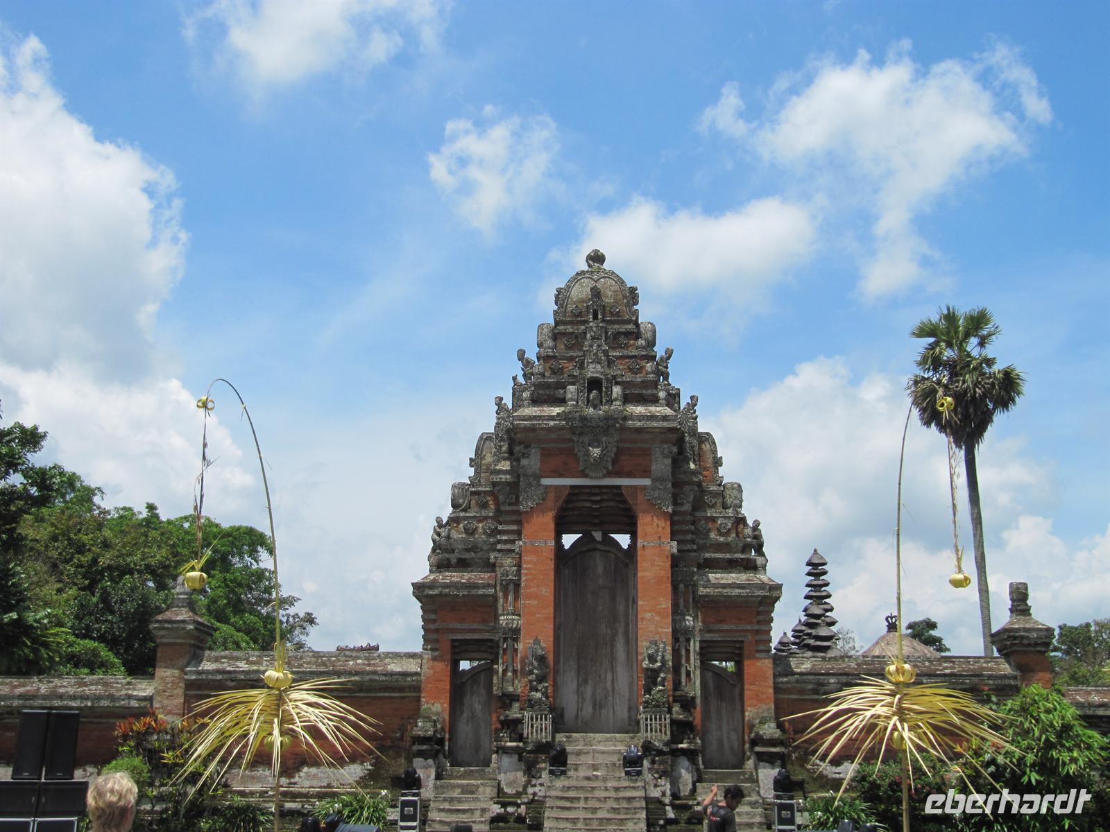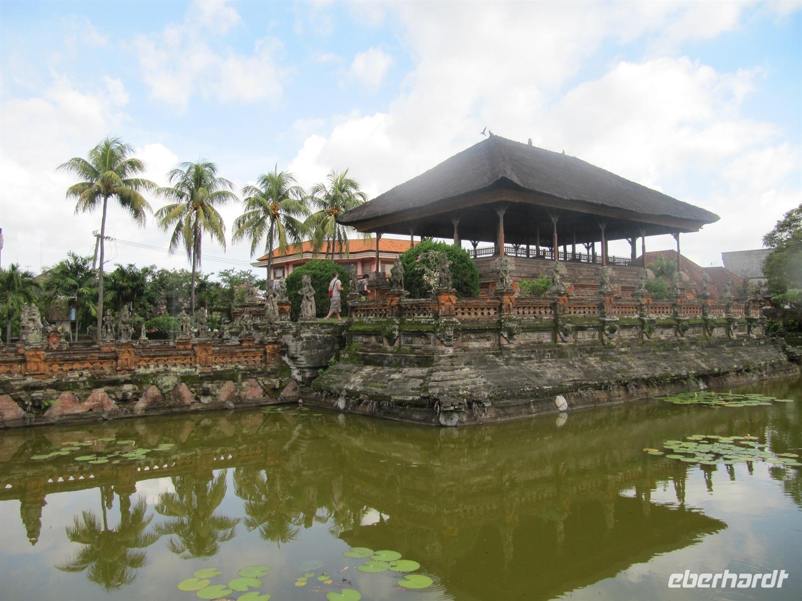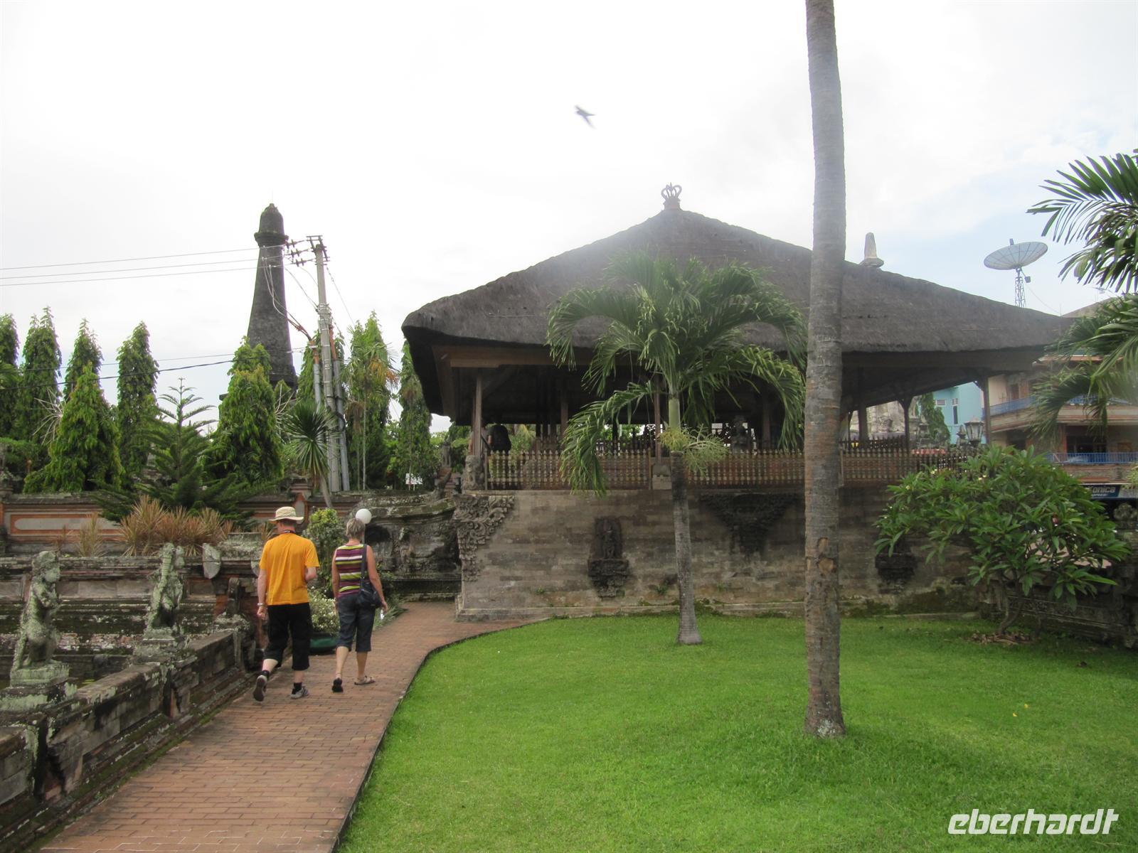 Im Osten Balis, zwischen Candi Dasa und Klungkung, erstreckt sich an der Küste schwarzer vulkanischer Sand. Dieser stammt vom Ausbruch des Vulkans Agung im Jahre 1963. Unweit des Strandes befindet sich die Fledermausgrotte Goa Lawah, die von großer religiöser Bedeutung ist und von balinesischen Gläubigen verehrt wird. In ihr leben zwei „heilige" Schlangen, die selten zum Vorschein kommen. Nicht zu übersehen sind Fledermäuse, welche die Decke der Höhle bis auf den letzten Flecken bedecken. Wir benötigen für den Besuch einen Sarong. Am heutigen Sonntag waren viele Einheimische unterwegs und nahmen an einer Prozession teil. Anschließend fuhren wir weiter nach Klungkung und besuchten die Gerichtshalle. Danach geht es weiter nach Tenganan. Wir besuchen ein Aga Dorf, das für seine Doppelikat-Weberei bekannt ist. Das Dorf ist jedoch sehr auf den Tourismus ausgelegt und nicht wirklich authentisch. Am Nachmittag waren wir wieder zurück im Hotel, was alle sehr begrüßt haben. Wir nutzten die Möglichkeit zum Baden oder zur Massage.