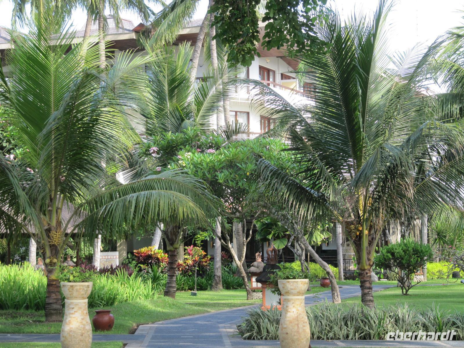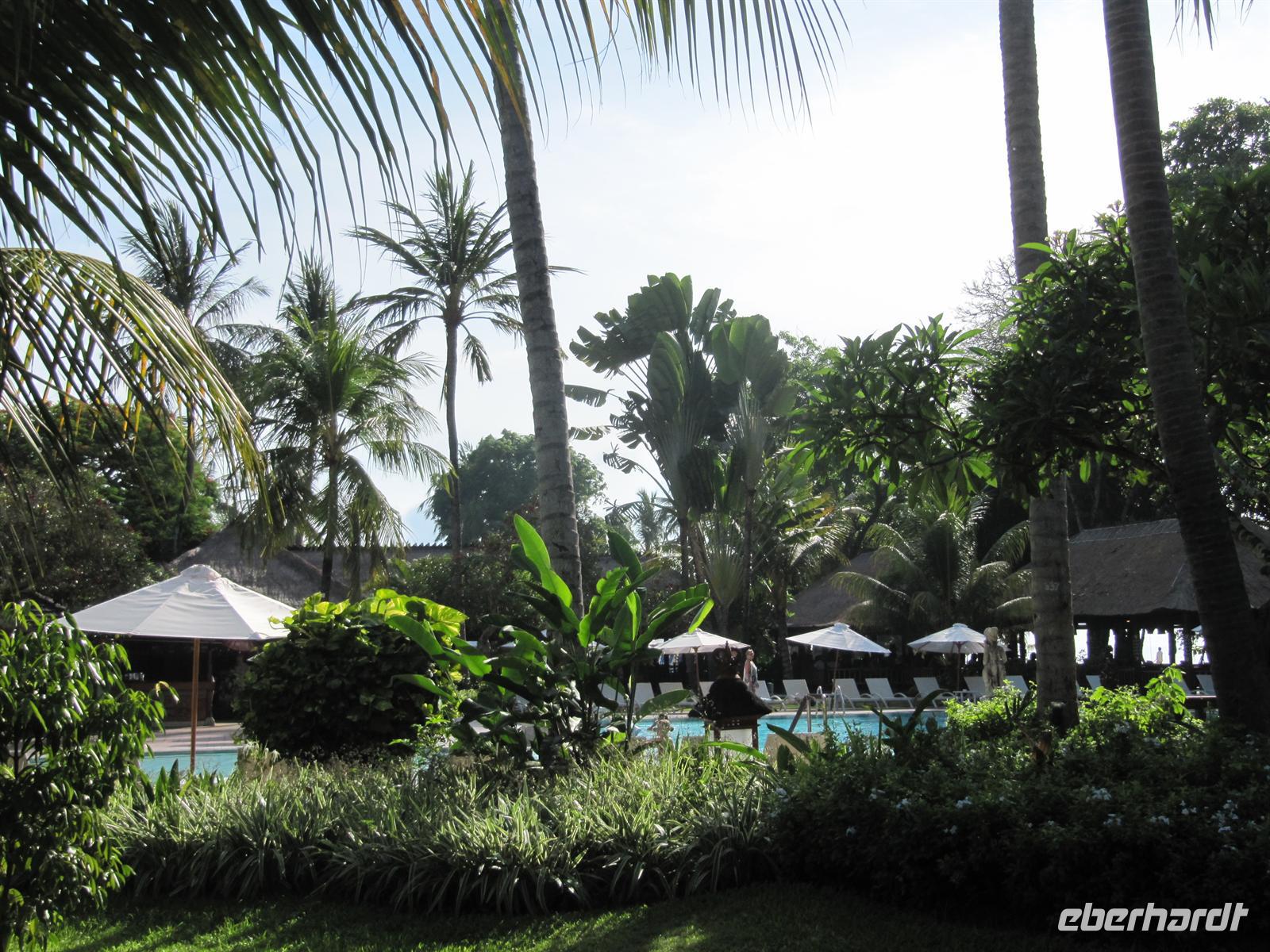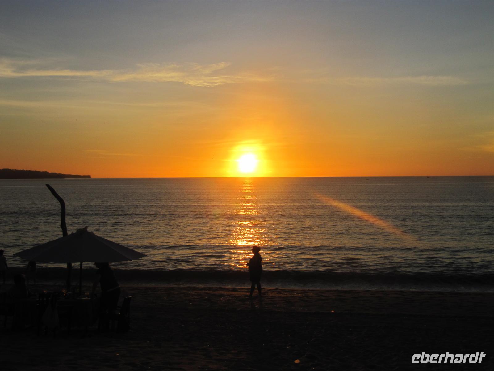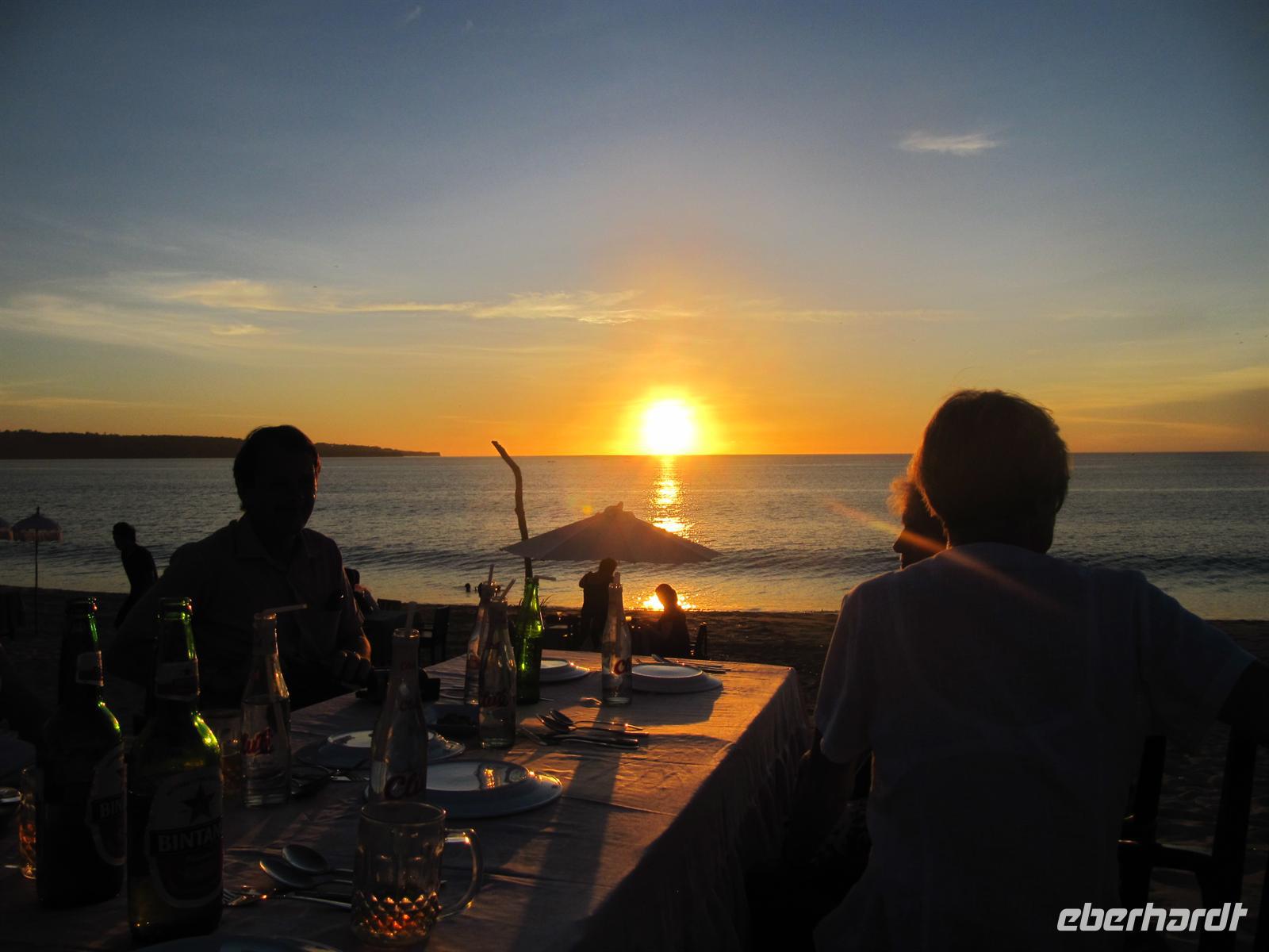 Nach einem zeitigen Frühstück fuhren wir zum Flughafen. Jonny kümmert sich um einen Gruppen Check-In. Dadurch läuft alles sehr schnell und unkompliziert ab. Wir fliegen nach Denpasar. Im Flugzeug werden Einreiseformulare und Zollerklärung ausgegeben. Nach unserer pünktlichen Landung in Denpasar kauften wir unser Visum. Bawa - unser örtlicher Reiseleiter - erwartete uns bereits vor dem Flughafen mit einem Eberhardt-Schild und in traditioneller Kleidung. Diesmal erwartete uns ein kleinerer Bus. Auch hier gab es Wasser auf dem Bus. Wir erreichten das Sanur Beach Hotel, direkt am Sandstrand gelegen, und erhielten ein Begrüßungsgetränk. Das Abendessen wurde uns im indonesischen Restaurant bei Live Musik gereicht. Ein reichhaltiges Buffet verwöhnte uns.