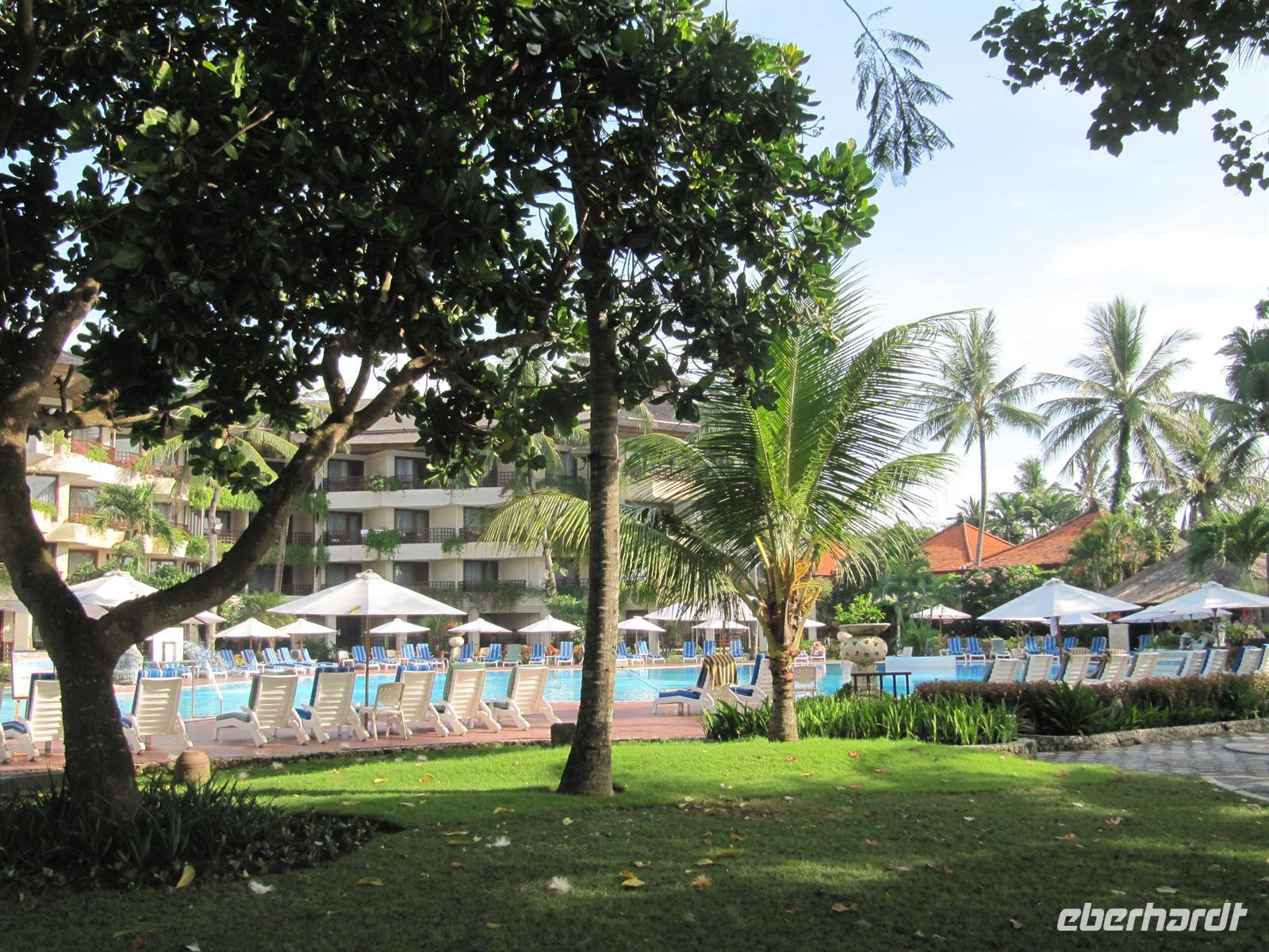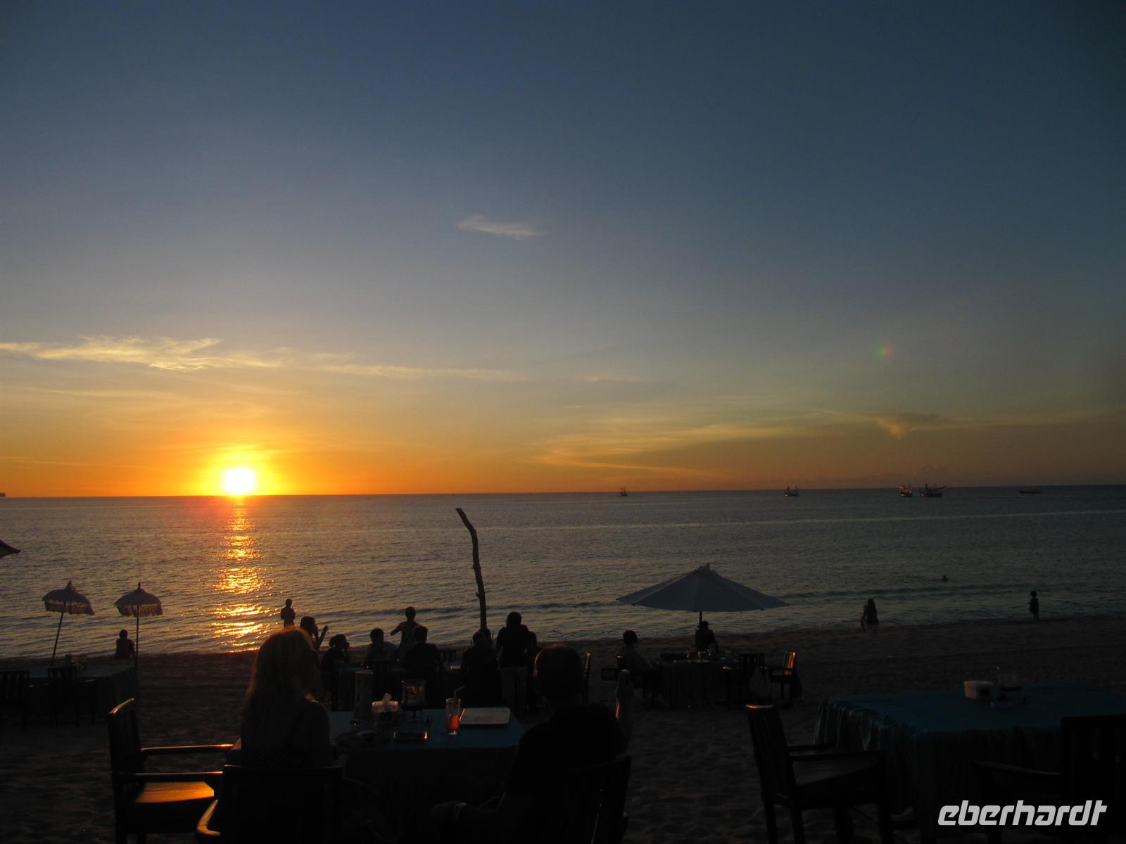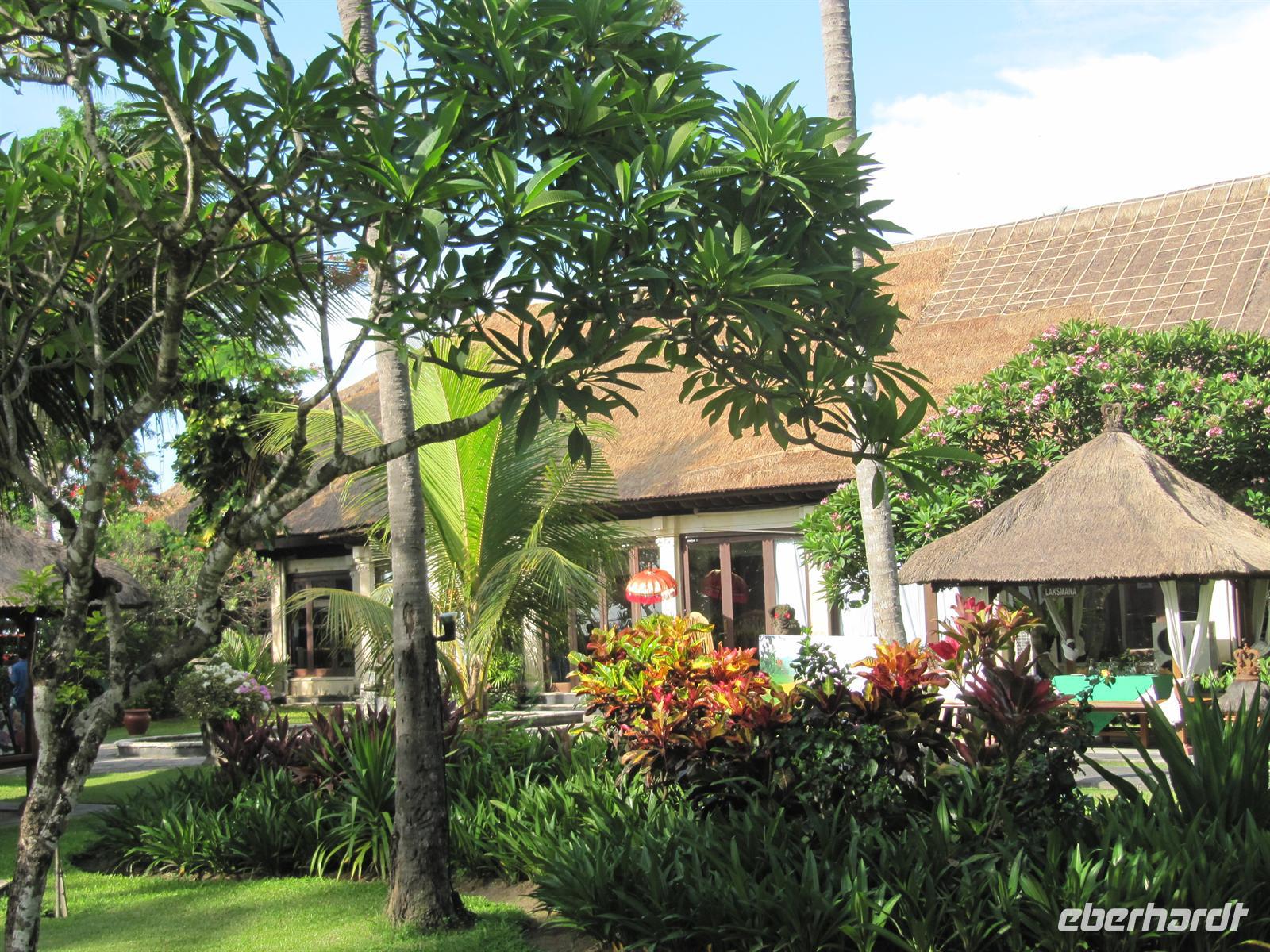 Nach einem zeitigen Frühstück fuhren wir zum Flughafen. Jonny kümmert sich um einen Gruppen Check-In. Dadurch läuft alles sehr schnell und unkompliziert ab. Wir fliegen nach Denpasar. Im Flugzeug werden Einreiseformulare und Zollerklärung ausgegeben. Nach unserer pünktlichen Landung in Denpasar kauften wir unser Visum. Bawa - unser örtlicher Reiseleiter - erwartete uns bereits vor dem Flughafen mit einem Eberhardt-Schild und in traditioneller Kleidung. Diesmal erwartete uns ein kleinerer Bus. Auch hier gab es Wasser auf dem Bus. Wir erreichten das Sanur Beach Hotel, direkt am Sandstrand gelegen, und erhielten ein Begrüßungsgetränk. Das Abendessen wurde uns im indonesischen Restaurant bei Live Musik gereicht. Ein reichhaltiges Buffet verwöhnte uns.