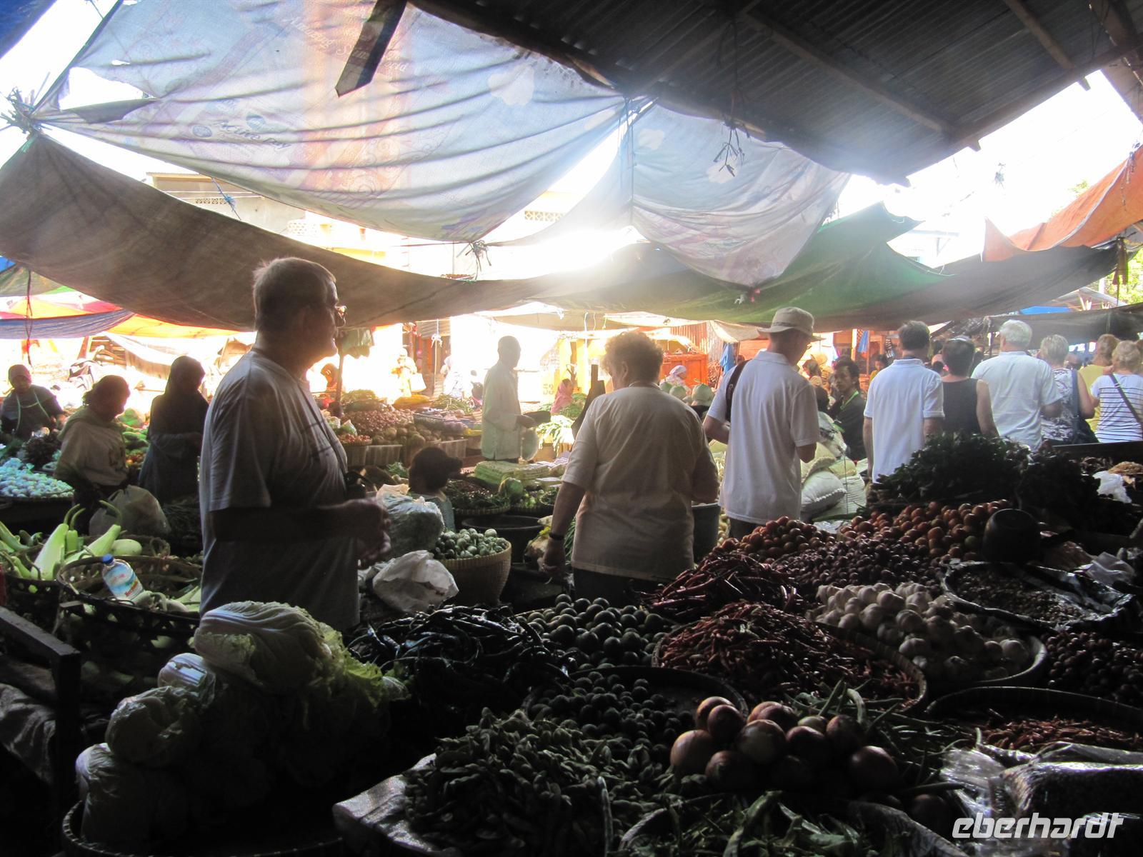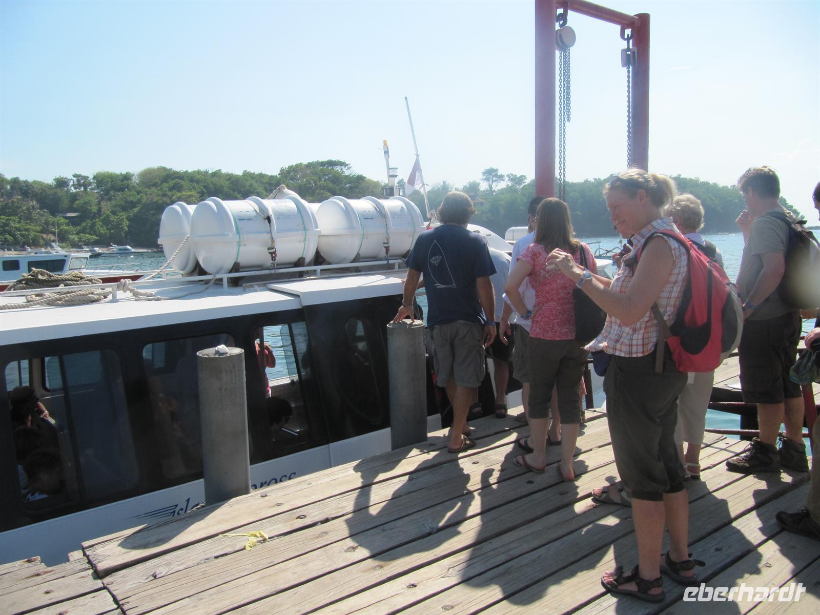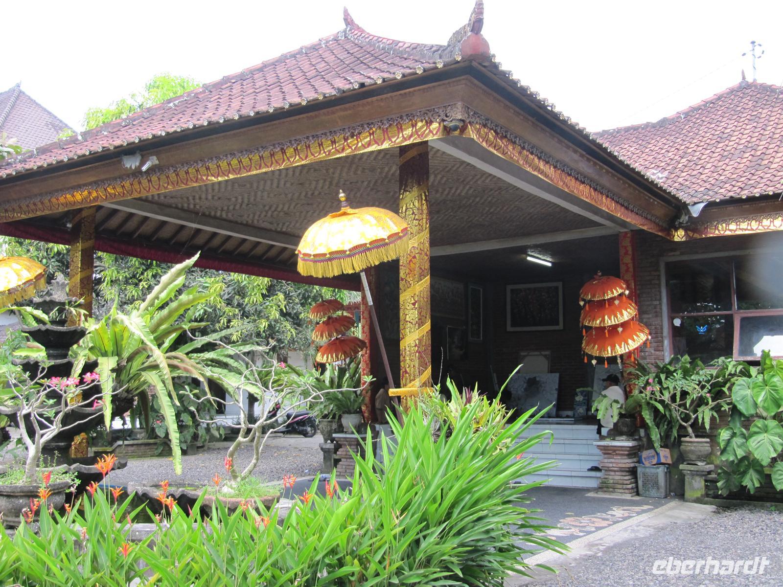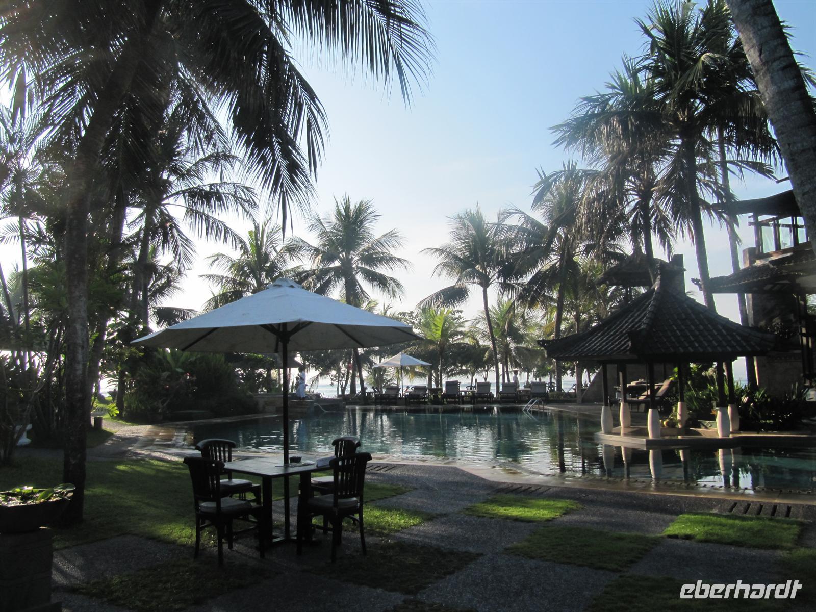 Nach einem zeitigen Frühstück fuhren wir zum Flughafen. Jonny kümmert sich um einen Gruppen Check-In. Dadurch läuft alles sehr schnell und unkompliziert ab. Wir fliegen nach Denpasar. Im Flugzeug werden Einreiseformulare und Zollerklärung ausgegeben. Nach unserer pünktlichen Landung in Denpasar kauften wir unser Visum. Bawa - unser örtlicher Reiseleiter - erwartete uns bereits vor dem Flughafen mit einem Eberhardt-Schild und in traditioneller Kleidung. Diesmal erwartete uns ein kleinerer Bus. Auch hier gab es Wasser auf dem Bus. Wir erreichten das Sanur Beach Hotel, direkt am Sandstrand gelegen, und erhielten ein Begrüßungsgetränk. Das Abendessen wurde uns im indonesischen Restaurant bei Live Musik gereicht. Ein reichhaltiges Buffet verwöhnte uns.