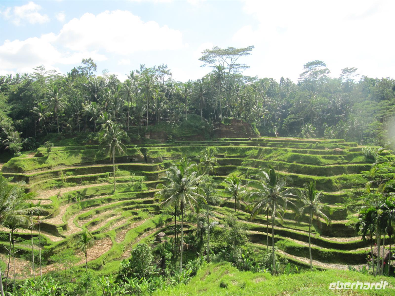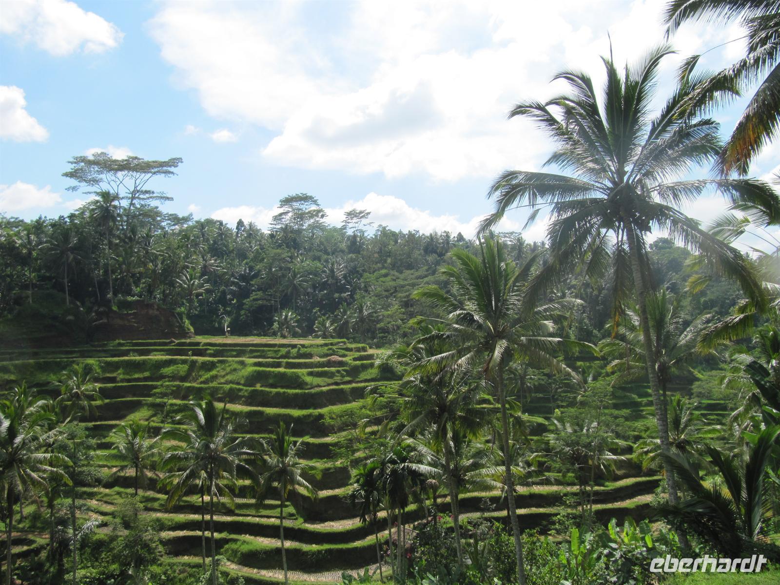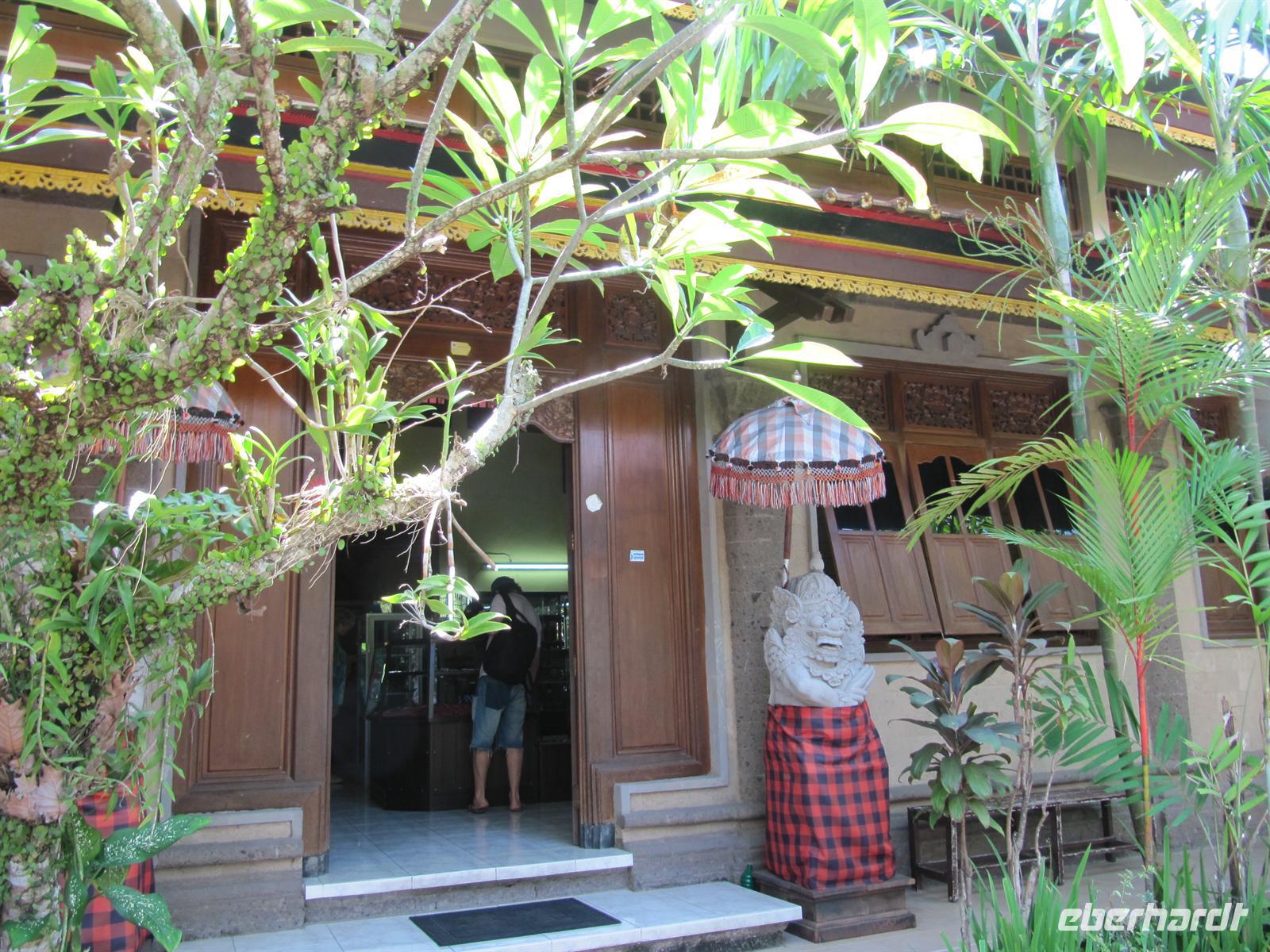 Unsere heutige Besichtigung des Inselparadieses Bali beginnen wir mit der sagenumwobene Elefantenhöhle „Goa Gajah". Wir betraten diese durch das aufgerissene Maul einer Dämonenfigur, die den Eingang der früher von hinduistischen Mönchen genutzten Grotte markiert. Im Inneren befindet sich eine Statue von Ganesha, dem elefantenköpfigen Sohn des Gottes Shiva, der wahrscheinlich der Höhle seinen Namen gab, und verschiedene Fruchtbarkeitssymbole. Am Nachmittag fahren Sie durch die bezaubernde Landschaft der Reisterrassen zum Künstlerdorf Ubud. Hier bestaunten wir die Arbeiten verschiedener Kunsthandwerker. Wir besuchten eine Batikwerkstatt, eine Holzschnitzerei, eine Silberwerkstatt und ein Maler-Atelier. In Ubud haben wir etwas Freizeit, viele gehen noch Geld wechseln oder einkaufen. Am späten Nachmittag erlebten wir eine Aufführung des traditionellen Kacak-Tanzes, bei dem das Gute symbolisch gegen das Böse kämpft. Die Tänzer mit nacktem Oberkörper und schwarz-weiß kariertem Sarong singen sich in Trance. Zurück im Hotel bekommen wir unser Abendessen.