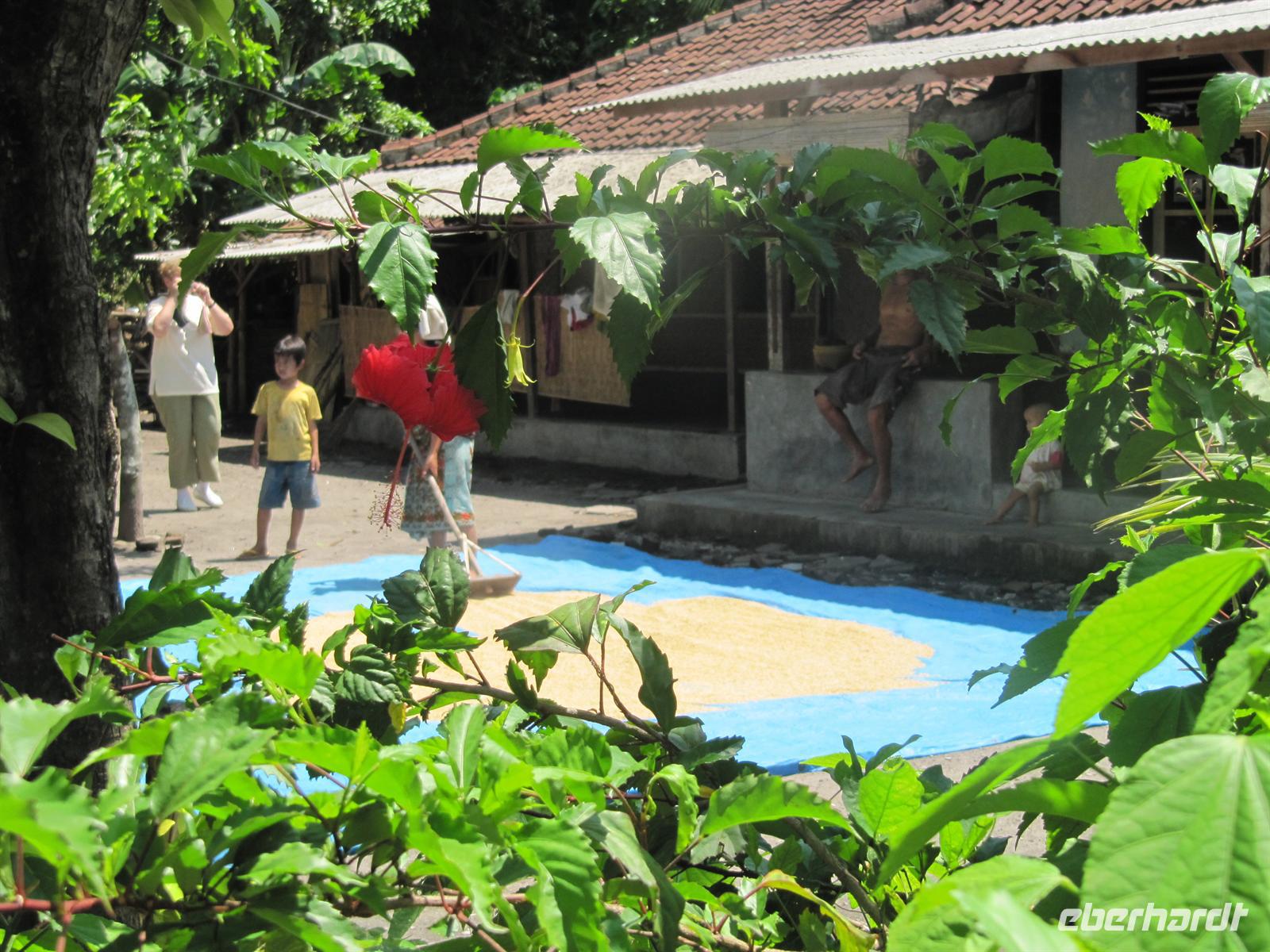 Die Insel Lombok ist im Gegensatz zu Bali muslimisch geprägt. Bei einem Ausflug erfahren wir mehr über die traditionelle Lebensweise der Sasak, der größten Bevölkerungsgruppe der Insel. Sie sind bekannt für ihre ursprünglichen, mit Alang-Alang Gras gedeckten Häuser und Reisspeicher, die wir bei einem Besuch in einem der traditionellen Dörfer besichtigen. Während unserer Fahrt über die Insel begegneten wir Menschen, die auf traditionelle Weise ihre Reisfelder bearbeiten, Pferdekutschen als Transportmittel nutzen und kleine Obststände mit exotischen Früchten anbieten. In Kuta (nicht zu verwechseln mit dem gleichnamigen Ort auf Bali) legten wir eine Pause ein. Wir nutzen die Gelegenheit zum baden und einige probierten auch eine Kokosmilch.