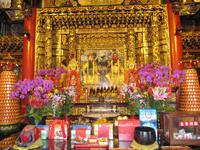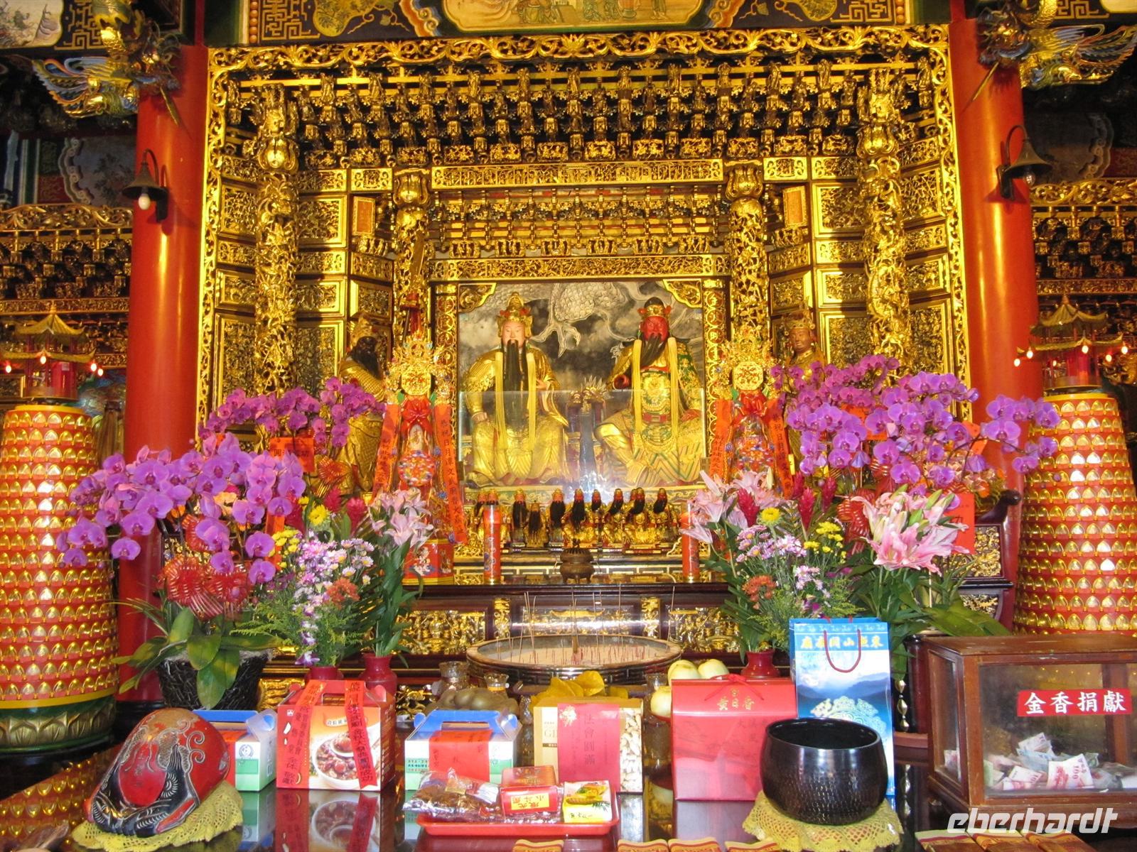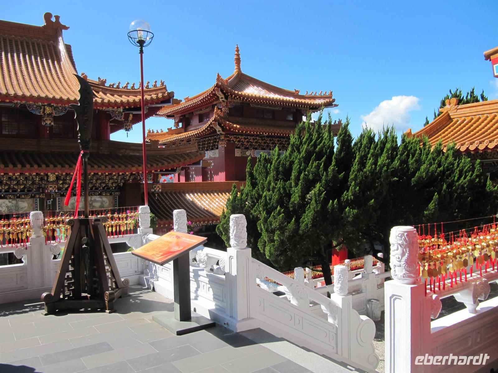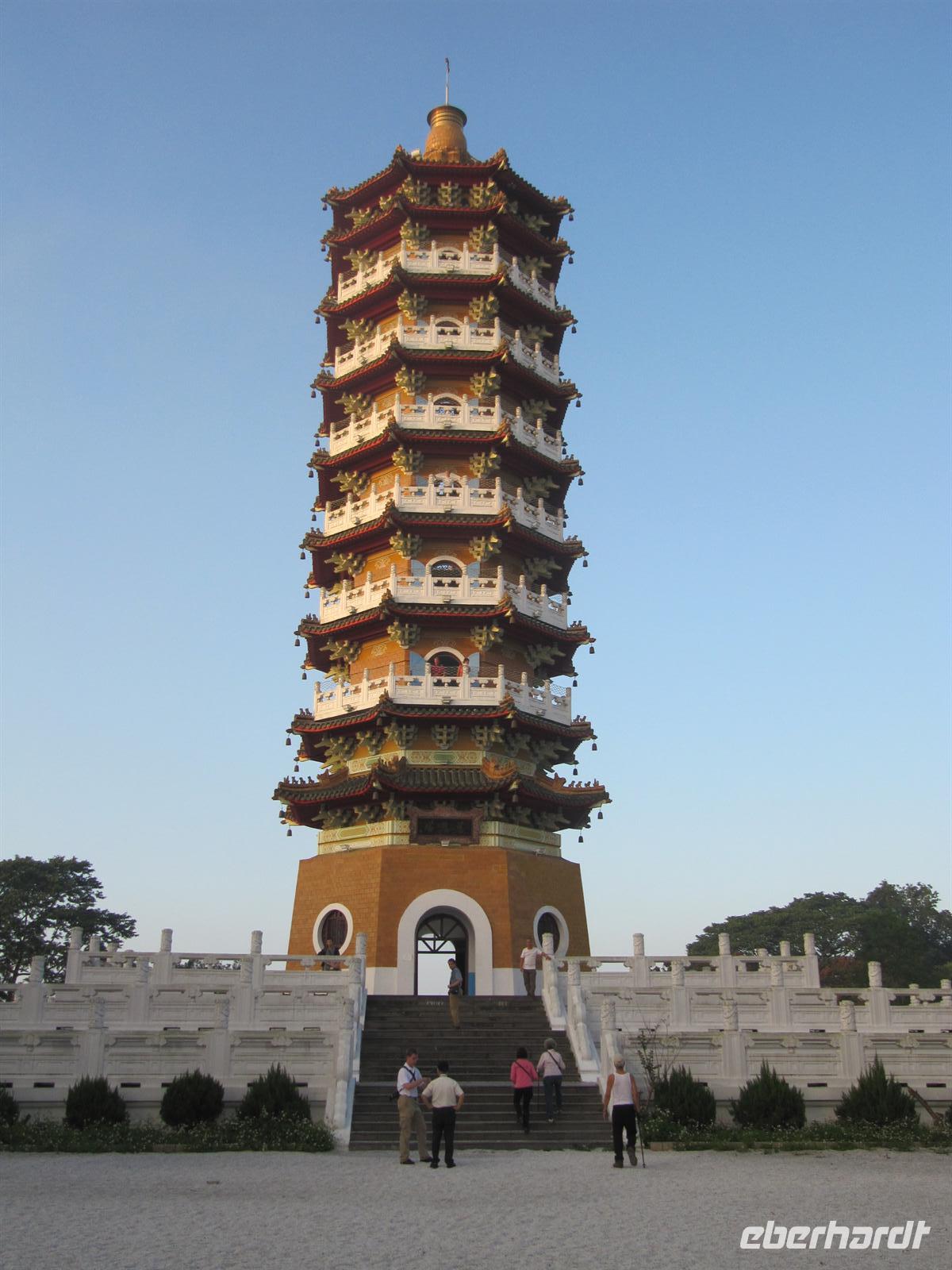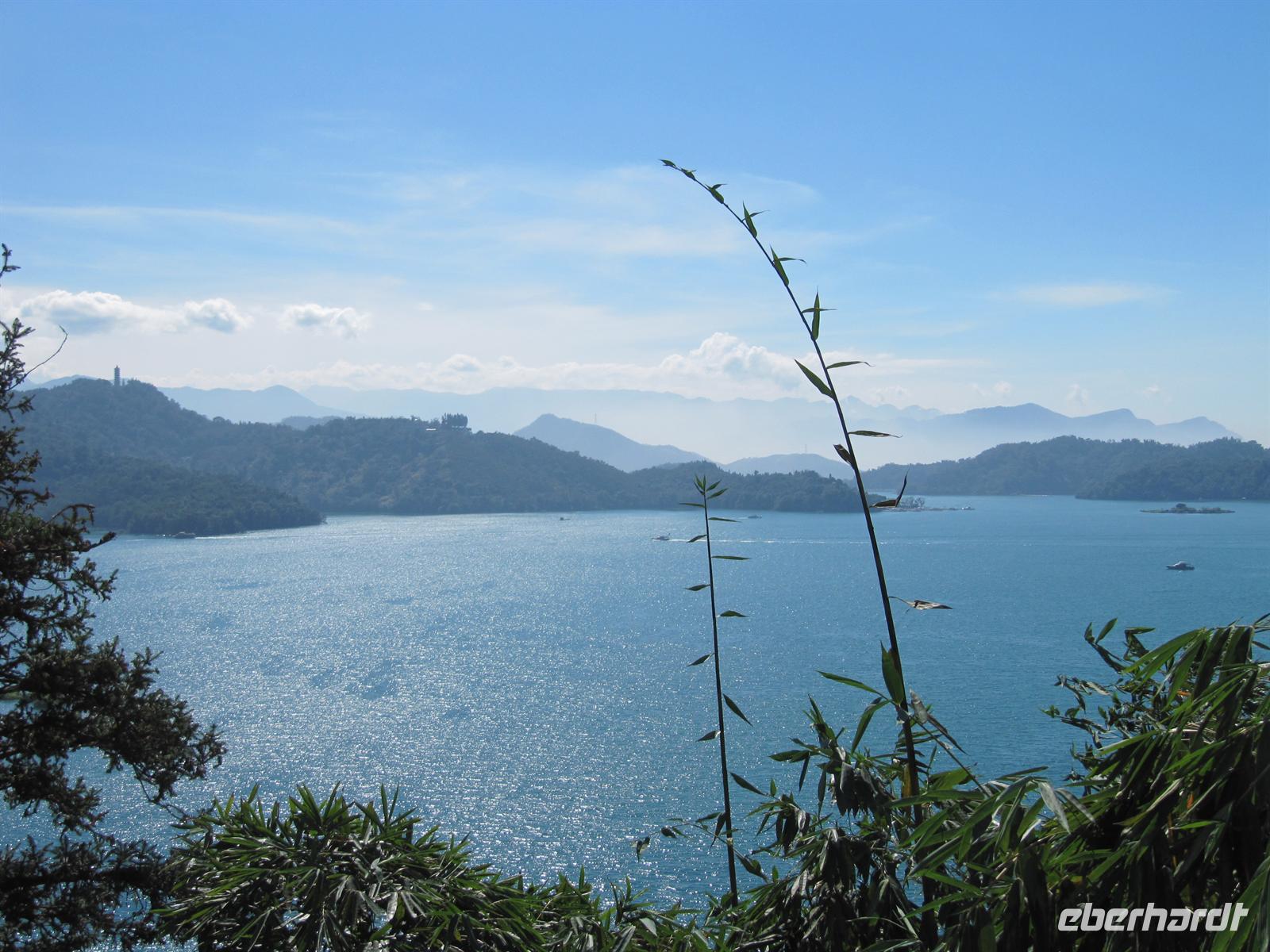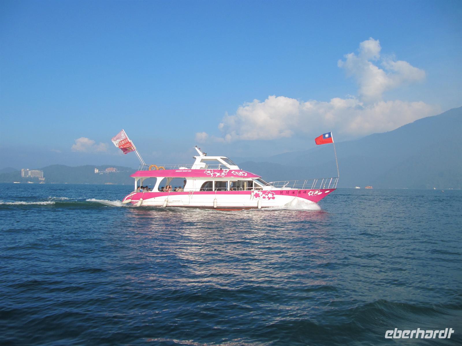 Heute besuchten wir den Sonne-Mond-See. Mit über 11km² ist er das größte Binnengewässer Taiwans. Zentral gelegen auf einer Höhe von ca. 760 m über NN bietet der See eines der schönsten Naherholungsgebiete Südost-Asiens. Der Name des Sees geht zurück auf die zwei Gewässer Sonnensee und Mondsee, deren Umrisse und chinesische Schriftzeichen den jeweiligen Himmelskörpern gleichen. 1939 wurden beide Seen durch eine Überstauung zusammengeführt. Um den See ranken sich einige Mythen und Legenden, so auch die Geschichte der „White Deer Hunter" (Weißhirsch-Jäger). Ein Stamm taiwanischer Ureinwohner, die „Ita Thao", sollen vor einigen hundert Jahren auf der Jagd nach einem seltenen weißen Hirsch gewesen sein. Die Jagd nach dem Tier hat den Stamm zum Sonne-Mond-See geführt. Überwältigt von dessen Anblick und dem reichhaltigen Angebot an Trinkwasser und Nahrung sollen die Ita Thao fortan ihr Stammeszentrum an den See verlagert haben. Zuerst besuchten wir am Nordufer des Sees den Wen Wu Tempel. Zwei jeweils 6 Meter hohe rote Löwen bewachen den Tempel. Auf 360 Stufen erklommen wir die Treppe zum Tempel-Eingang, wo uns ein farbenprächtiges Innenleben unter goldenen Dächern erwartet. Nach etwas Freizeit besuchten wir eine Tanzshow der Ureinwohner. Jetzt hieß es Leinen los und wir unternahmen eine Rundfahrt auf dem See. Auch wenn es schon etwas spät war spazierten wir noch zur Tzeen-Pagode ("Pagode der kindlichen Pietät"). Nach dem Aufstieg wurden wir mit einer grandiosen Aussicht belohnt. Nun wurde es dunkel und wir fuhren zurück nach Taipeh in das Flughafenhotel.