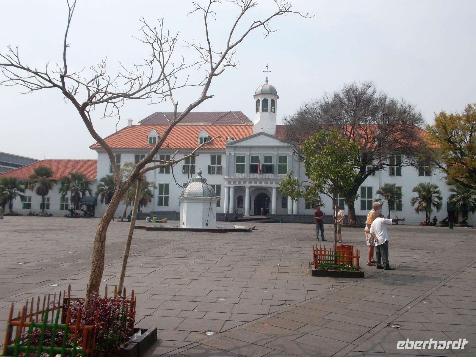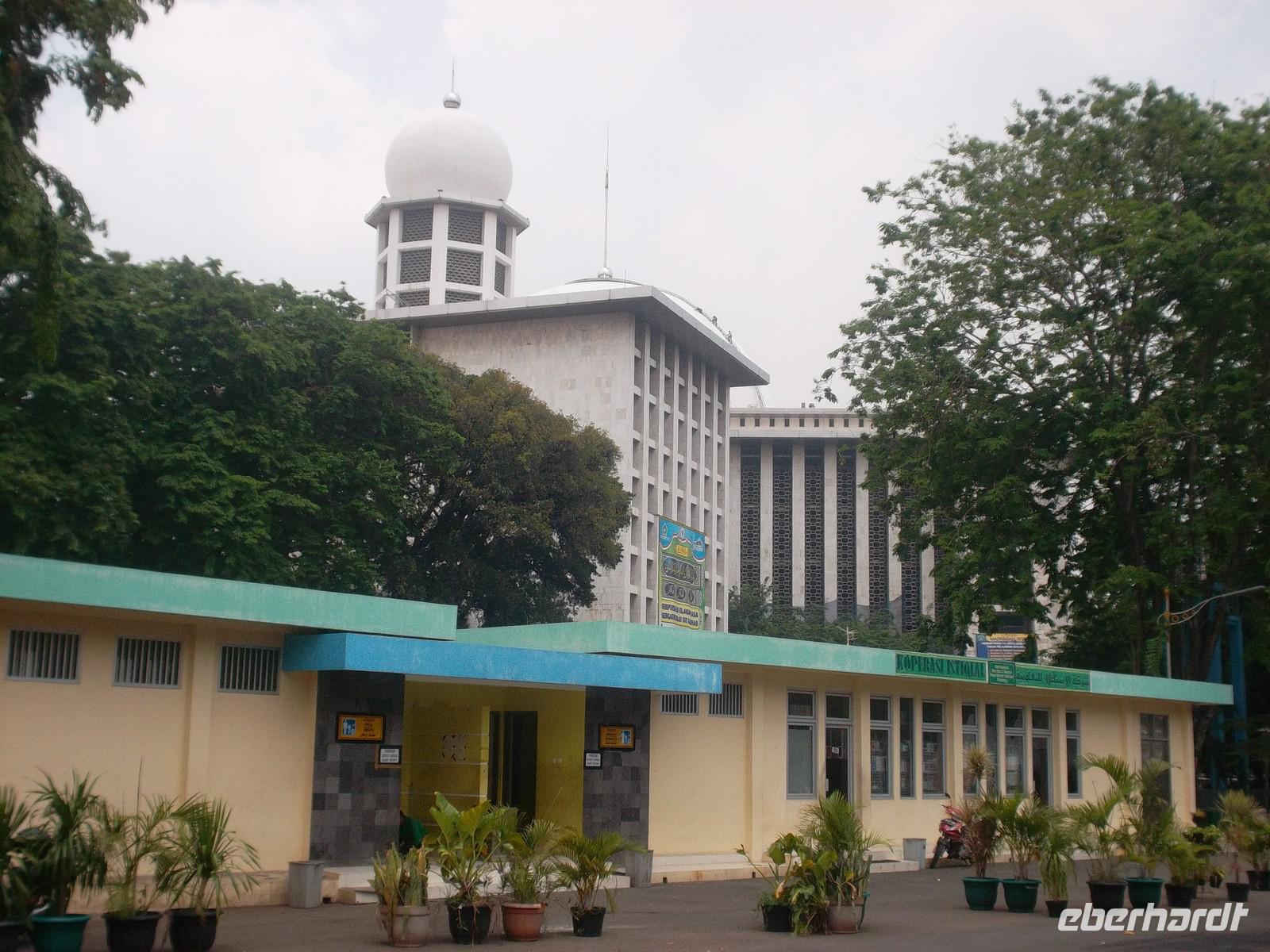 Die indonesischen Regierungsgebäude befinden sich in der Nähe des Platzes, ebenso wie die imposante Istiqlal-Moschee aus weißem indonesischem Marmor, die Platz für 120.000 Gläubige bietet. Der riesige, moderne Kuppelbau, entworfen von dem katholischen Architekten Silaban und schon 1961 unter Präsident Sukarno fertiggestellt, ist die zweitgrößte Moschee der Welt. Gleich daneben steht die katholische Kathedrale, im Jahre 1900 im neogotischen Stil mit 77 Meter hohen Türmen erbaut. Diese wurden - ohne dass man das bemerkt, nicht aus Stein, sondern aus Teakholz errichtet, war doch die vorherige Kathedrale aus dem Jahre 1833 nach 50 Jahren unter dem Gewicht der Türme zusammengebrochen.