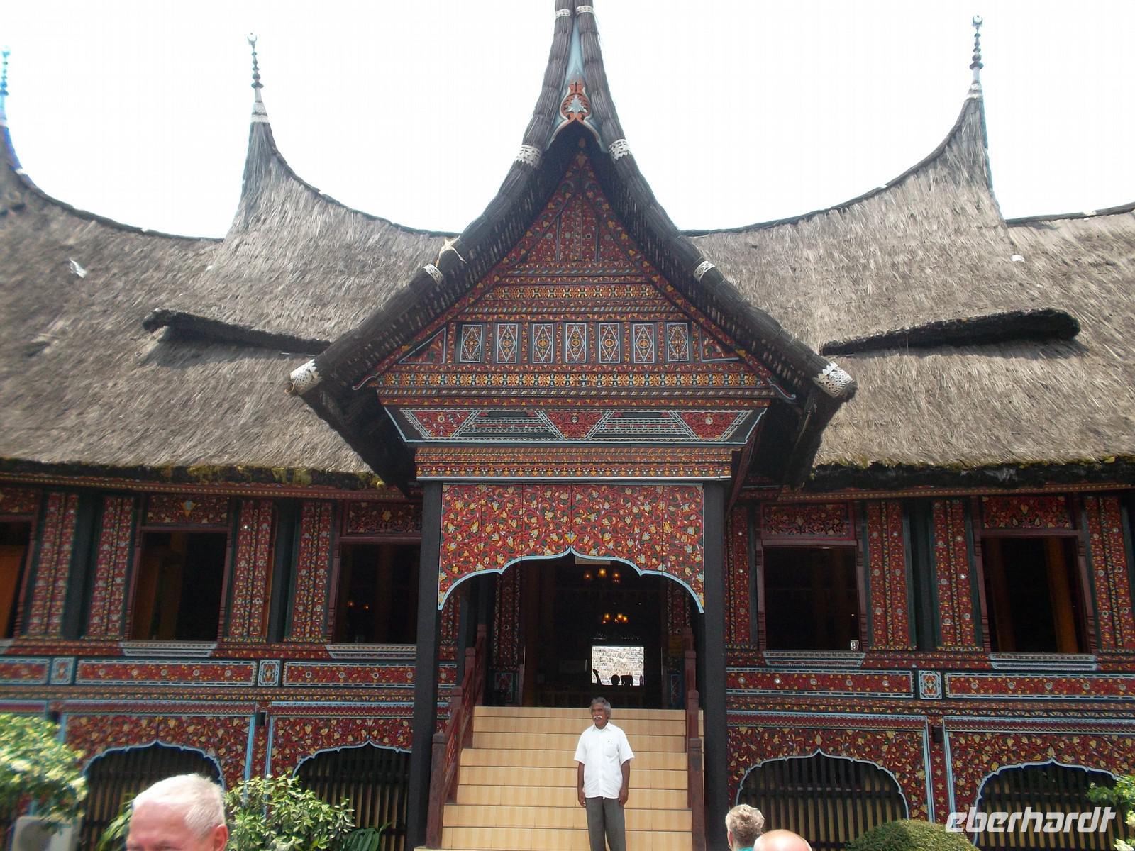 Als wir Jakarta verließen, hatten wir eine kleine Überraschung parat. Im riesigen Freilichtmuseum Taman Mini Indonesia werden verschiedene Typen von Häusern und Gehöften aus der ganzen indonesischen Inselwelt gezeigt. Hier sahen wir uns naturgetreue Nachbauten verschiedener Gebäudetypen aus Sumatra in Originalgröße an. Ein weiterer Höhepunkt war dann der Vogelpark, in dem alle einheimischen Vögel Indonesiens zu finden waren - eine bunte, exotische und sehr interessante Besichtigung.