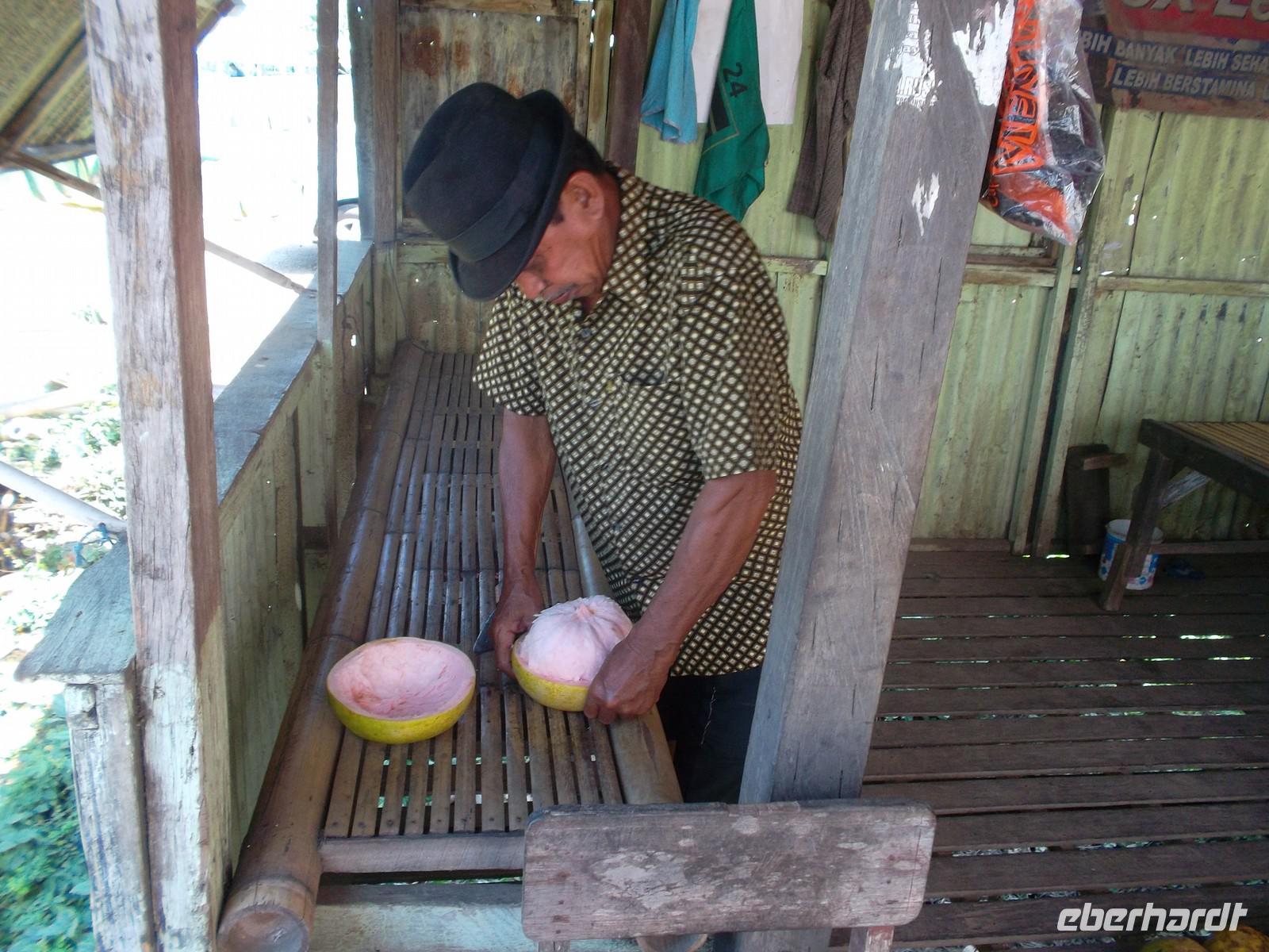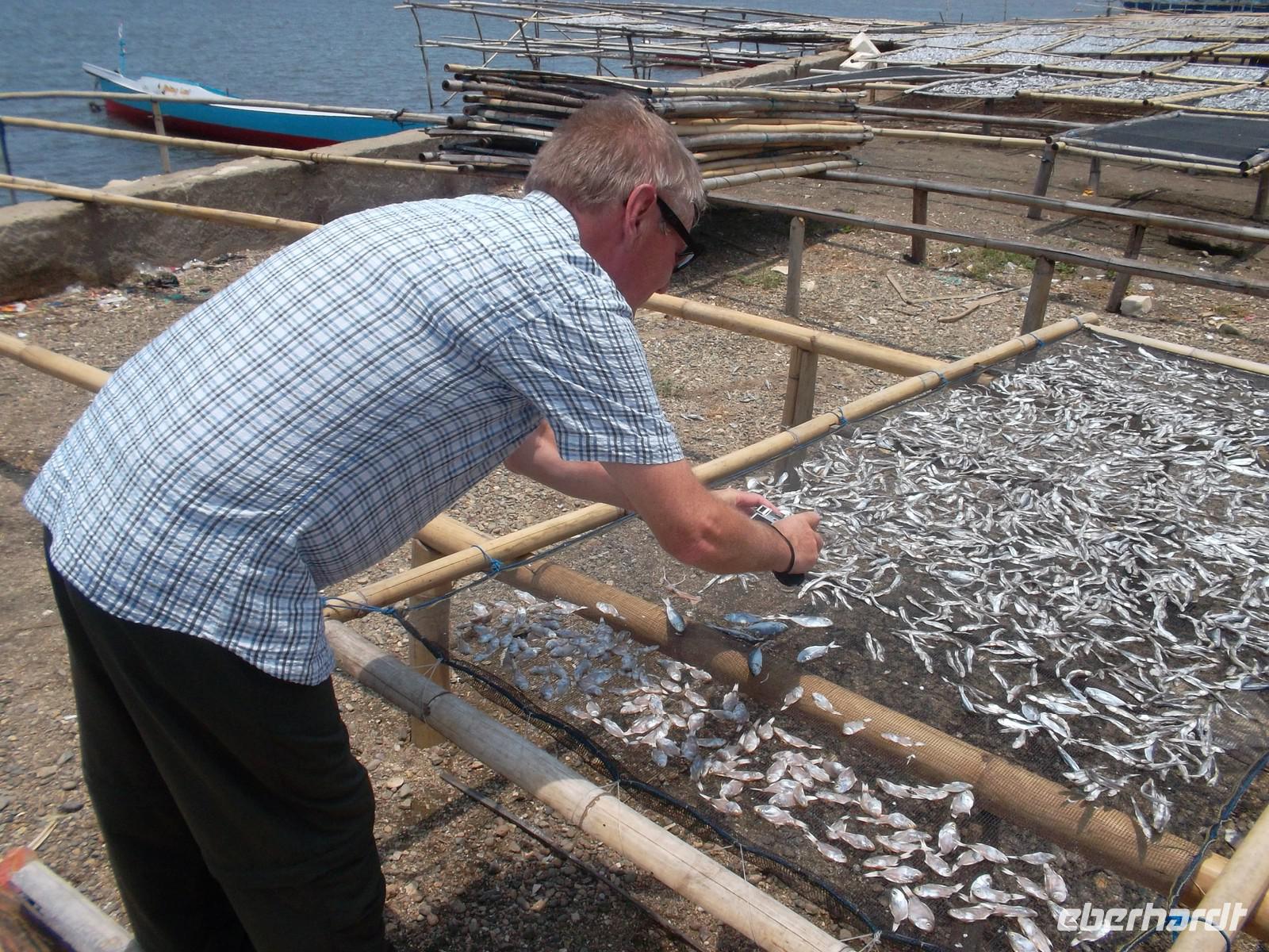 Unterwegs konnten wir Riesenpampelmusen verkosten (immerhin so groß wie Fußbälle) und im Fischerdorf Padaelo machten wir einen Spaziergang durch ein traditionelles Zentrum der Fisch-Trocknung. Gewaltige, mit Netzen bespannte Gestelle zwischen den Häusern und dem Strand dienen dazu, den „Fang des Tages"marktgerecht in der Sonne zu dörren. Nach dem Mittagessen in der Fischerstadt Pare Pare wich die Straße von der Küste ab und verlief weiter kurvenreich im Gebirge. Zur Kaffeepause erreichten wir die seltsam geformten „erotischen Hügel", wo wir Kaffee tranken und süßen Palmkuchen verkosten konnten, bevor war das Torajaland betraten. Symbolisch weist ein Tor über der Straße die Einfahrt in das vom übrigen Land abgetrennte „Tana Toraja" - denn das Land der „Ureinwohner" ist etwas Besonderes und gewiss eines der touristischen Highlights Indonesiens.