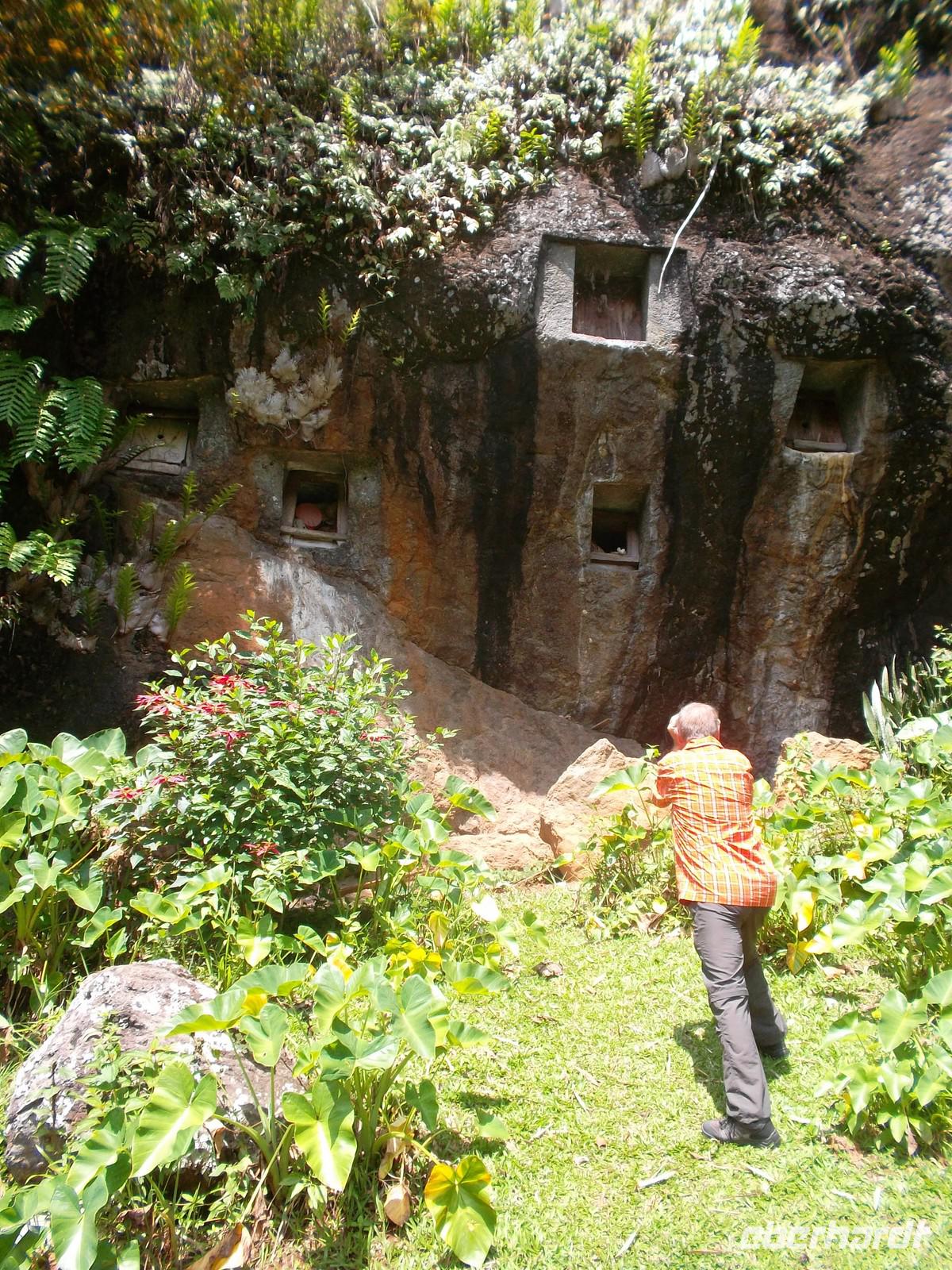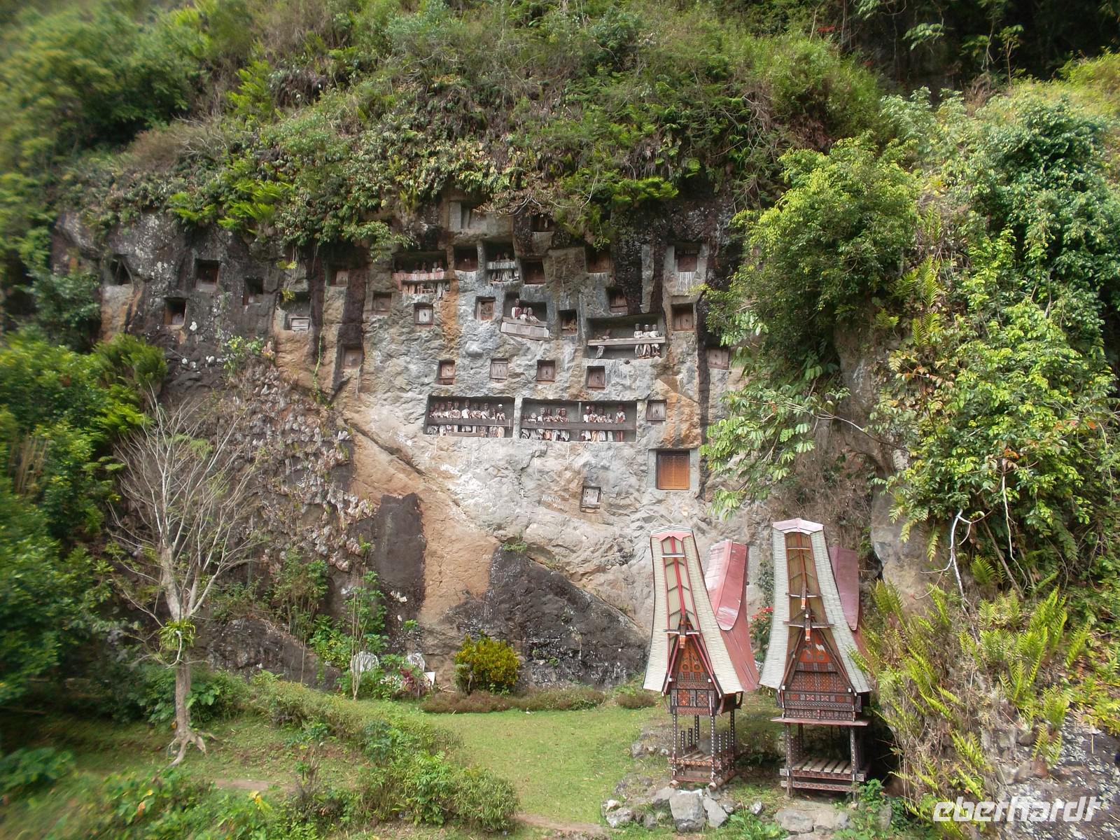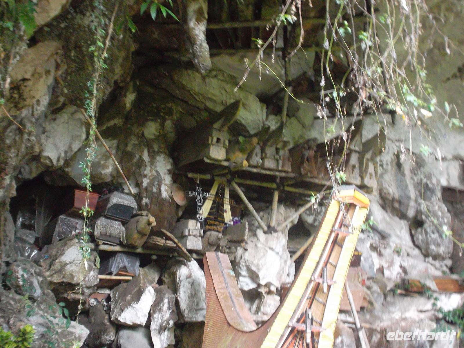 Eine der schönsten Sehenswürdigkeiten erlebten wir gleich zu Anfang: beim Torajadorf Lemo gibt es in einer Felswand die berühmten „Ahnengalerien". Als Dekoration der zahlreichen Felsengräber in der fast senkrecht aufstrebenden Felswand haben die Einwohner hunderte Tau Taus, Totenpuppen, in großen Galerien stehen. So wird der Eindruck vermittelt, ein ganzes Dorf winke von der Felsenwand herunter. Diese Figuren werden von Holzschnitzern nach dem Abbild eines Verstorbenen geschnitzt, zeigen oft die realistischen Gesichtszüge des Verstorbenen und erhalten auch eine Kleidung. Sie werden vor den Gräbern von Verstorbenen aufgestellt oder bewachen - wie hier - ein ganzes Ensemble von Begräbnisplätzen.