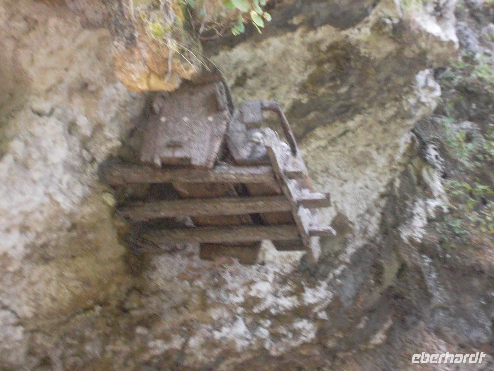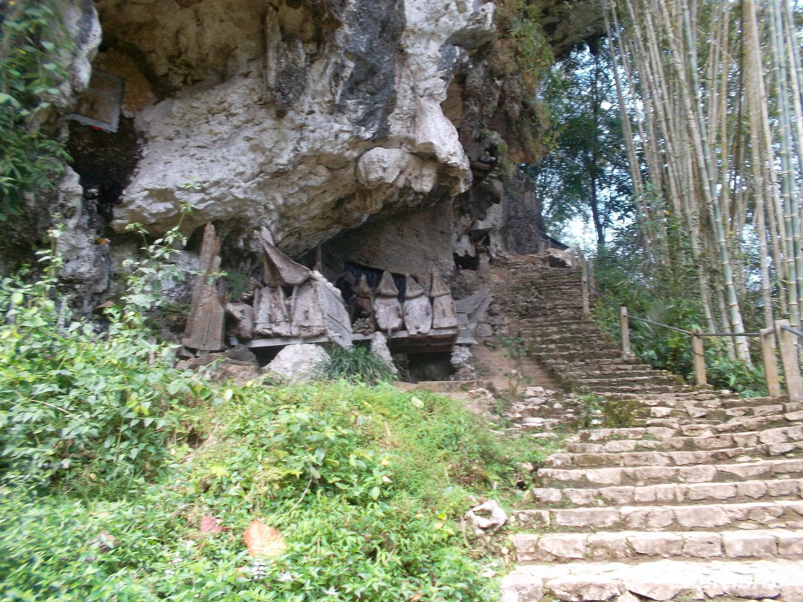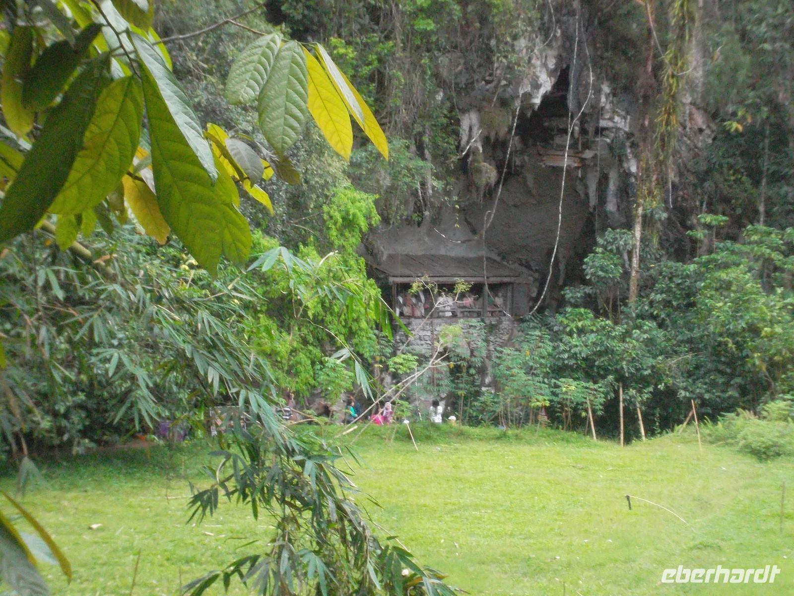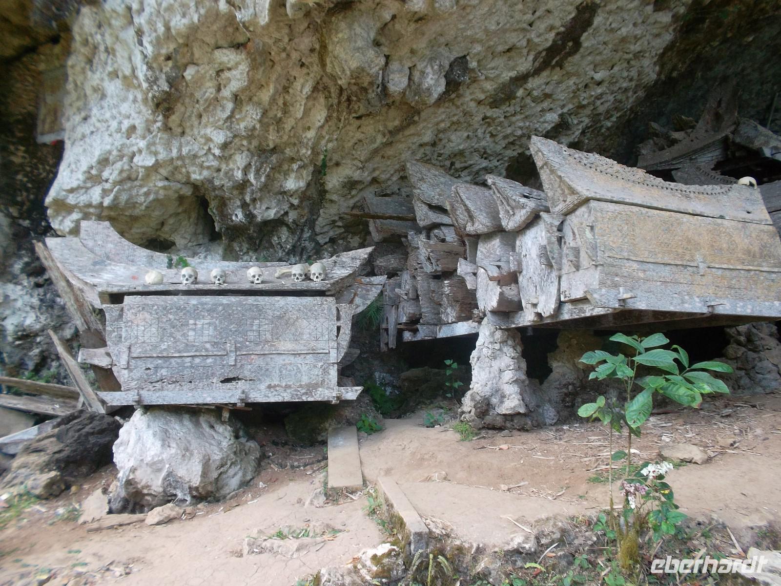 Eine der schönsten Sehenswürdigkeiten erlebten wir gleich zu Anfang: beim Torajadorf Lemo gibt es in einer Felswand die berühmten „Ahnengalerien". Als Dekoration der zahlreichen Felsengräber in der fast senkrecht aufstrebenden Felswand haben die Einwohner hunderte Tau Taus, Totenpuppen, in großen Galerien stehen. So wird der Eindruck vermittelt, ein ganzes Dorf winke von der Felsenwand herunter. Diese Figuren werden von Holzschnitzern nach dem Abbild eines Verstorbenen geschnitzt, zeigen oft die realistischen Gesichtszüge des Verstorbenen und erhalten auch eine Kleidung. Sie werden vor den Gräbern von Verstorbenen aufgestellt oder bewachen - wie hier - ein ganzes Ensemble von Begräbnisplätzen.