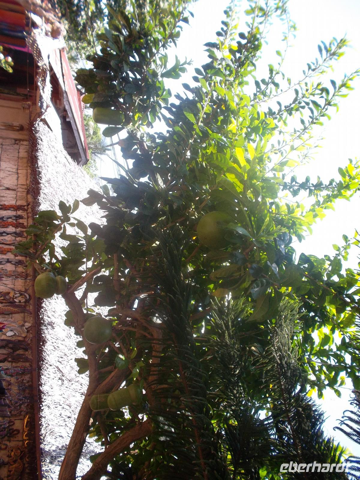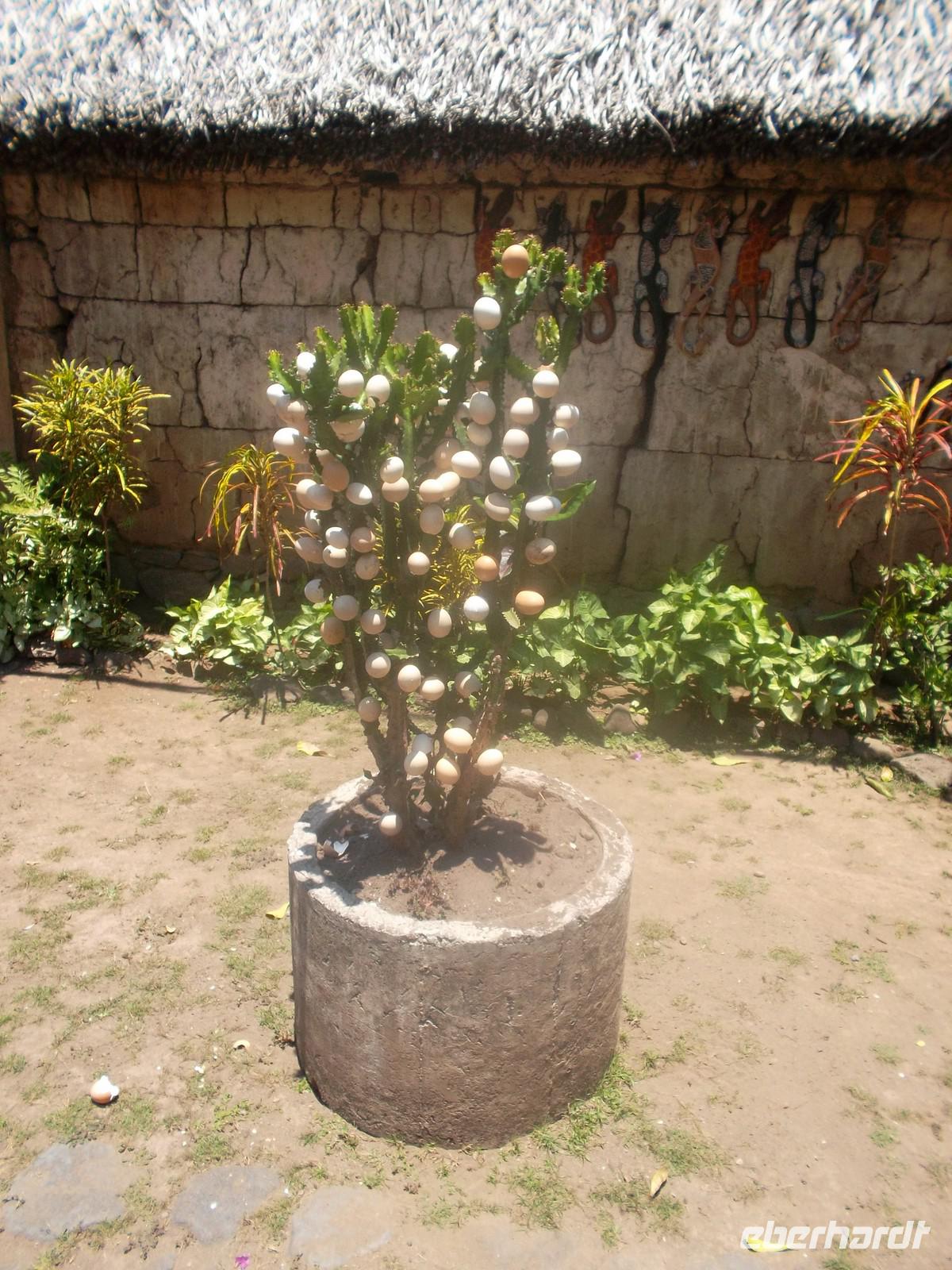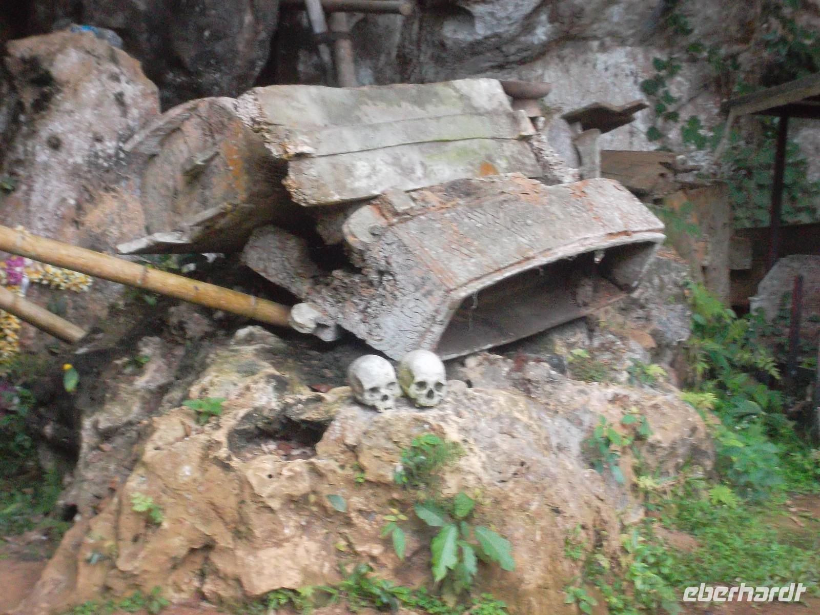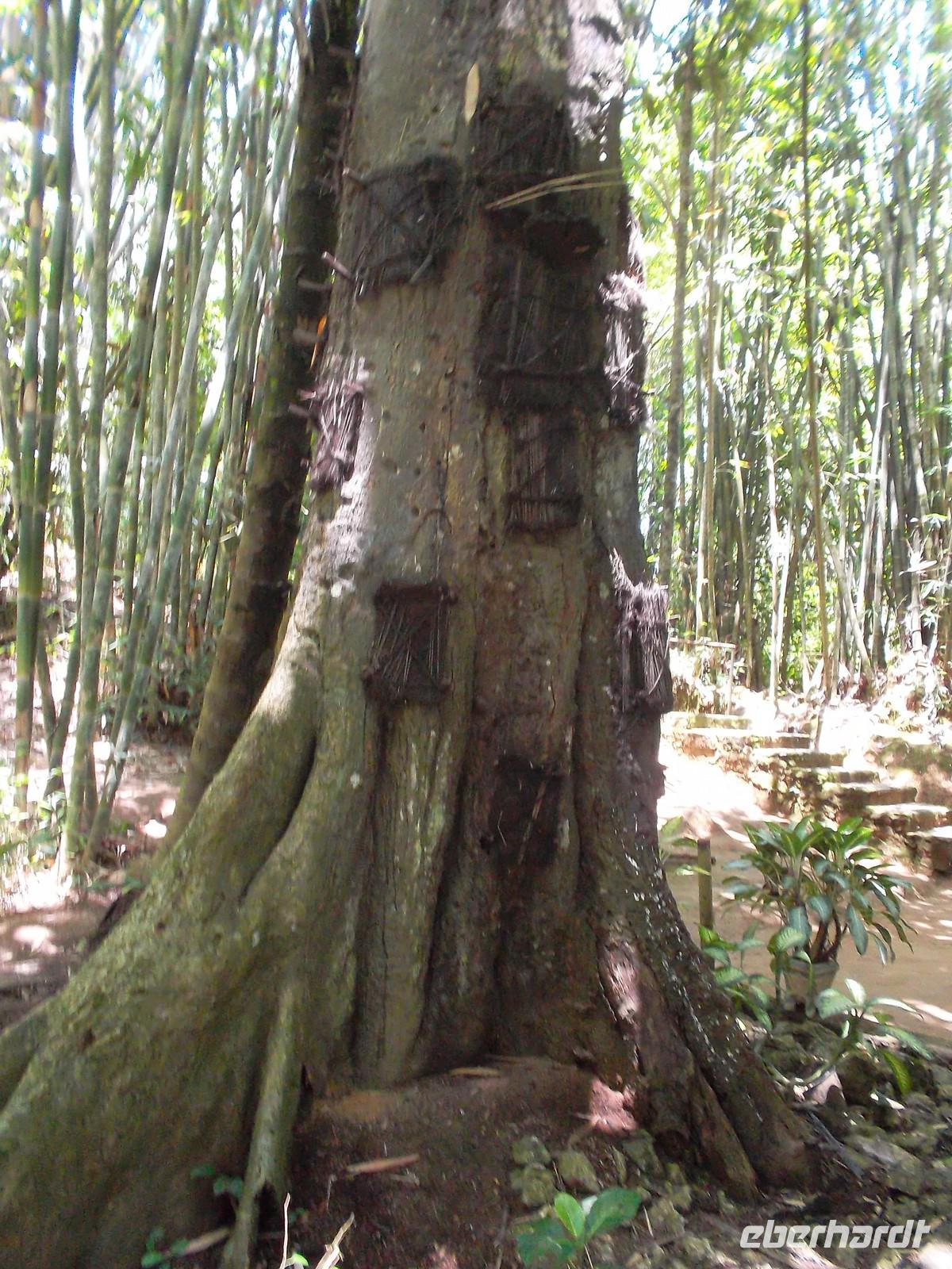 Als nächstes faszinierten uns die Babygräber von Kambiri. Im Stamm eines riesigen Kautschukbaumes finden sich in unterschiedlicher Höhe hineingeschnittene Vertiefungen, verschlossen durch kleine geflochtene Bambustüren. Hier ist für die Torajas eine Begräbnisstätte für Kinder, die sehr klein gestorben waren, noch bevor sie die ersten Zähne bekamen. Im Glauben der Torajas sind diese noch nicht richtig in die Familie integriert und werden durch die Natur zurückgefordert. Man bestattet sie in einem Baumloch, das mit einer kleinen Pforte verschlossen wird. Der Baum gibt dem Kind Milch und die Natur nimmt den Körper an, indem der Baum wieder zuwächst. Fällt dann die Bambustür irgendwann ab, weiß die Familie, dass das Kind zurückgekehrt ist und die Natur später ein gesundes Kind schenkt.