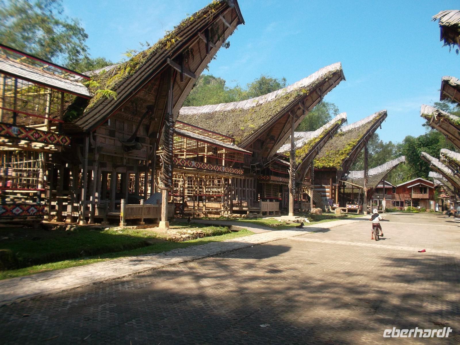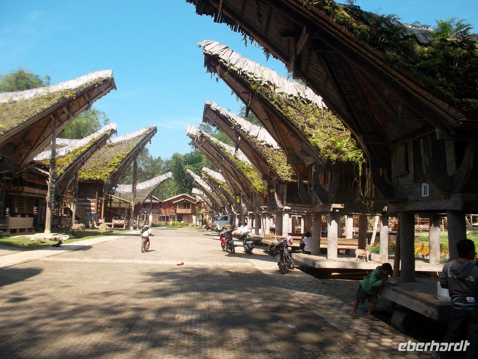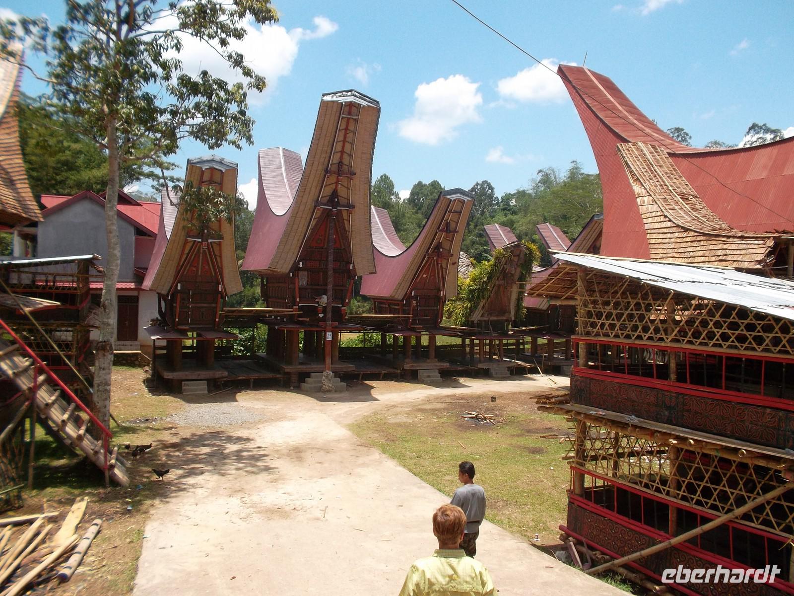 Wir machten uns auf den Weg zu einer Besichtigung des Vorzeigedorfes Kete Kesu. Die gesamte Dorfstraße wird gesäumt durch riesige, traditionelle bunte Clanhäuser und ihnen gegenüberstehende reichverzierte Reisspeicher. Nirgendwo sonst gibt es eine solche Ansammlung charakteristisch geschwungener, mit Schilf und Bambus gedeckter hoher Satteldächer und Fassaden von Clanshäusern, mit vielen hier prangenden Büffelhörnern -Überbleibsel von Büffelopfern, die bei den Begräbnissen vollzogen werden.