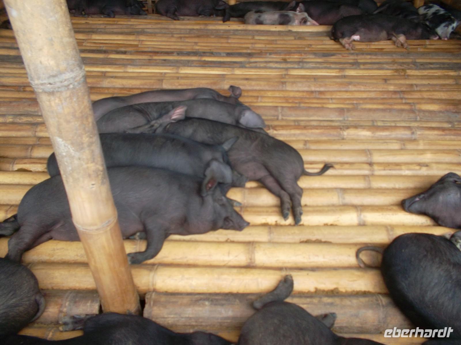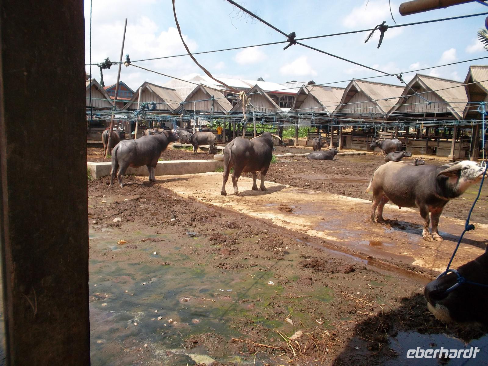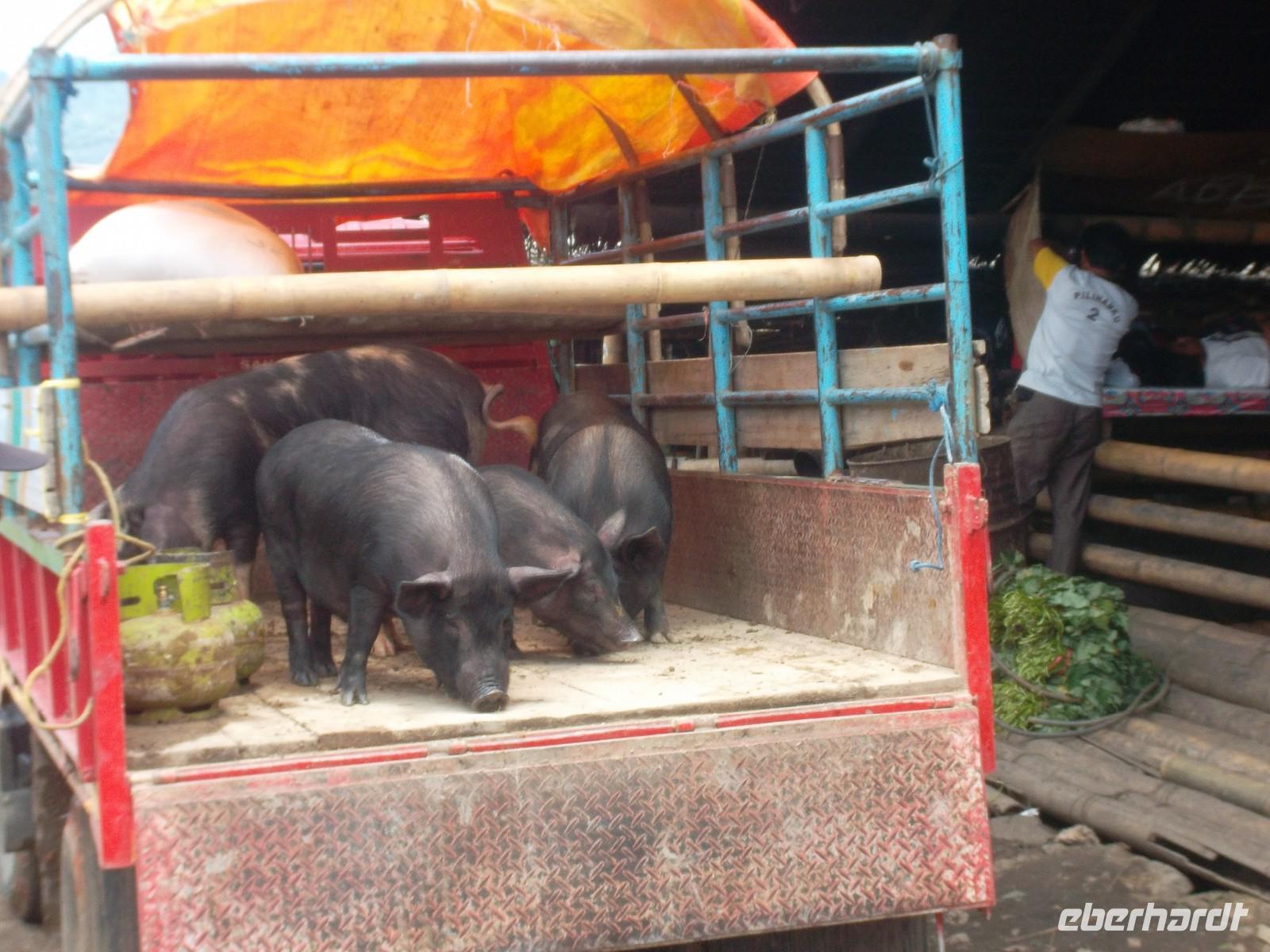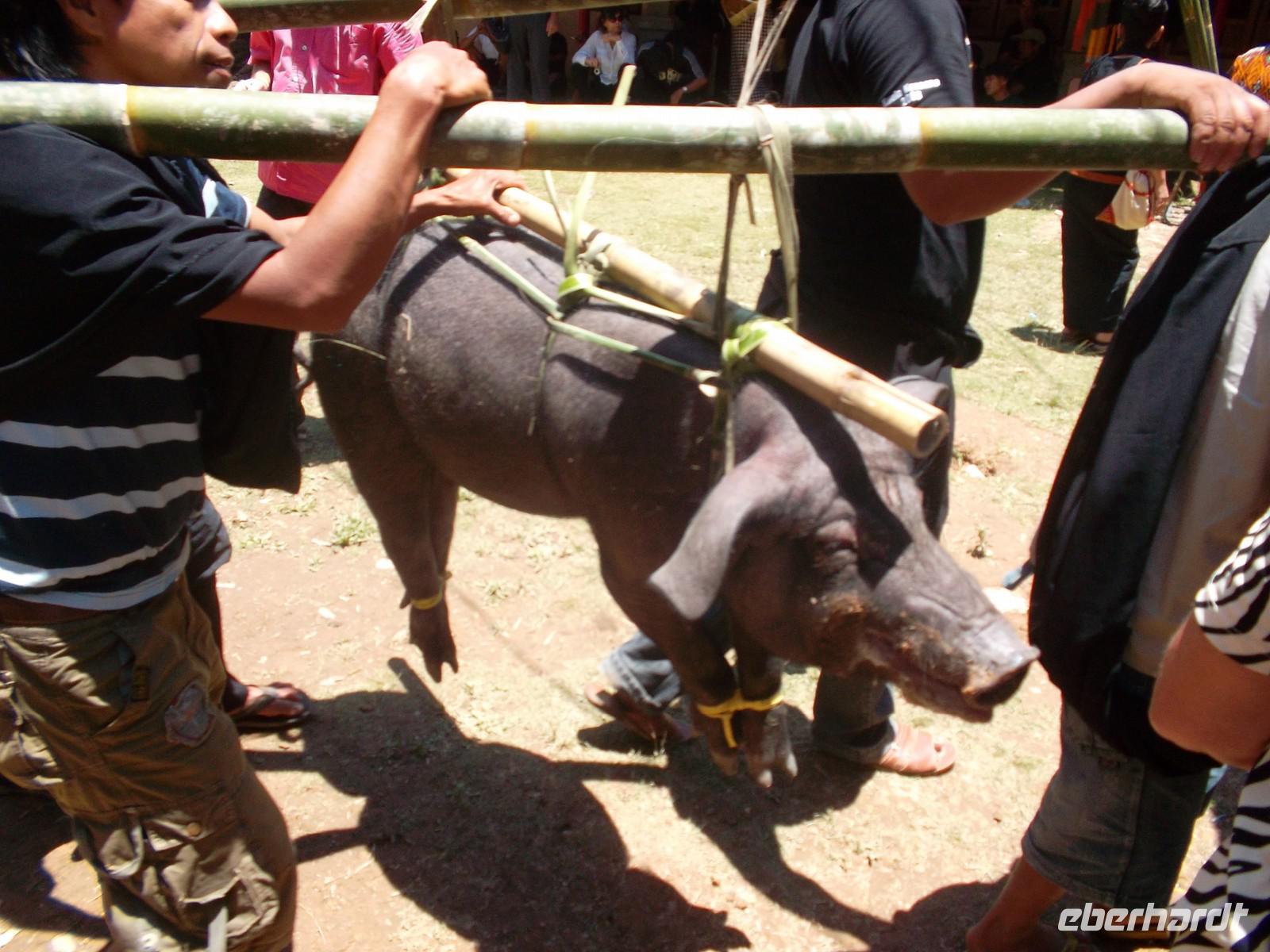 Dann fuhren wir nach Rantepao zurück und statteten dem Büffelmarkt der Torajastadt einen Besuch ab: Dutzende Büffel stehen hier „überdacht", auch wenn kein Markttag ist, da ihre Besitzer von weither kommen, um auf Käufer zu warten. Auch die Abteilung „Schweineverkauf" sahen wir uns noch an, bevor wir am Nachmittag Gelegenheit hatten, an einer Begräbniszeremonie teilzunehmen.
