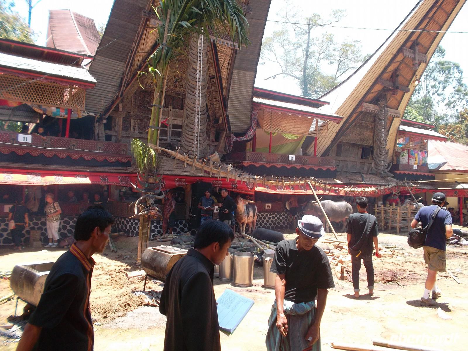 Die uralten Sitten der Toraja sind für uns schwierig zu verstehen und viele ihrer Elemente nicht unbedingt für den modernen Mitteleuropäer geeignet. Manche der geladenen Gäste bringen ganze lebende Schweine - an Bambusgestellen festgebunden und durch Träger herangeschleppt - als Geschenke mit. Da wir kein Geschenk hatten, kauften wir Zigaretten, um nicht mit leeren Händen zu kommen. Dafür erhielten wir sogar einen Ehrenplatz, bekamen Getränke und Snacks angeboten und konnten der Zeremonie zusehen, bei der hunderte Gäste und Akteure durcheinanderwimmelten, und konnten fast wie Familienangehörige an den Feierlichkeiten teilnehmen. Die Toraja glauben, dass ein Erdenleben nur ein Übergang ist und beim Tod eines Menschen die Seele zwar den Körper verläßt, aber in der Umgebung bleibt. Der Leichnam wird einbalsamiert und im hinteren Teil des Hauses aufgebahrt. Das Begräbniszeremoniell wird später vollzogen, was teilweise Jahre dauern kann. Denn je höher das Ansehen des Toten ist, umso mehr Wasserbüffel müssen bei dem Fest geopfert werden. Das dauert mehrere Tage und es nehmen hunderte Personen teil, wodurch solche Feierlichkeiten zum finanziellen Ruin führen können. Wir kamen gerade zurecht, um eine Klage- und Ehrerbietungszeremonie sowie den Empfang einer Großfamilie vor den Höhepunkten des Festes mitzuerleben. Der Zug bestach durch eine unglaubliche Vielfalt an bunten Gewändern und traditioneller Kleidung. Als die von buntkostümierten Vortänzern angeführten Gäste hereinkamen, erhob sich ein unglaublicher Lärmpegel, begleitet von traditionellen Gesänge und Musik. Vielleicht haben wir heute die stärksten Eindrücke der gesamten Reise bekommen, den Eindruck dieser Zeremonie, an der wir etwa eine Stunde teilnahmen.