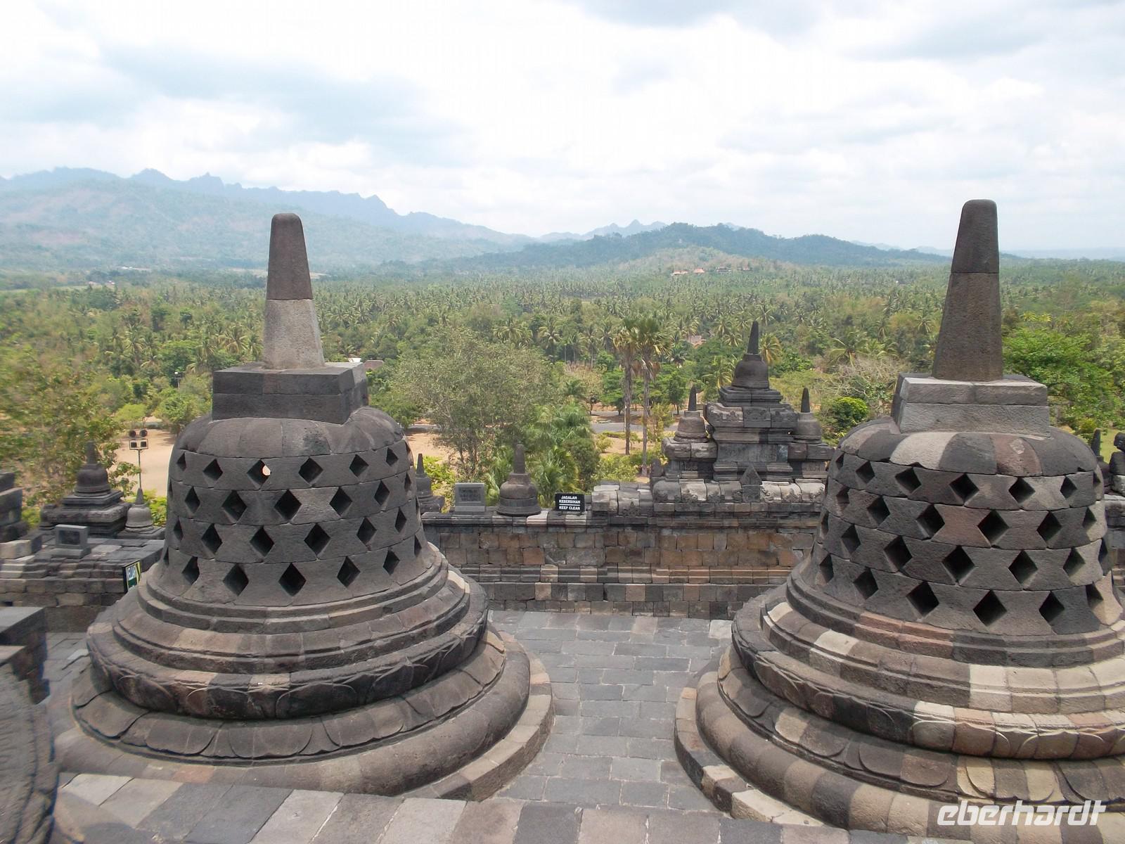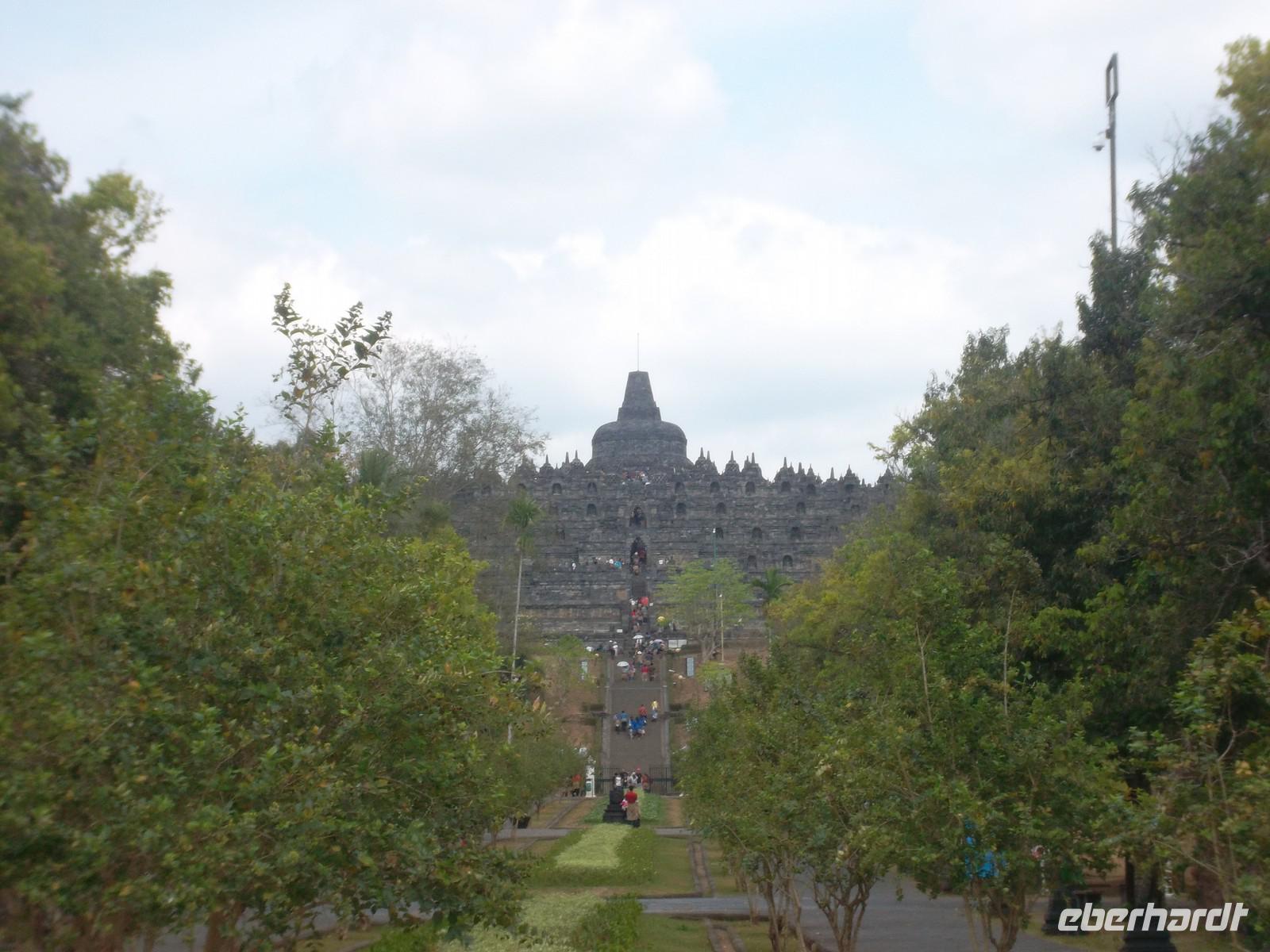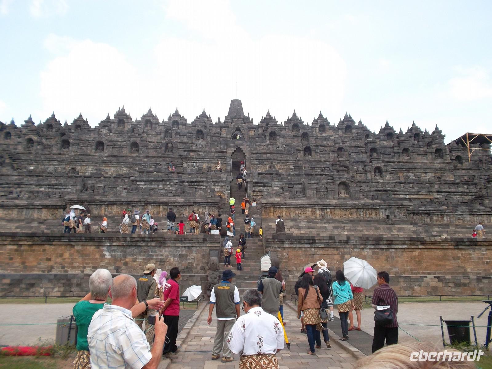 Der Tempel ist neun Stockwerke hoch und steht auf einer quadratischen Basis von etwa 125 m Kantenlänge, auf der die ersten Etagen vier sich stufenartig verjüngenden Galerien bilden. Hier kann man die Tempelanlage auf jeder Stufe umrunden und hier befinden sich größtenteils gut erhaltene Flachreliefs in der Gesamtlänge von über fünf Kilometern, die das Leben und Wirken Buddhas und die Legenden um seine Person und seine Lehre beschreiben. Darüber liegen drei abgestufte Terrassen mit insgesamt 72 Stupas, die eine Hauptstupa von fast 11 m Durchmesser umrahmen. In allen dieser glockenförmigen Tempel befinden sich Buddhastatuen, die mit uns, den Besuchern, den herrlichen Ausblick auf die Umgebung und - wenn die Witterung es erlaubt.- auf den „Vater der Vulkane", den Merapi, teilen.