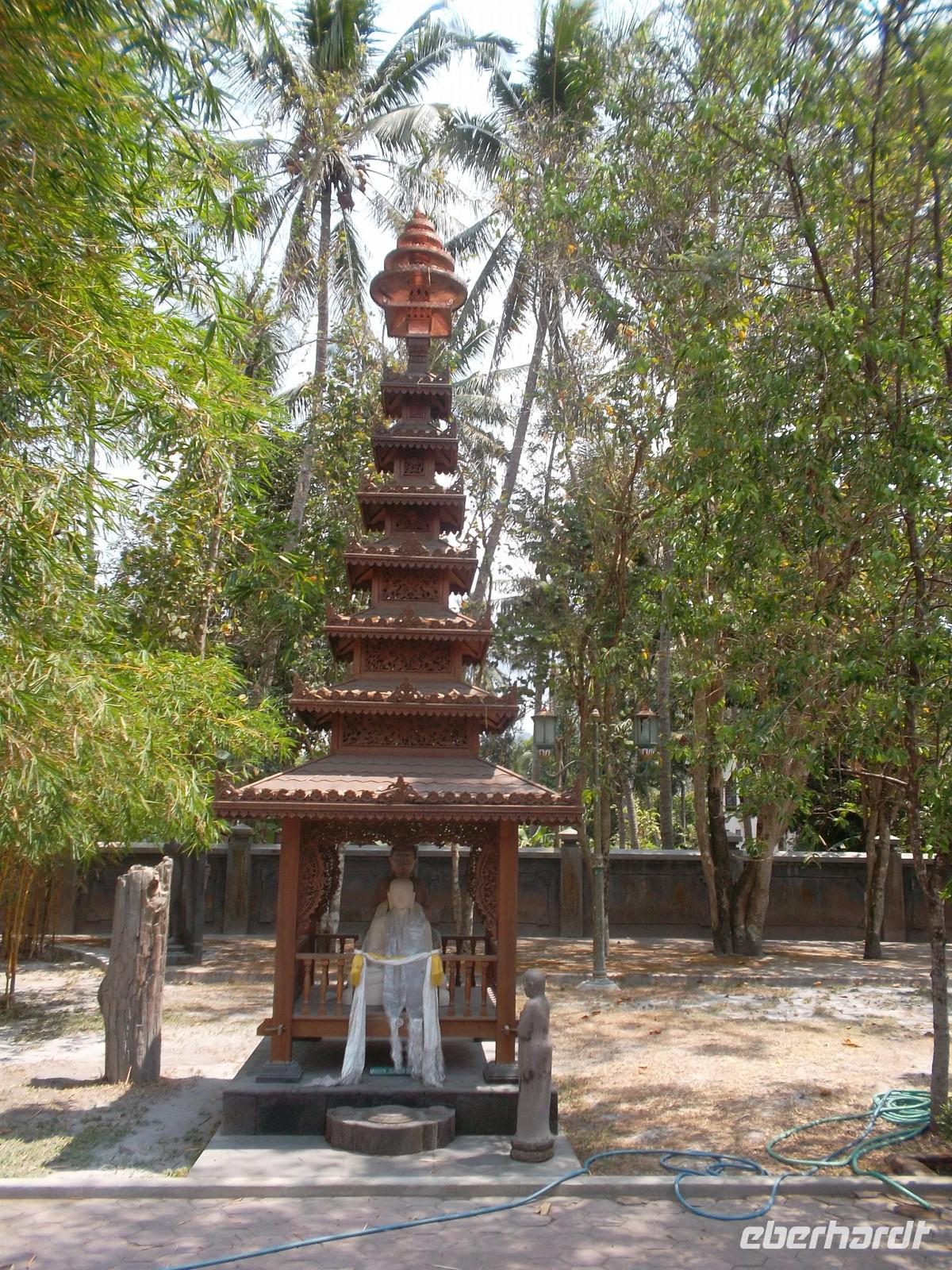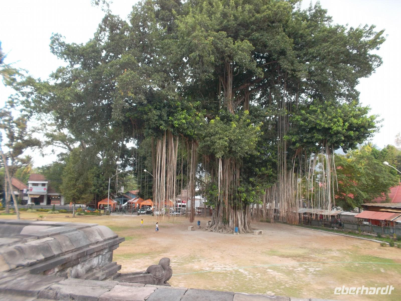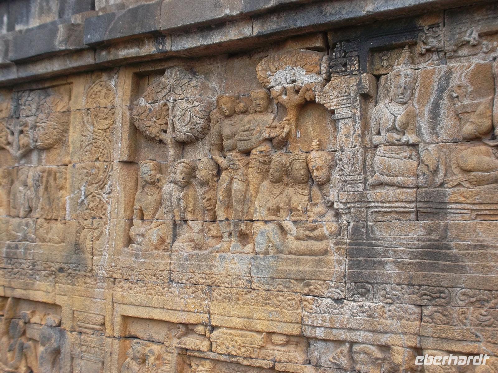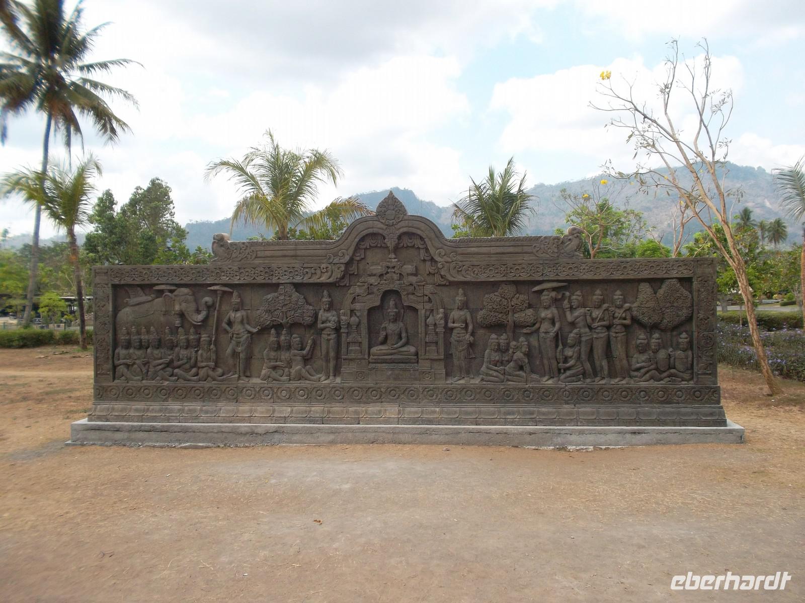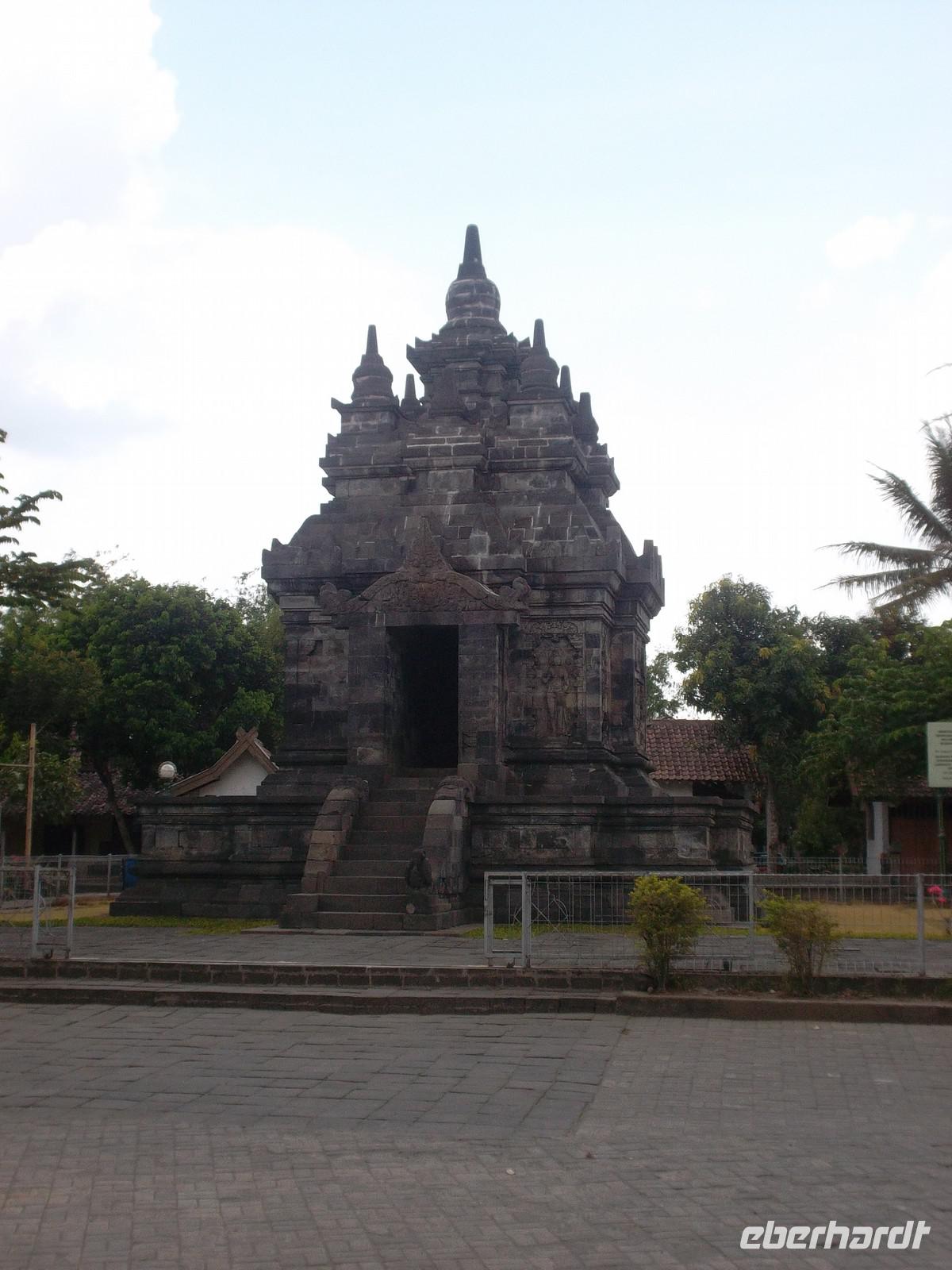 Nach beeindruckendem Besuch des Borobodur konnten wir zwei kleine Extras - ganz im Sinne von Eberhardts „Richtig reisen!"-Strategie - einbauen: zunächst den kleinen, eher unscheinbaren „Candi Polowan" und dann den Besuch des Candi Mendut. Letzterer - Candi bedeutet im Javanischen etwa „Tempel" - ist ein bedeutendes Heiligtum mit einer Besonderheit: er beherbergt den einzigen Buddha, der „europäische" Beinhaltung zeigt - also nicht mit untergeschlagenen Beinen, sondern mit vor dem Stuhl auf den Boden gestemmten Beinen, dargestellt ist.
