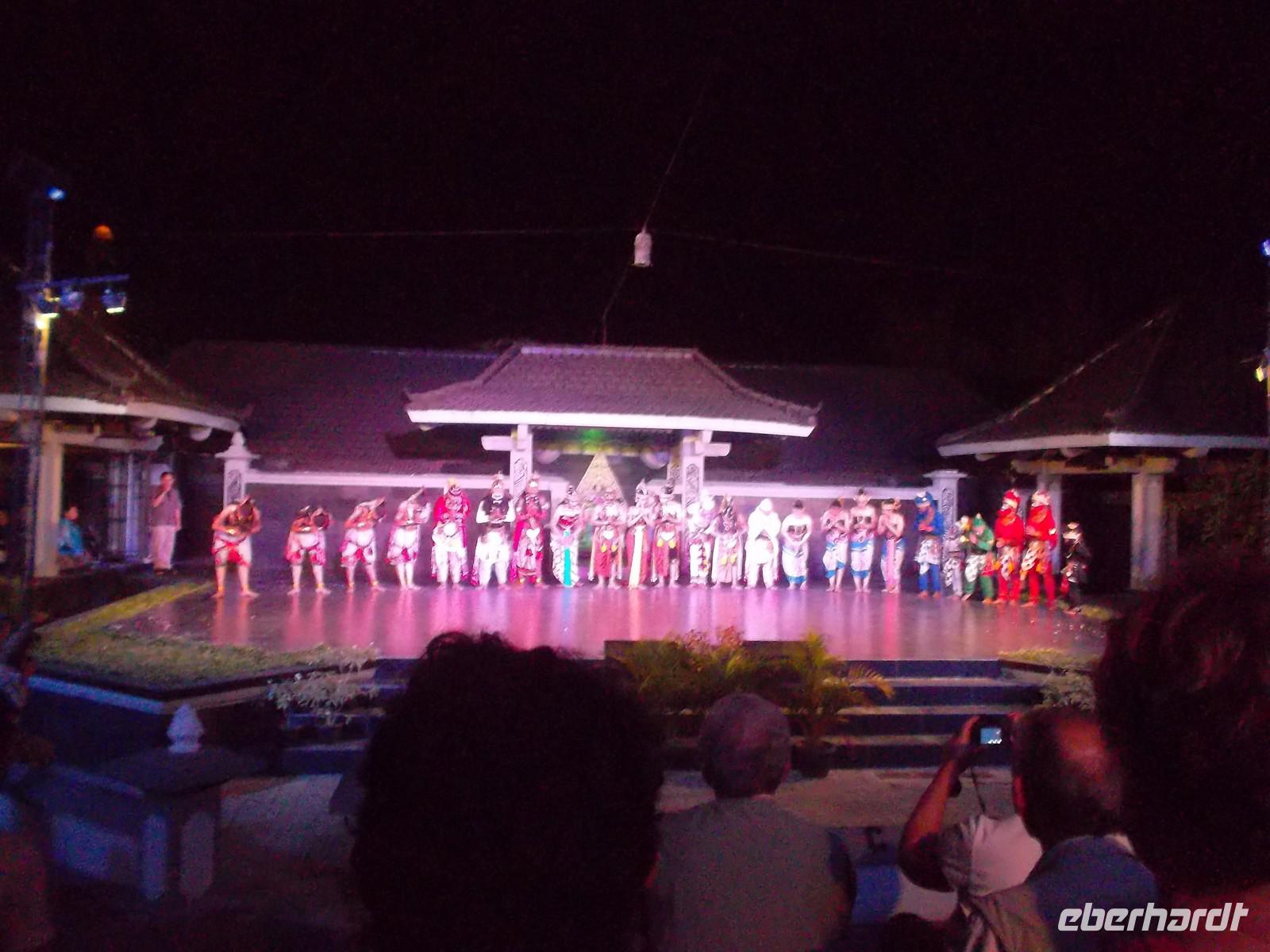 Nach der Rückkehr ins Hotel gab es eine kleine Ruhepause, bevor wir zum Abendessen ins Theater fuhren. Nach einem javanischen gab es eine Aufführung des indischen Heldenepos „Ramayana" in seiner indonesischen Version. Mit an Akrobatik grenzender Geschicklichkeit tanzten die in herrliche exotische Gewänder gekleideten Akteure die Geschichte des Kriegergottes Rama, der seine vom bösen Dämonen Ravana entführte Frau Sita zurück erkämpft. Das Stück erzählt vom Bemühen Ramas, seines Freundes Hanuman und ihrer Getreuen, das Böse zu besiegen. Begeistert vom Stück kehrten wir ins Hotel zurück.