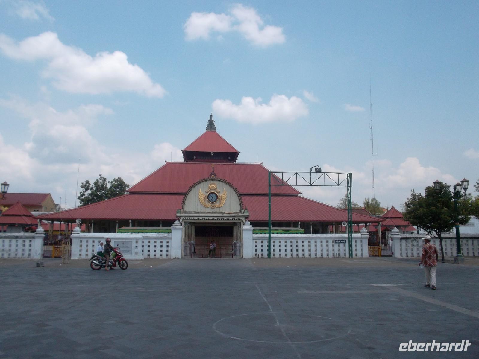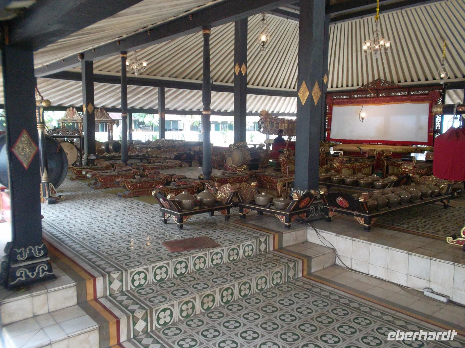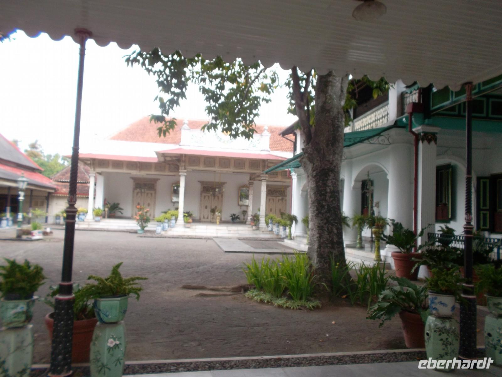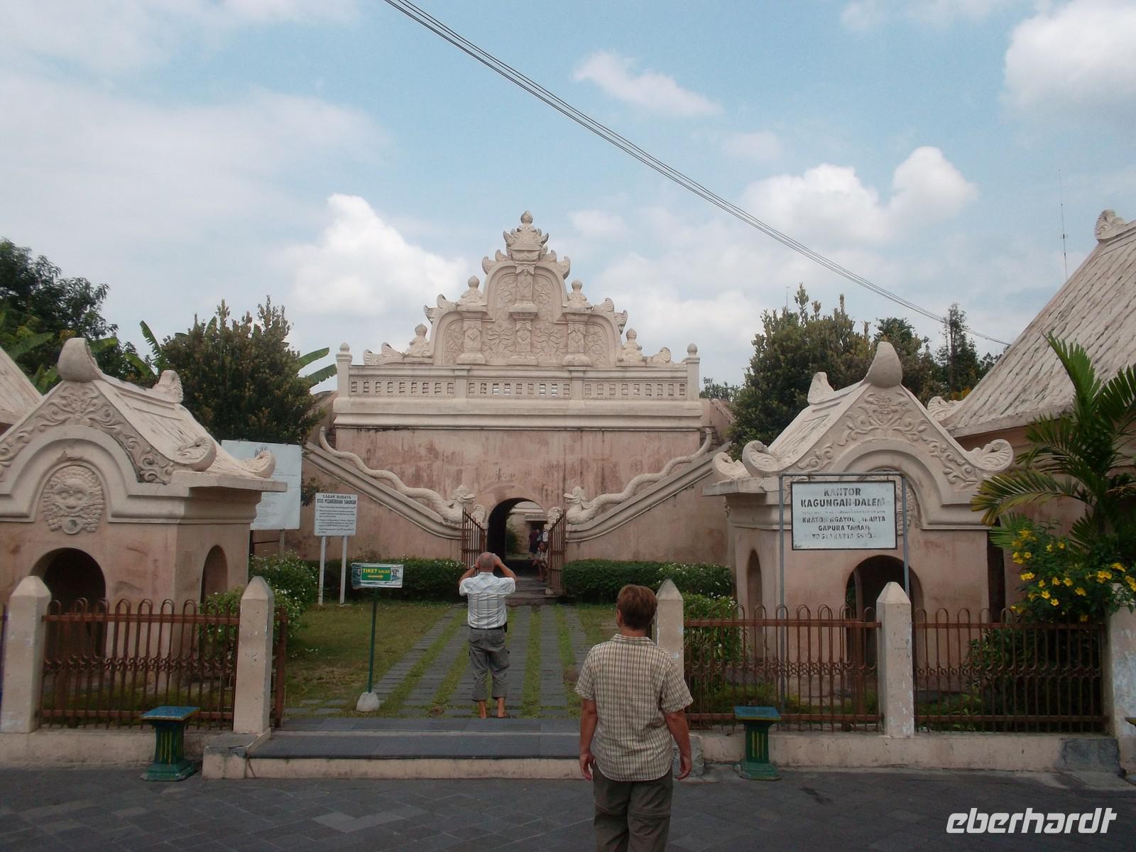 Der heutige Vormittag war der Stadt Yogjakarta gewidmet. Zusammen mit ihrer Umgebung bildet sie ein eigenes Sultanat. Heute eine der Regionen Indonesiens, war sie früher Landeshauptstadt und läßt vom einstigen Glanz noch Vieles erkennen. Das Zentrum des Sultanats bildet der Kraton (Sultanspalast): Die jahrhundertealte Palastanlage beherbergt ein Museum über traditionelle Hofszenen und entsprechende Kleidung, an Einrichtung und den typischen Verzierungen im Kraton kann man Einflüsse verschiedener Religionen auf die Kultur der Insel Java erkennen - beispielsweise Symbole und Farben von Buddhismus, Hinduismus und Islam nebeneinander. Bei einer Führung durch den Palast erläuterte uns Reiseleiter Bambang viele der Ausstellungsstücke.