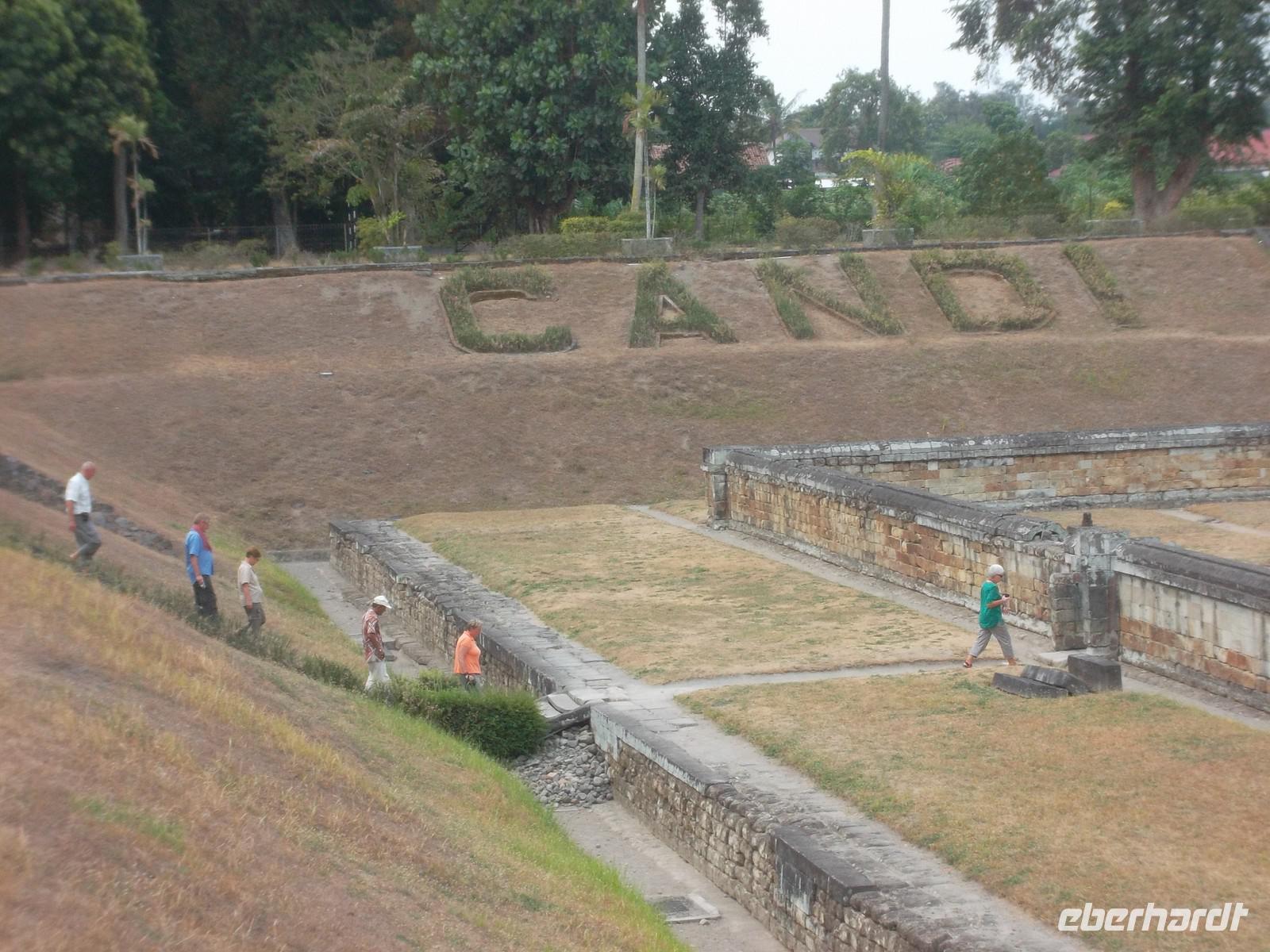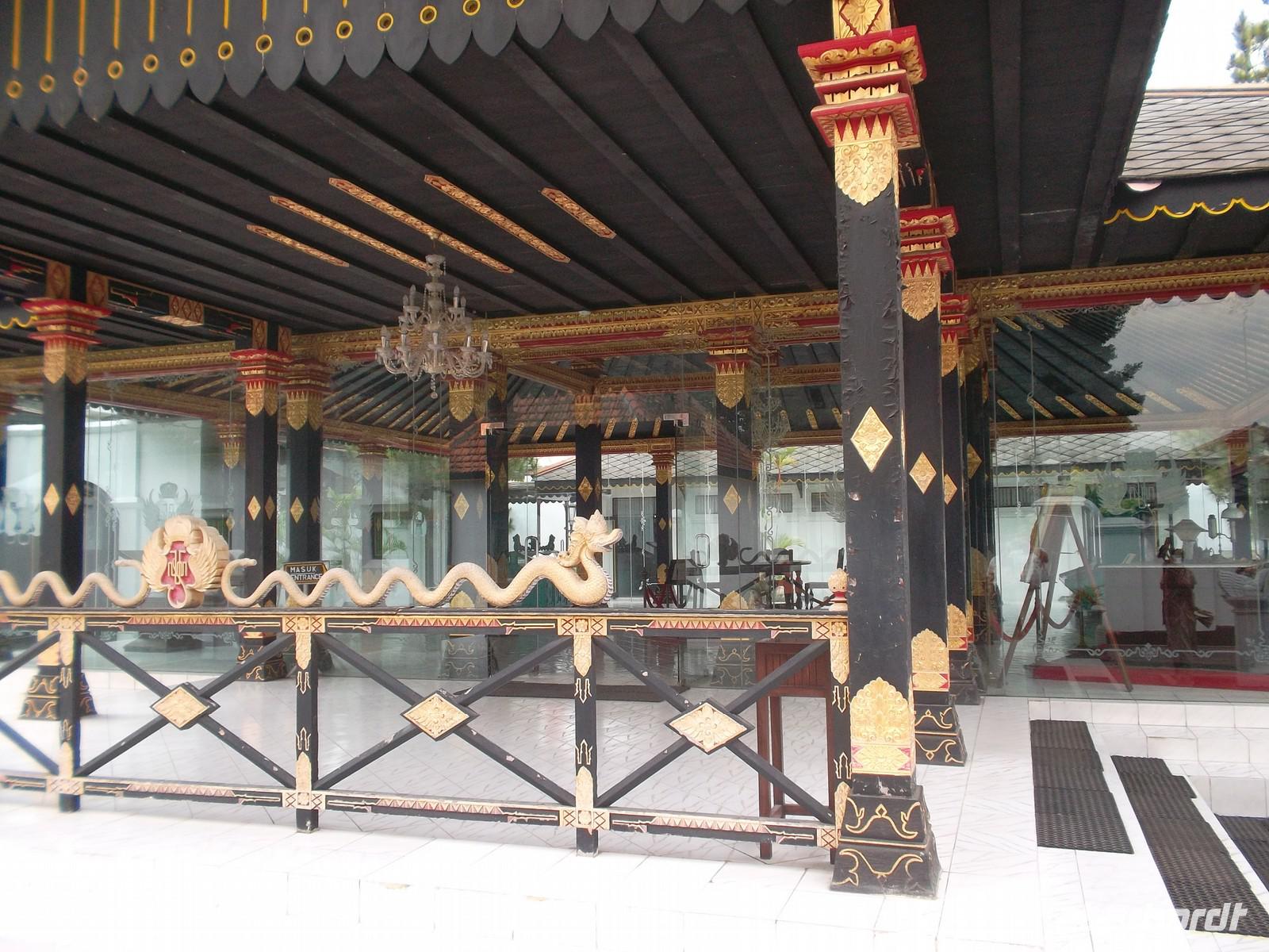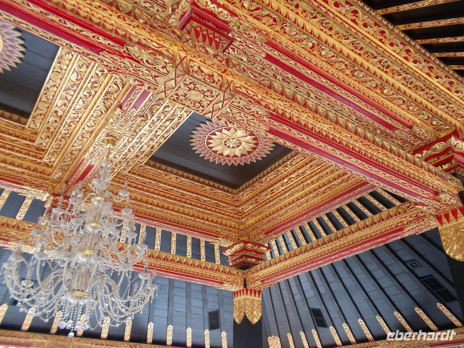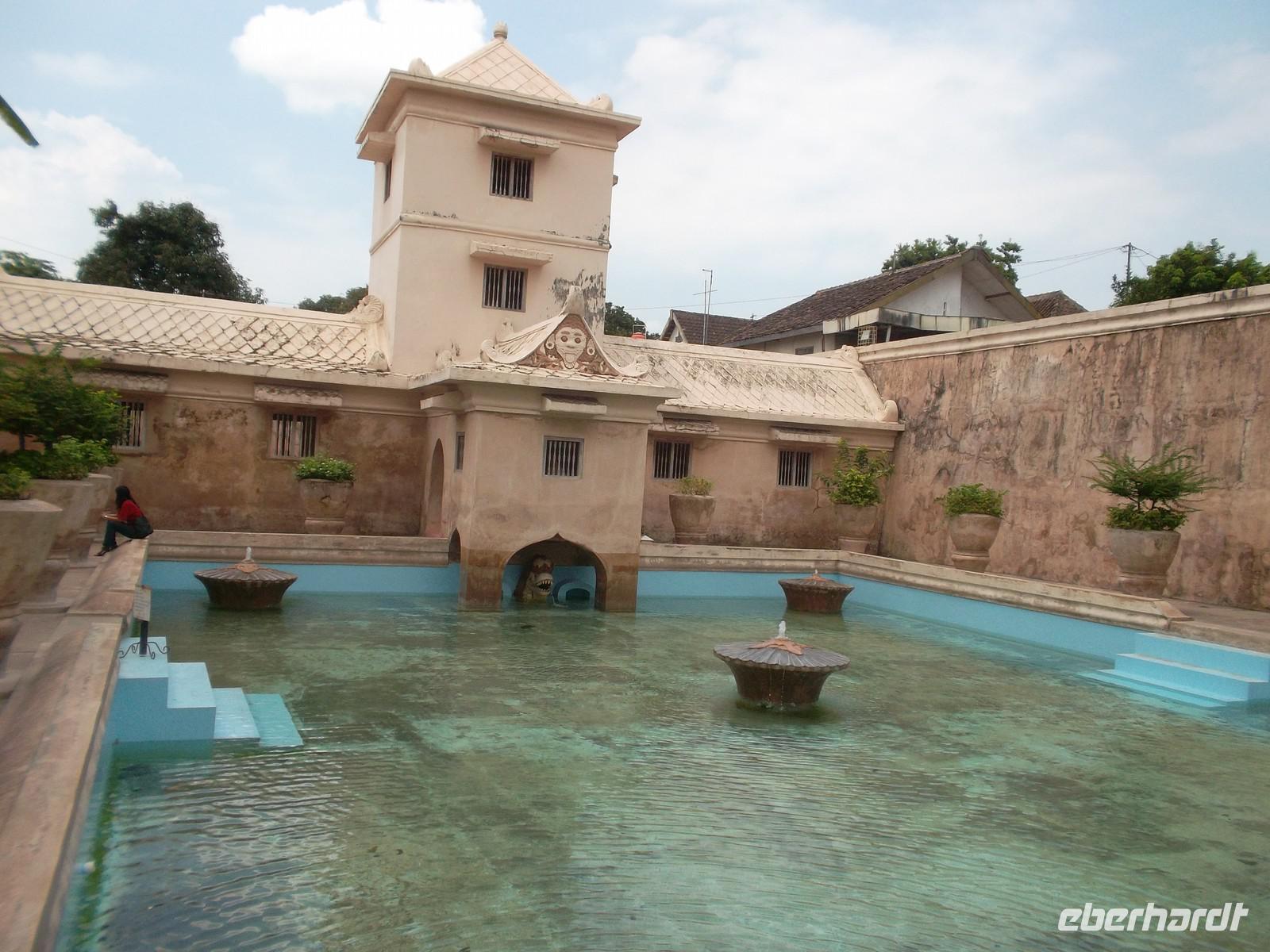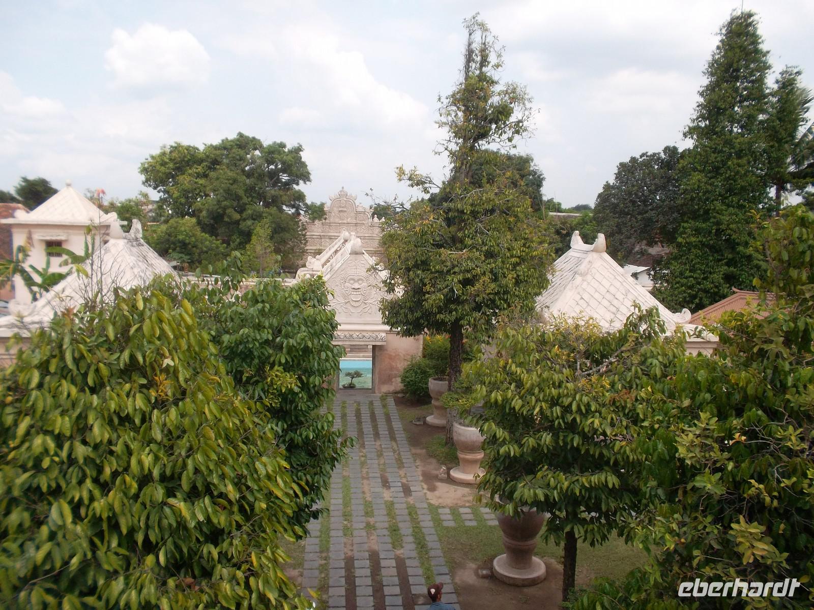 Der heutige Vormittag war der Stadt Yogjakarta gewidmet. Zusammen mit ihrer Umgebung bildet sie ein eigenes Sultanat. Heute eine der Regionen Indonesiens, war sie früher Landeshauptstadt und läßt vom einstigen Glanz noch Vieles erkennen. Das Zentrum des Sultanats bildet der Kraton (Sultanspalast): Die jahrhundertealte Palastanlage beherbergt ein Museum über traditionelle Hofszenen und entsprechende Kleidung, an Einrichtung und den typischen Verzierungen im Kraton kann man Einflüsse verschiedener Religionen auf die Kultur der Insel Java erkennen - beispielsweise Symbole und Farben von Buddhismus, Hinduismus und Islam nebeneinander. Bei einer Führung durch den Palast erläuterte uns Reiseleiter Bambang viele der Ausstellungsstücke.