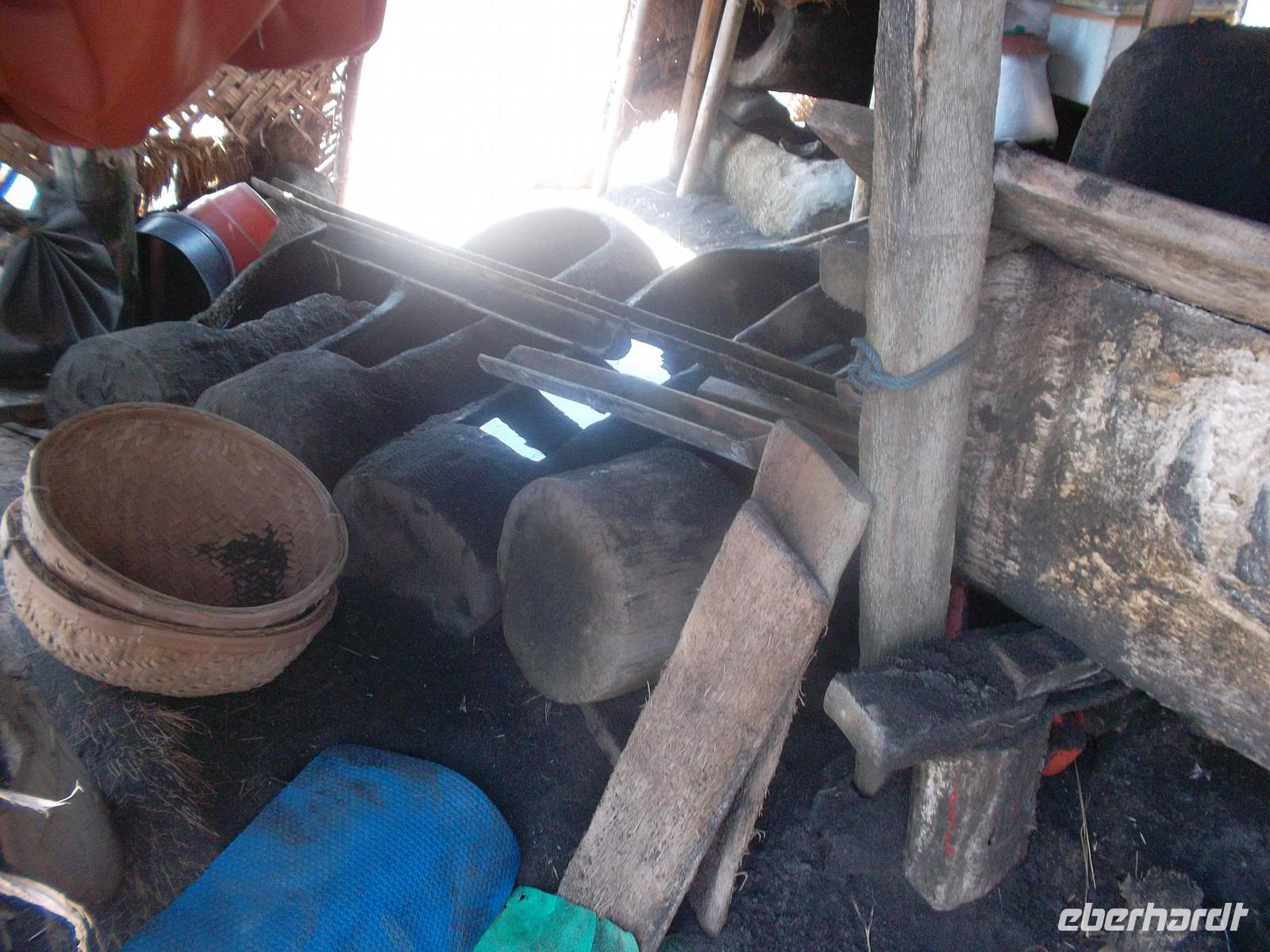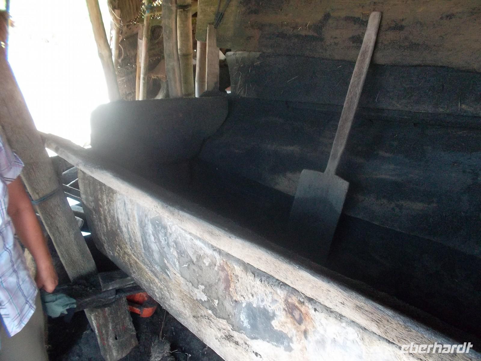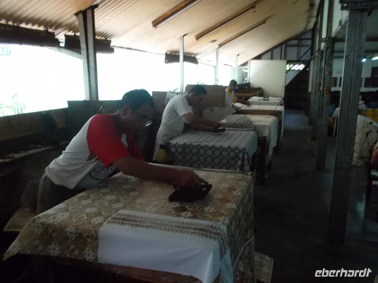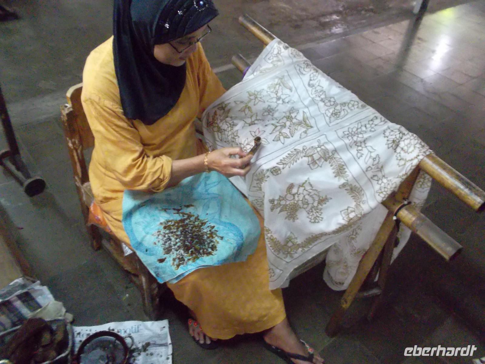 Dann fuhren wir zurück nach Yogjakarta und besuchten unterwegs noch die Werkstatt eines Silberschmiedes und abschließend eine Batikwerkstatt, wo man uns in die Geheimnisse der Farbabedeckung mit Bienenwachs und der Besonderheiten der Farbverläufe in javanischen Stoffen einführte.