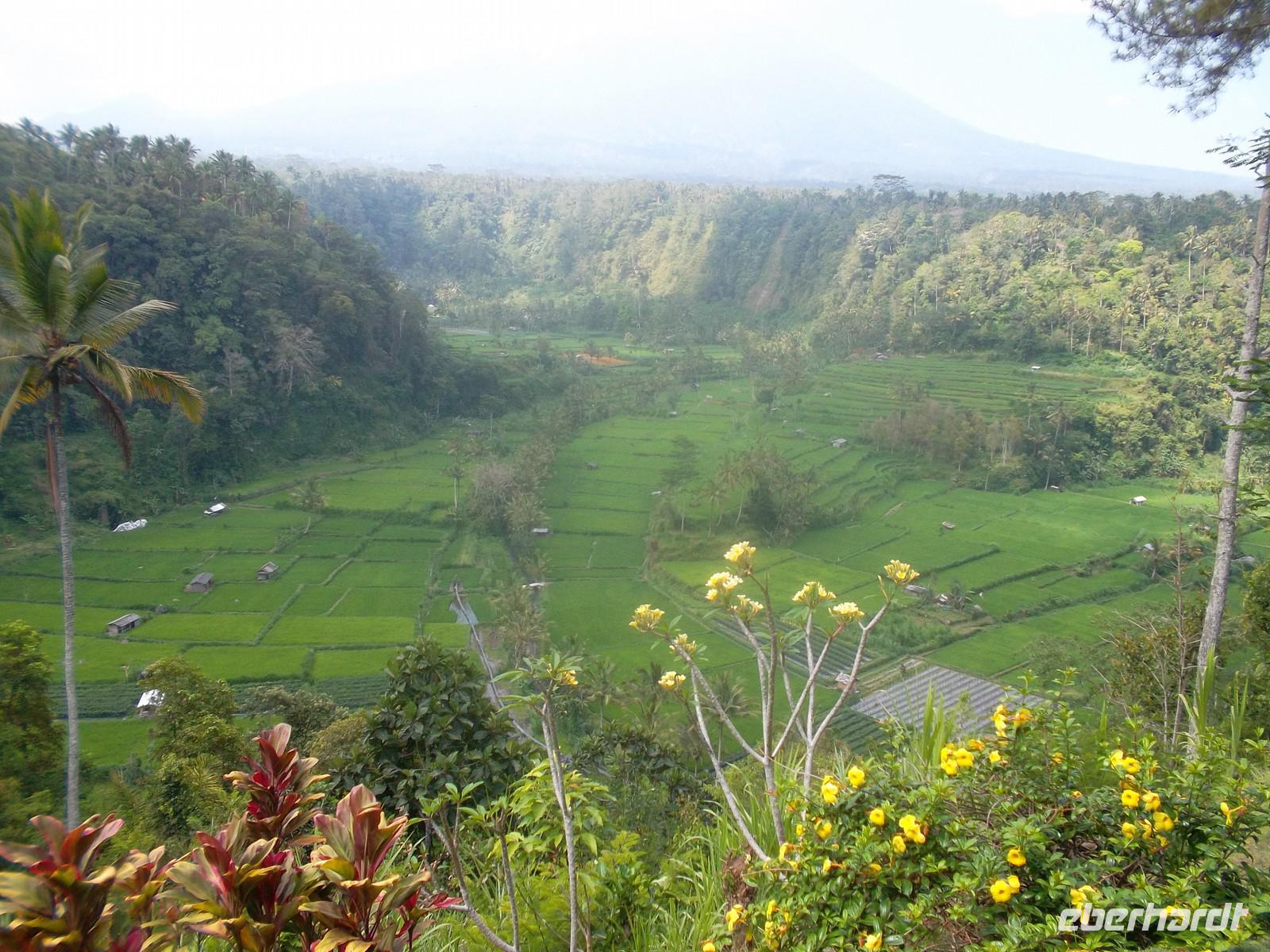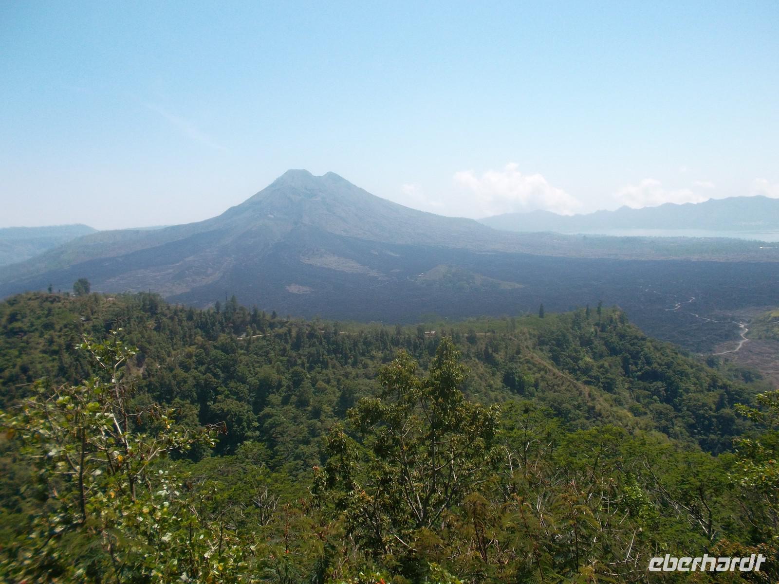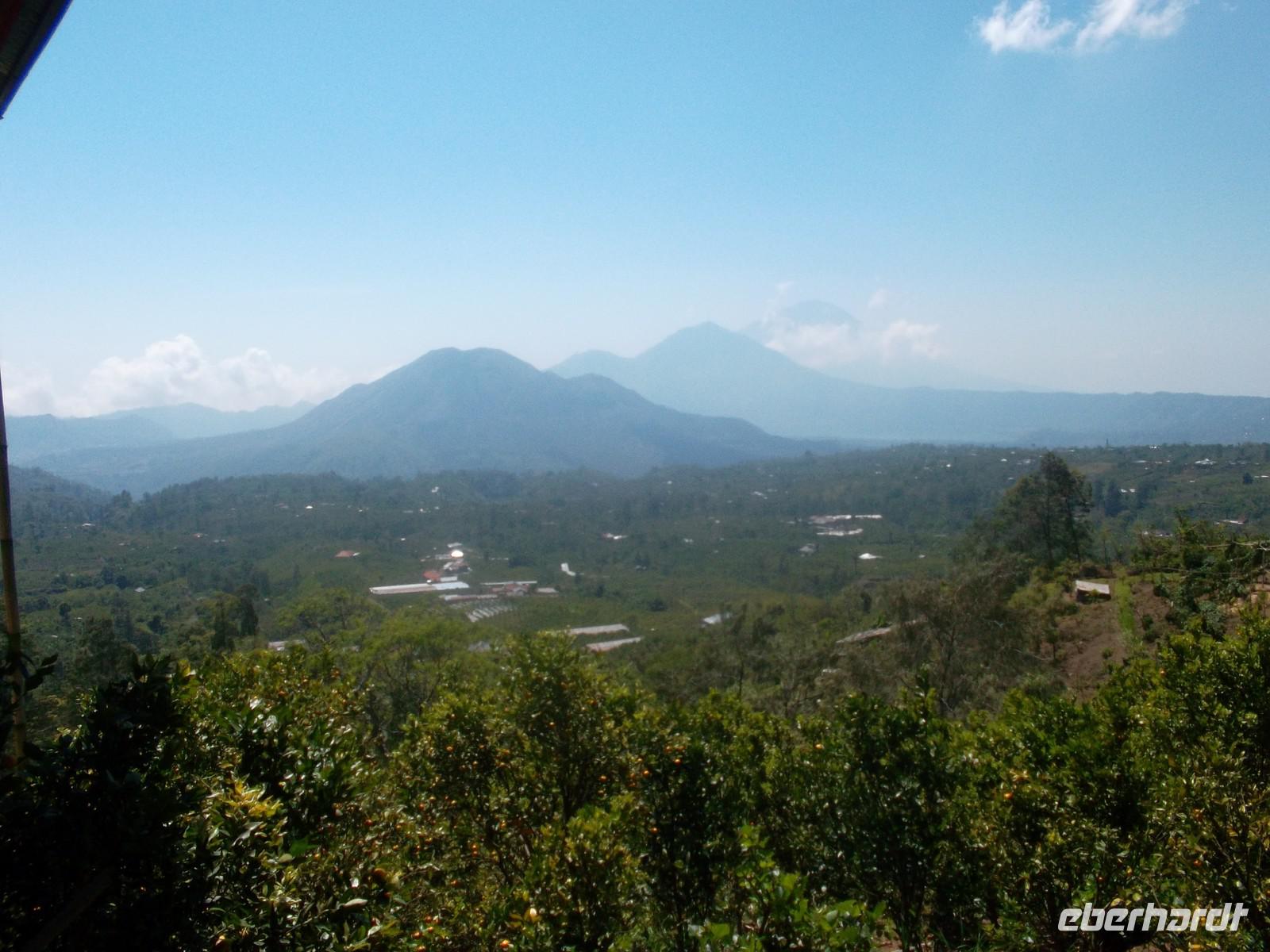 Leider mussten wir uns heute vom Puri Bagus Hotel verabschieden. Auf der Weiterreise durchquerten wir Bali erneut, die 5.561 km² große Insel mit ihren vier Millionen Einwohnern.Wie die meisten indonesischen Inseln ist auch Bali vulkanischen Ursprungs, deren ersten bedeutenden Vertreter, den Gunung Batur, wir gut sehen konnten. Der 1717 m hohe eigentlichen Batur liegt inmitten eines wesentlich größeren Vulkankraters und man kann ihn von der Höhenstraße aus gut sehen und fotografieren. Dicht dabenen liegt der Gunung Agung („Großer Berg"), mit 3.142 Meter höchster Berg der Insel und für die Balinesen der Sitz der Götter.
