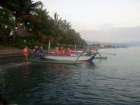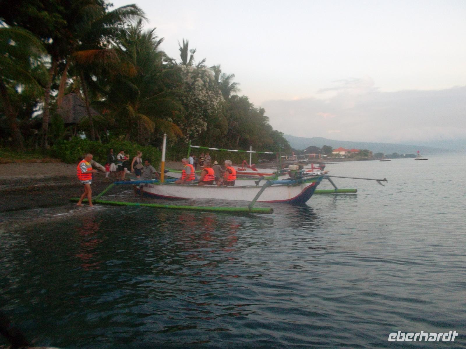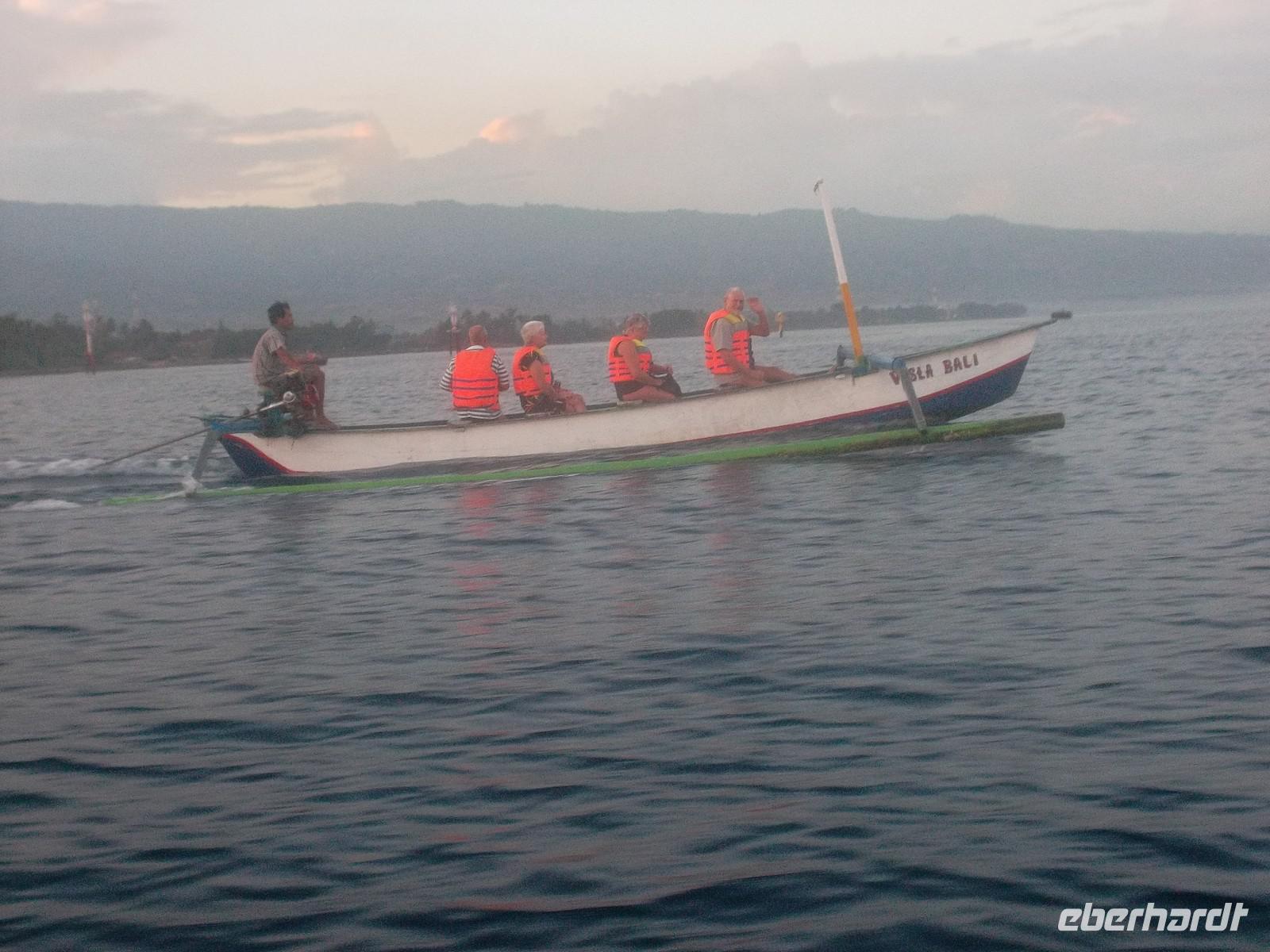Sehr früh begann der erste Punkt des heutigen Tagesprogrammes: eine Delphin-Safari. Kleine Auslegerboote für jeweils vier Personen erwarteten uns am Strand kurz vor Sonnenaufgang, in denen wir uns der Balisee anvertrauten. Kurz nachdem die Sonne über den Horizont gestiegen war, tauchten die ersten Delphinflossen auftauchten. Etwa eine halbe Stunde spürten wir dem Auftauchen der Meeressäuger nach, bevor es mit den Auslegerbooten zurück zum Strand und zum Hotel ging.