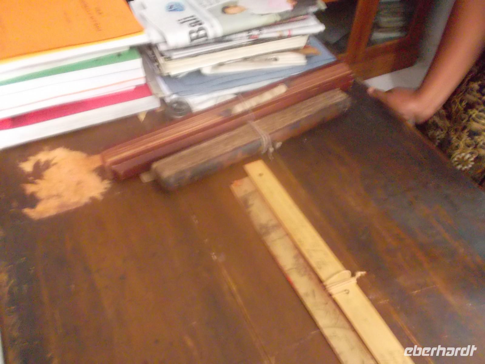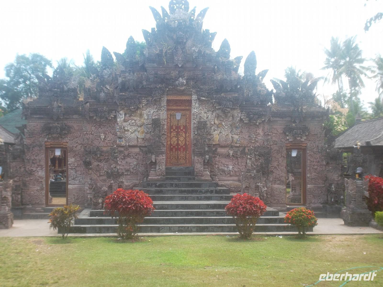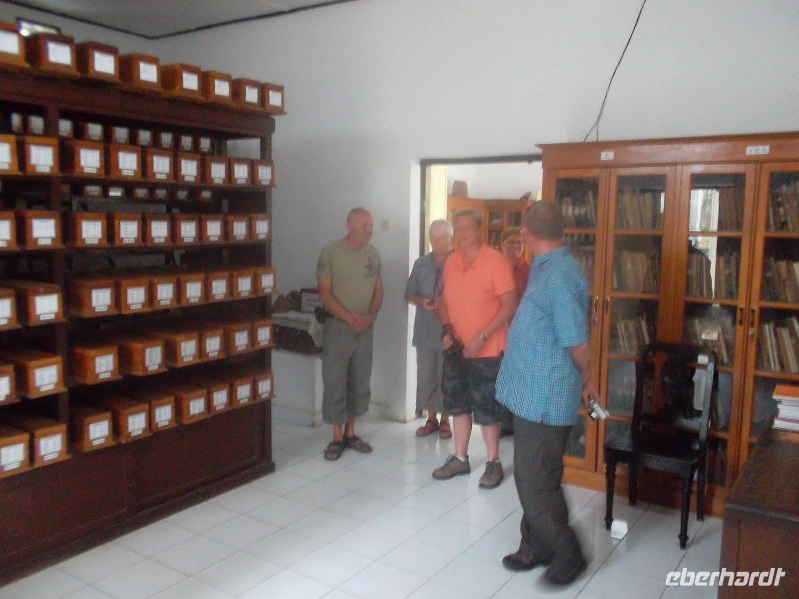 Eine Besonderheit Singarajas ist die Gedong-Bibliothek mit ihrer berühmten „Lontar-Sammlung", wohl eine der größten Palmblattbibliotheken außerhalb Indiens und Sri Lankas. Aus den Rippen der Palmwedel der Lontar-Palme werden die flachen Palmblätter geschnitten, die getrocknet und mit Einritzungen versehen, Schriftzeichen und Zeichnungen jahrhundertelang bewahren. Nachdem wir einige der in langen Holzkästen aufbewahrten Palmblattsammlungen bewundert und begutachtet hatten, verließen wir die Bibliothek und fuhren zu einem außerhalb Singarajs gelegenen Fruchtbarkeitstempel.