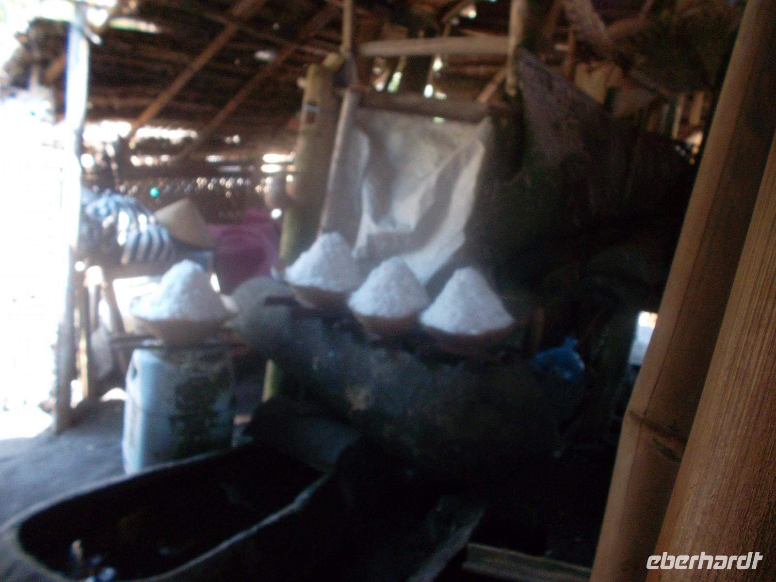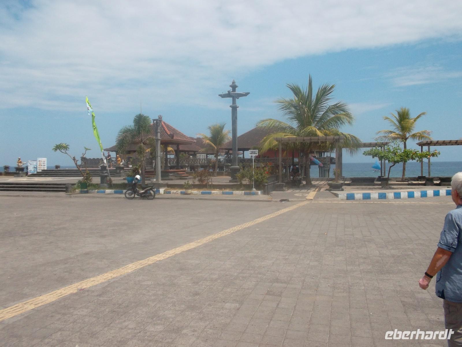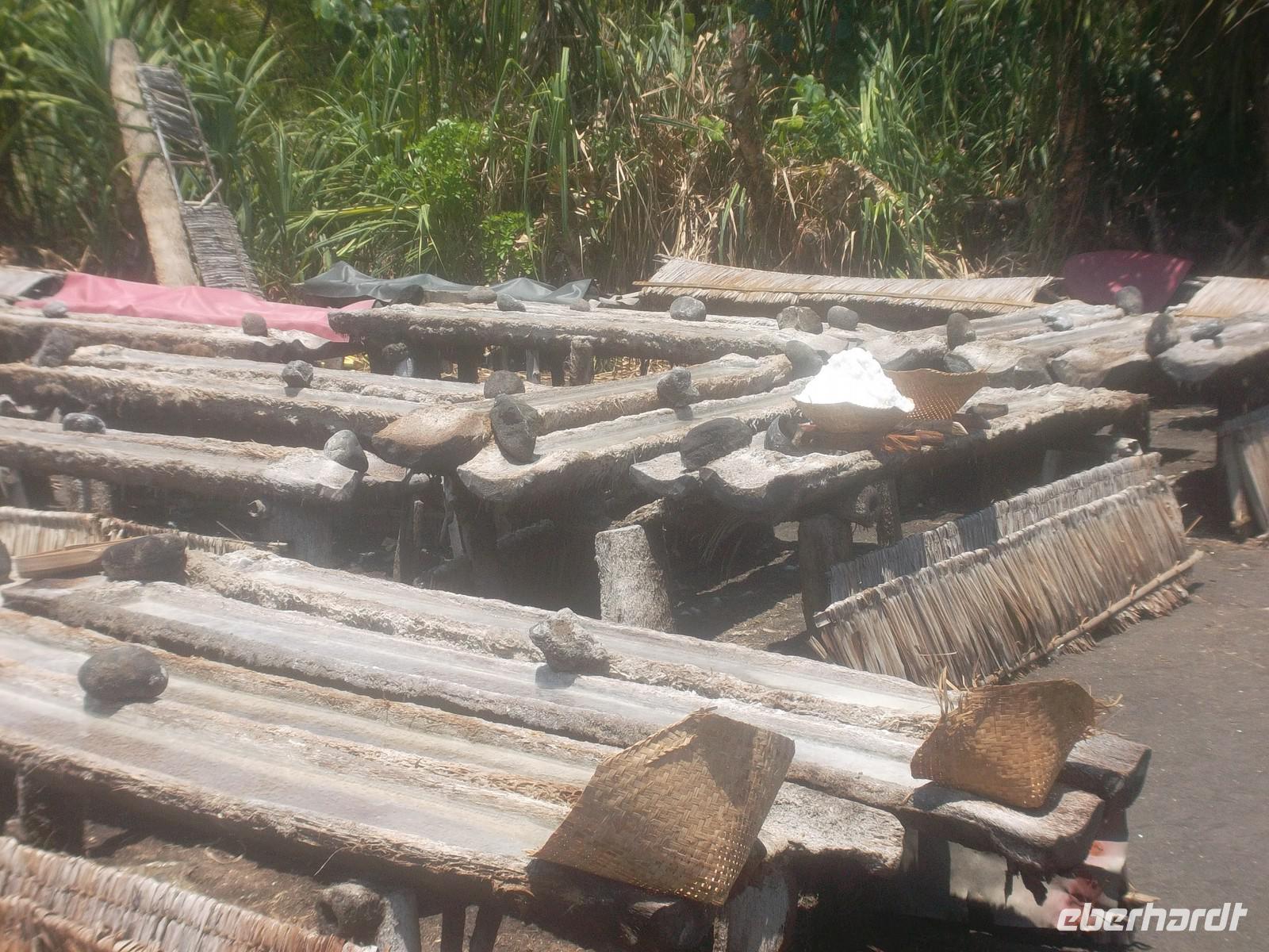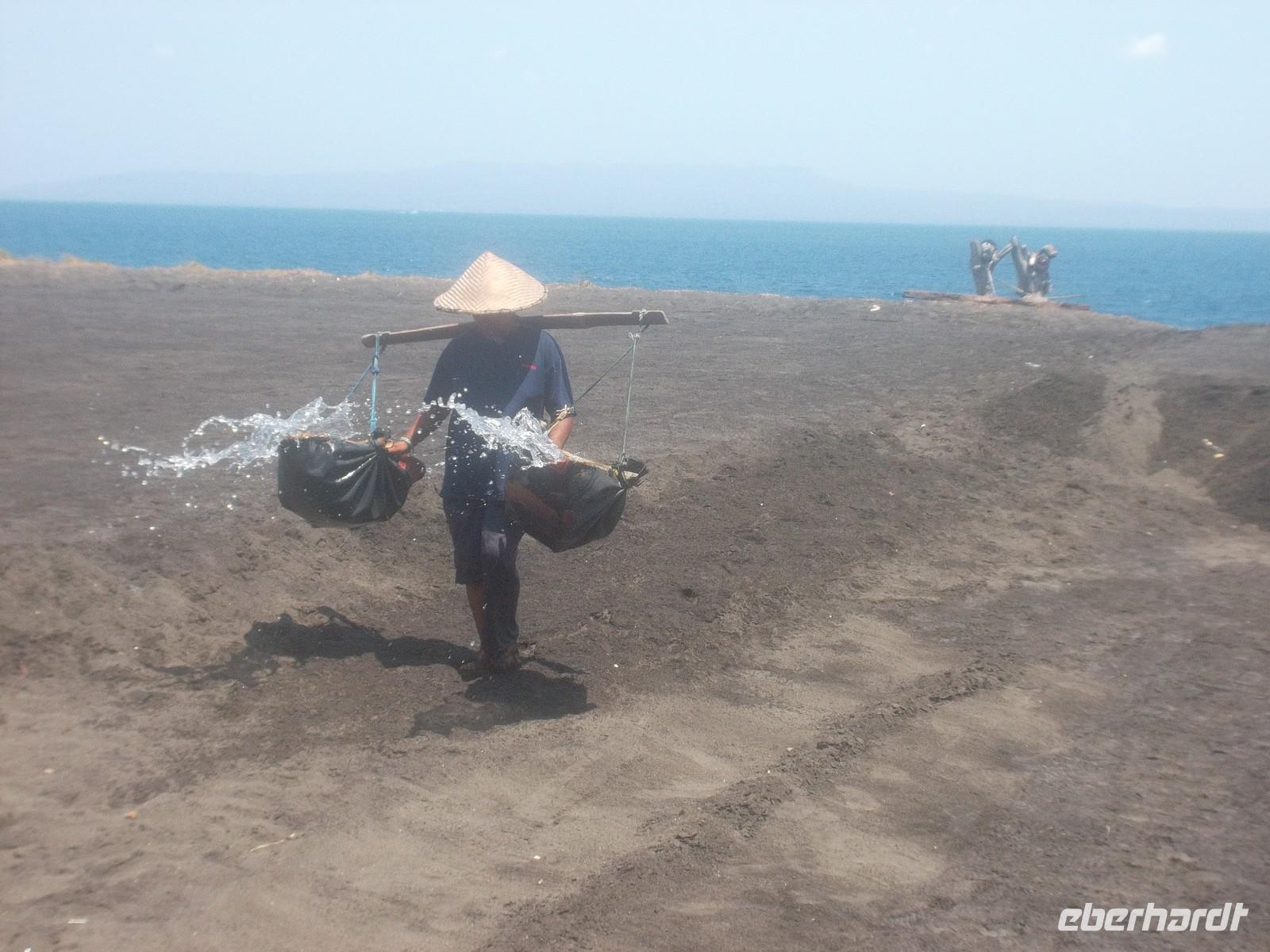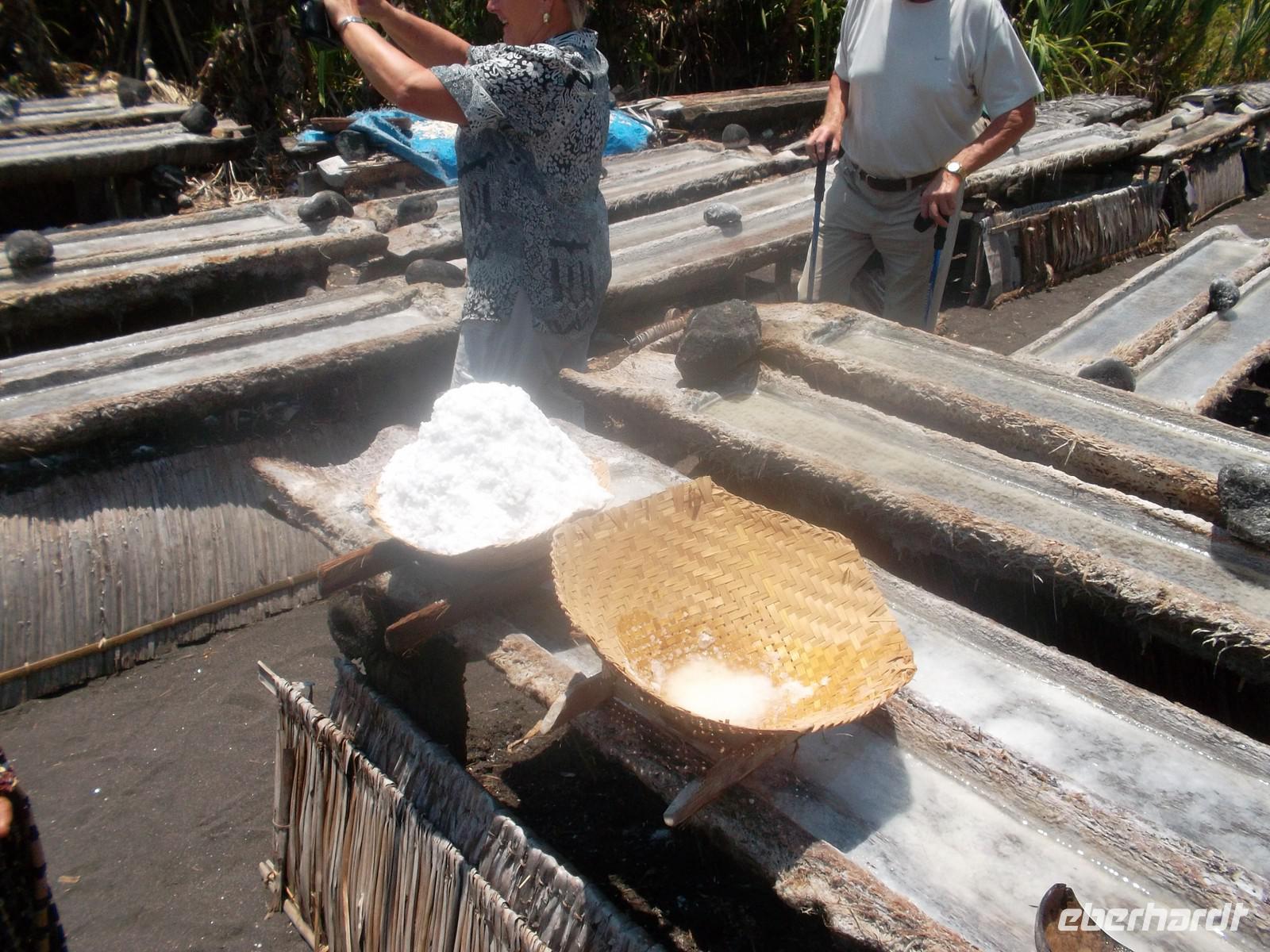 Nach Verlassen des Bali Aga Dorfes fuhren wir die Küstenstraße entlang. Ein Stopp zeigte uns eine uralte Methode der Salzgewinnung aus Meerwasser, wo angereichertes Salzwasser in Holztrögen verdunstete und schließlich den großen Strandtempel Batu Klotok. Eine gewaltige Statue des dämonischen Meeresgottes bewacht ihn.