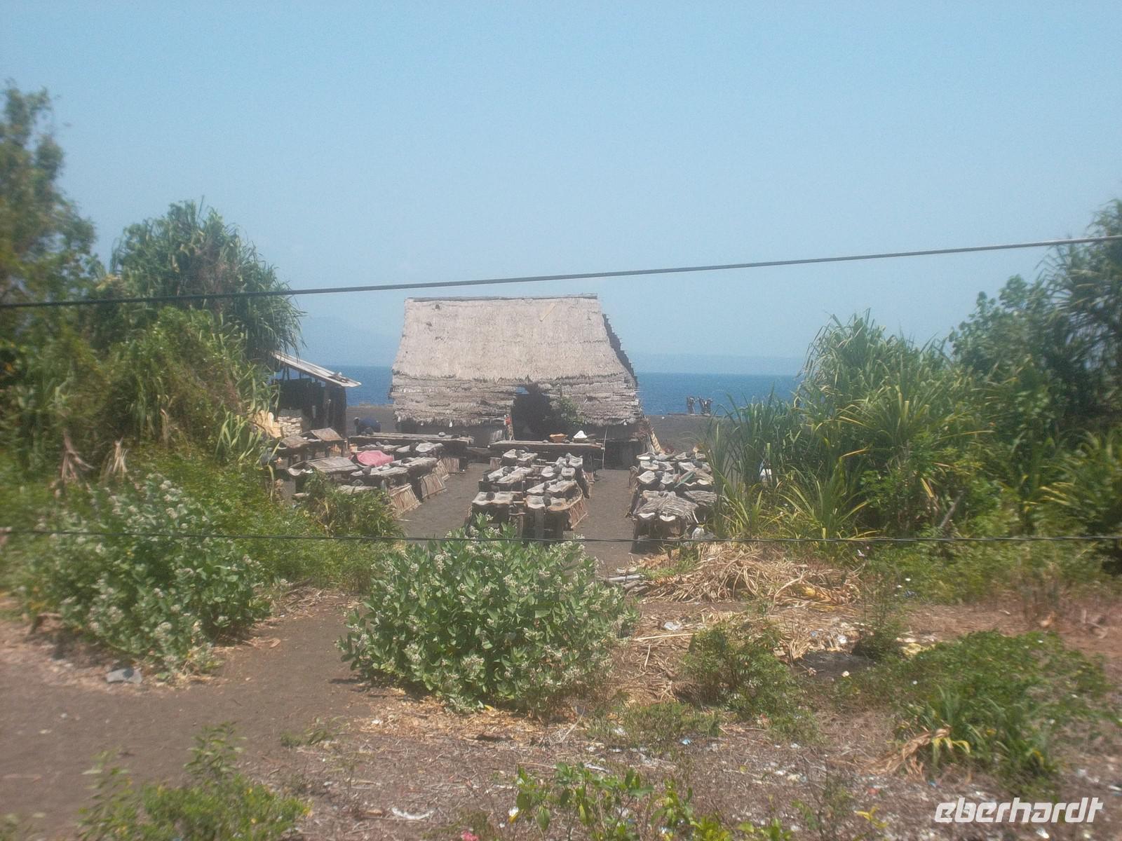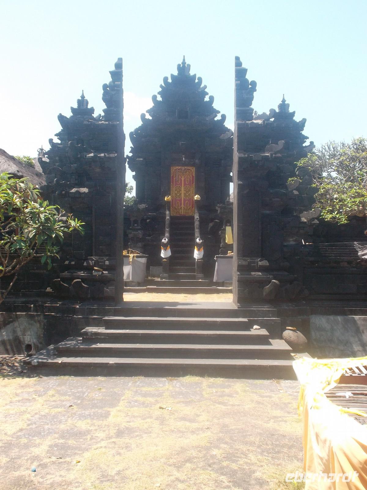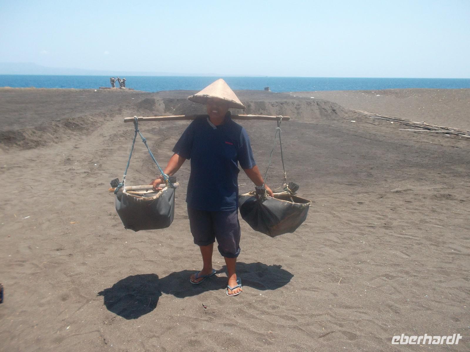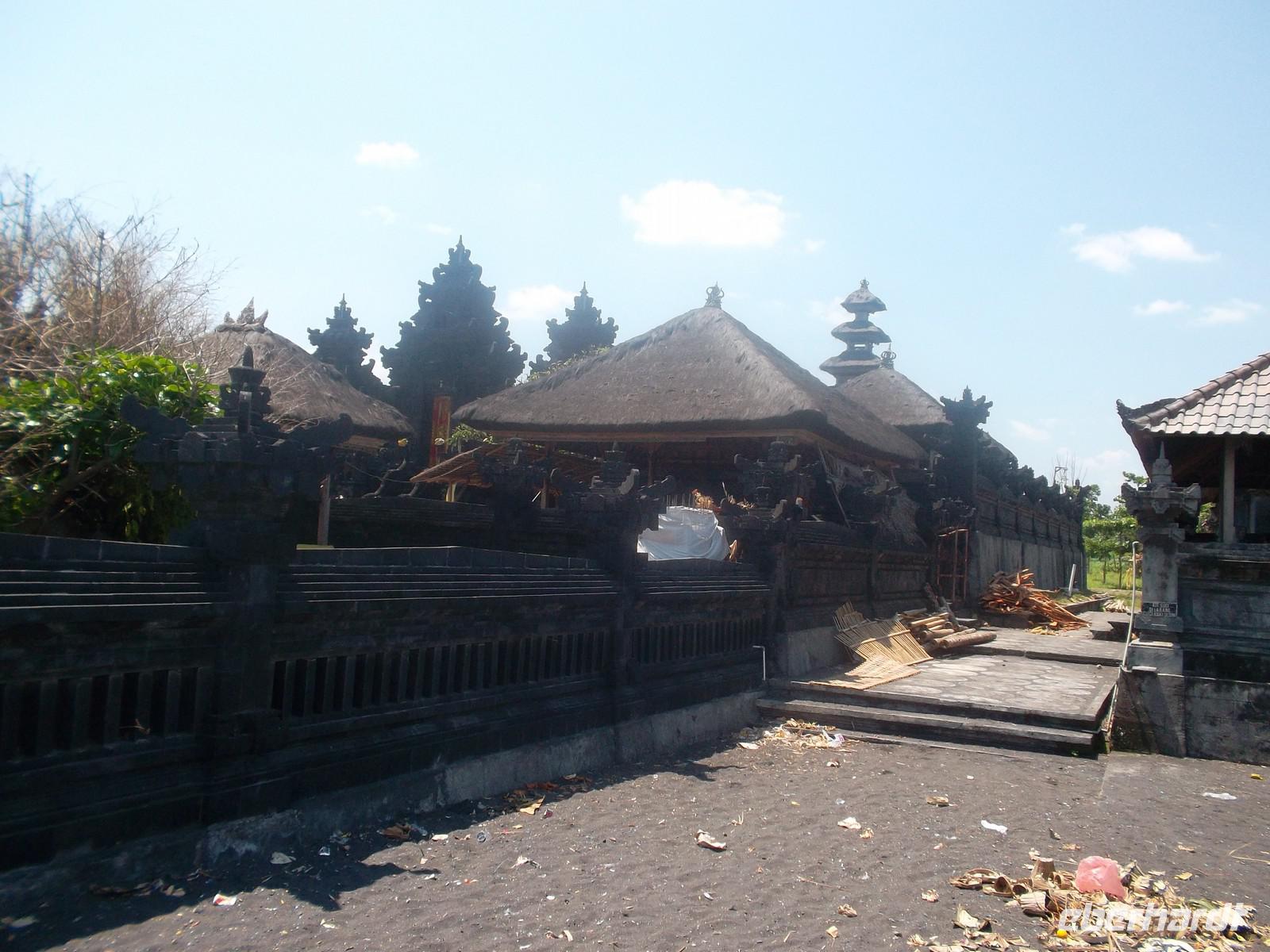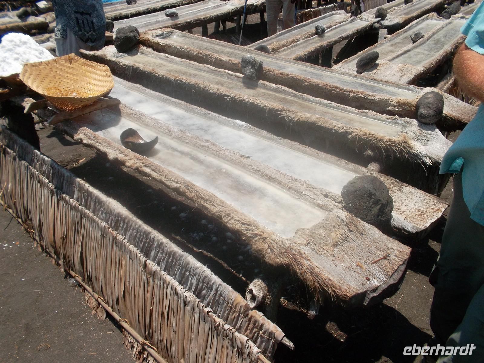 Nach Verlassen des Bali Aga Dorfes fuhren wir die Küstenstraße entlang. Ein Stopp zeigte uns eine uralte Methode der Salzgewinnung aus Meerwasser, wo angereichertes Salzwasser in Holztrögen verdunstete und schließlich den großen Strandtempel Batu Klotok. Eine gewaltige Statue des dämonischen Meeresgottes bewacht ihn.