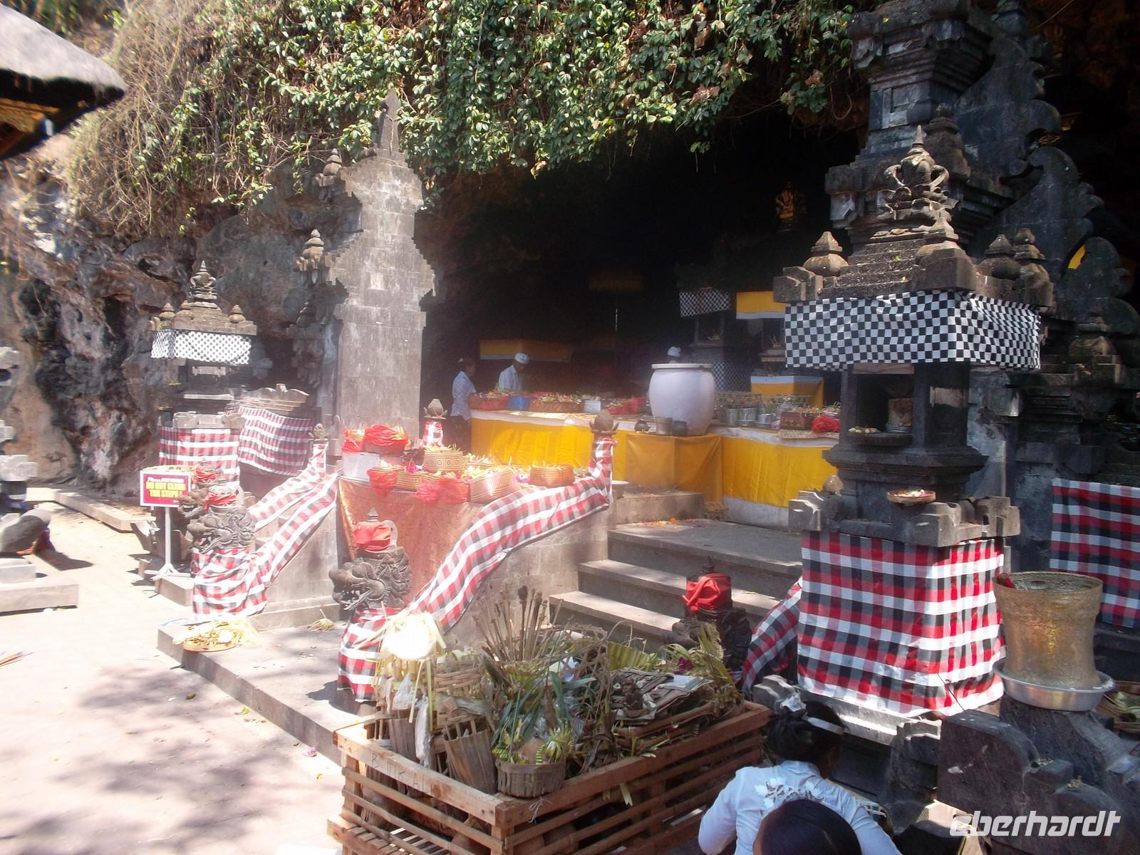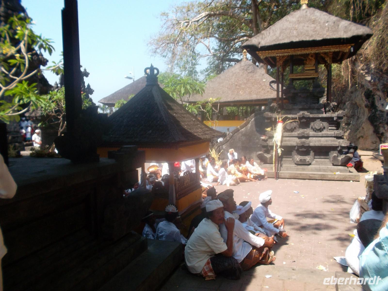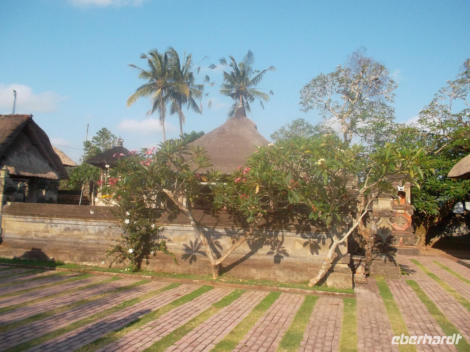 Ein interessanter Exkurs führte uns am Vormittag noch einmal in den Osten Balis, zum Goa Lawah. Dies ist einmer der bedeutendsten Tempel Balis, gelegen vor einer legendären Grotte mit zehntausenden Fledermäusen. Obwohl gerade eine Opferzeremonie stattfand, durften wir den Tempel betreten, und neben dem Allerheiligsten die heiligen Handlungen verfolgen. Dieser Tempelbesuch war wahrlich ein würdiger Abschluss unserer Reise! Es folgte der Besuch eines Bali Aga, eines traditionellen Dorfes in unveränderter Bali-Tradition. Tengganan ist ein solcher Ort, wo die Zeit stehengeblieben scheint, Die Hähne, zumeist in geflochtenen Körben gehalten, krähen auf der sonnenüberfluteten Hauptstraße, wo die Clan- und Versammlungshäuser in der Mitte stehen, während die Straße zu beiden Seiten an ihnen vorbeiläuft und die Häuser außen stehen, so dass das Dorf ein sehr langgezogenes Rechteck bildet. Hier bestimmt die Tradition u.a., dass nur die im Dorf wohnen bleiben und leben dürfen, die die alten Traditionen bewahren wollen.