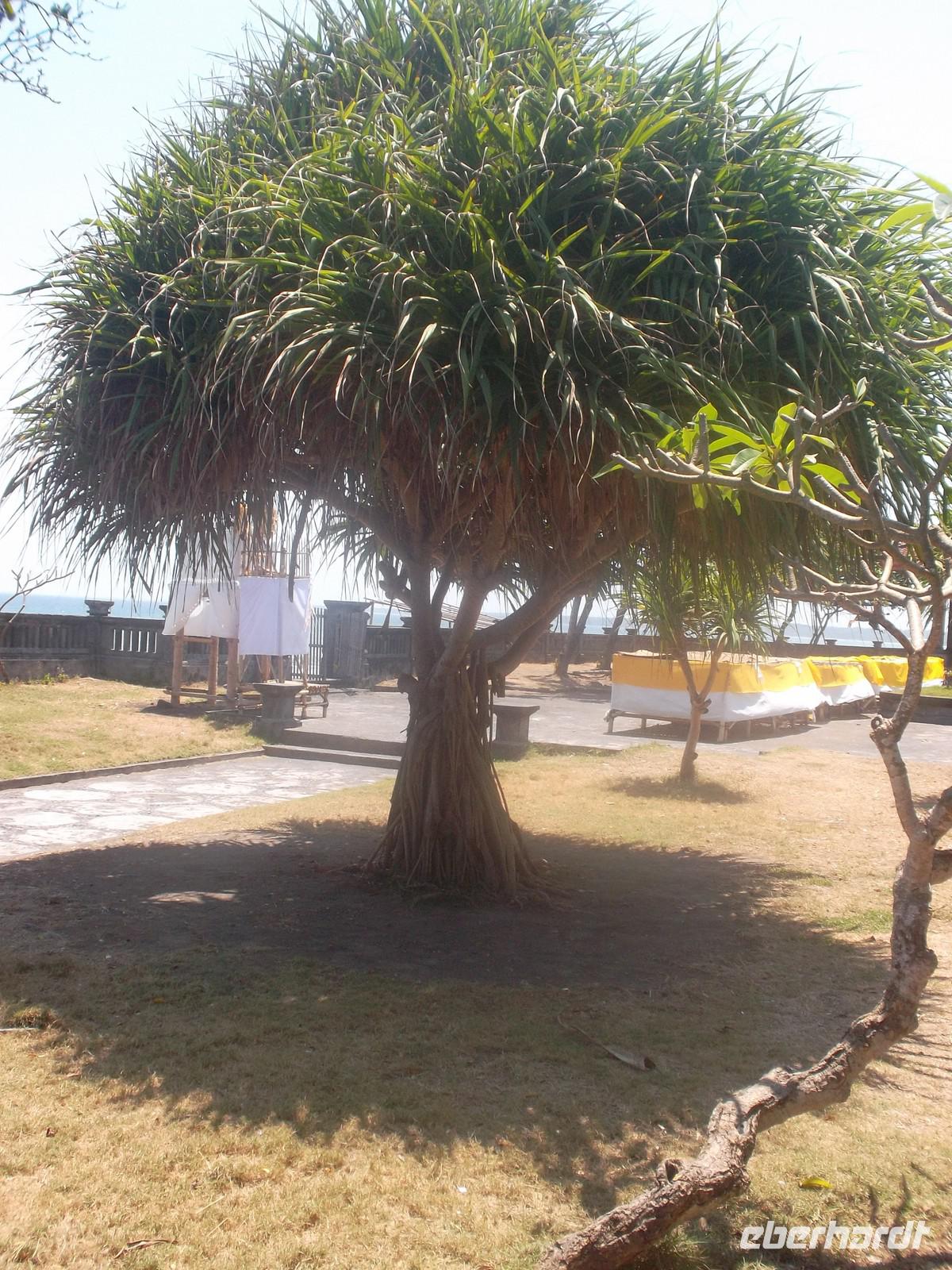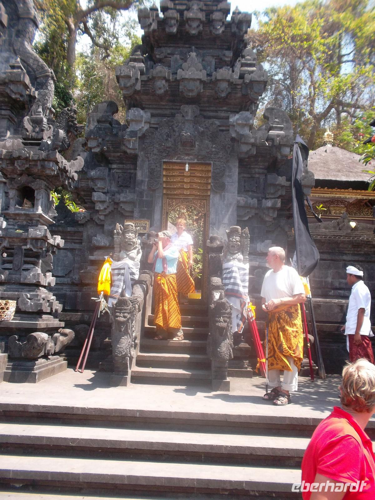 Nach der Ankunft in Denpasar begrüßte uns Reiseleiter Ketut Bhawa in der balinesischen Nationaltracht und begann gleich mit Erläuterungen zu seiner Heimatinsel. Rasch erreichten wir den Tanakh Lot Tempel - eines der schönsten Heiligtümer auf der „Insel der Götter und Dämonen. Der „Meerestempel" Tanah Lot gehört wegen seiner malerischen Lage zu den meistbesuchten und meistfotografierten Objekten auf Bali und liegt auf einer Felsspitze im Meer dicht am Ufer. Auf dem Fußweg ist Tanah Lot - ohne dabei nass zu werden - nur bei Ebbe nach einem 50 Meter langen Gang über rundgewaschene Steine und feinen dunklen Sand zu erreichen. Der innere Hof ist Gläubigen vorbehalten - hier reihen sich die mehrstöckigen, pagodenähnlichen Schreine. Der Zugang ist prinzipiell auch bei Flut möglich, wenn Tanah Lot seinen eigentlichen Inselcharakter erlangt, weil es dann komplett vom Wasser umspült ist.