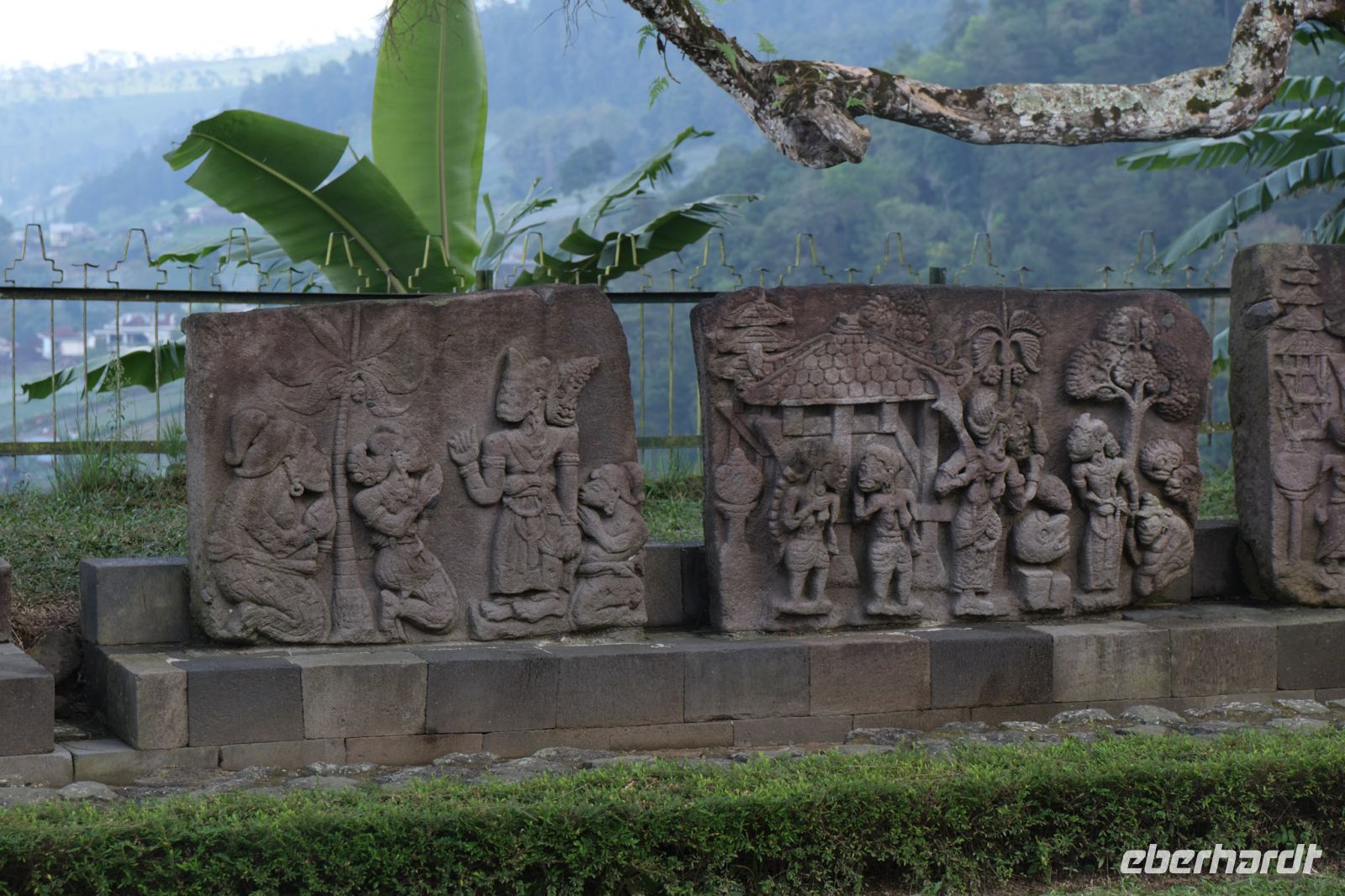 Auf dem Rückweg ins Tal machten wir Halt am Sukuh-Tempel, auch bekannt als der „Erotiktempel“. Seine pyramidenartige Form erinnert an die Bauweise der Maya, und er unterscheidet sich deutlich von den sonst typischen javanischen Tempeln. Der Tempel ist der Fruchtbarkeit gewidmet und zeigt zahlreiche Reliefs und Figuren mit symbolischer, teils obszöner Darstellung – ein wahrlich einzigartiger Anblick.