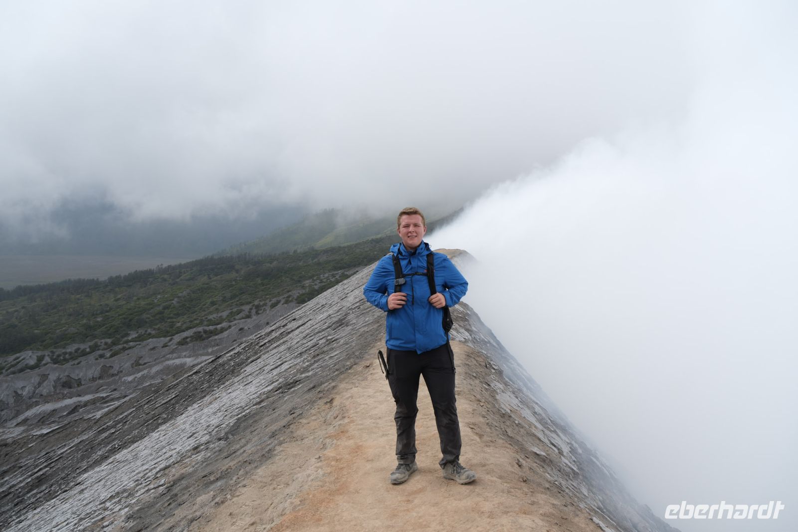 Wie geplant fuhren wir weiter in die gewaltige Vulkan-Caldera. Nach mehreren Fotostopps erreichten wir schließlich den Ausgangspunkt des Treppenaufgangs zum Bromo-Vulkan. Gemeinsam mit einigen Teilnehmern machte ich mich auf den Weg – etwa 300 Stufen führten hinauf bis zum Kraterrand. Oben angekommen, bot sich uns ein faszinierender Blick in das Innere eines aktiven Vulkans.