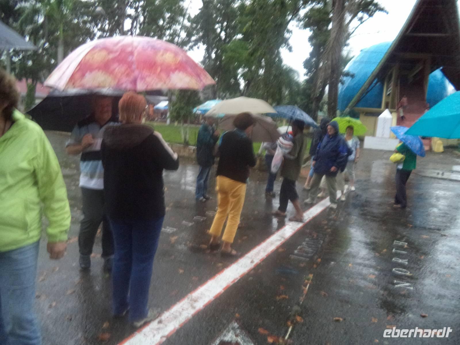 Später führte ein Spaziergang zum Aek Sijornih-Wasserfall über eine abenteuerliche Hängebrücke zum beginnenden Ausbau als Naherholungszentrum. Nach etwas Freizeit hier konnten wir gleich noch eine staatliche Schule besuchen. Wir begeisterten als „exotische" Besucher die Schüler (und brachten wohl deren Unterricht gehörig durcheinander), wurden aber von den Lehrerinnen sehr freundlich empfangen und von den Kinder emphatisch begrüßt, die uns sodann voller Inbrunst die indonesische Nationalhymne vorsangen. Ein weiterer Stopp in Rimbo Panti am Regenwald Resort führte uns bei strömendem Regen auf  einem kleinen Spazierweg zu einer heißen Quelle und dann durch ein winziges Stück Dschungel. Der letzte große Höhepunkt erwartete uns dann jedoch - leider immer noch bei starkem Regen - in Bonjol. Kurz vor dem Dunkelwerden erreichten wir den Äquator, die gedachte Linie, die die Erde in eine Nord- und eine Südhalbkugel trennt. Knapp zwei Autostunden nördlich von unserem Tagesziel Bukit-Tinggi überschritten wir den Äquator von der Nord- in Richtung Südhalbkugel. Reiseleiterin Linda hatte für alle ein entsprechendes Zertifikat vorbereitet um das Ereignis zu dokumentieren - und sie hatte jungen Palmwein besorgt, um das Ereignis zu begießen. Zugegeben - er schmeckt durchaus gewöhnungsbedürftig - und das lag weder am Regen noch am Äquator.